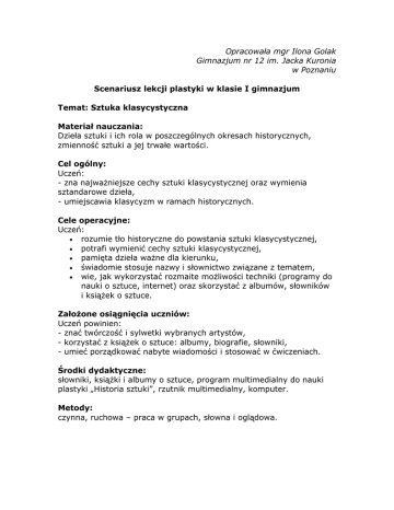 Opracowała mgr Ilona Golak Gimnazjum nr 12 im. Jacka Kuronia w Poznaniu Scenariusz lekcji plastyki w klasie I gimnazjum Temat: Sztuka klasycystyczna Materiał nauczania: Dzieła sztuki i ich rola w poszczególnych okresach historycznych, zmienność sztuki a jej trwałe wartości. Cel ogólny: Uczeń: - zna najważniejsze cechy sztuki klasycystycznej oraz wymienia sztandarowe dzieła, - umiejscawia klasycyzm w ramach historycznych. Cele operacyjne: Uczeń: • rozumie tło historyczne do powstania sztuki klasycystycznej, • potrafi wymienić cechy sztuki klasycystycznej, • pamięta dzieła ważne dla kierunku, • świadomie stosuje nazwy i słownictwo związane z tematem, • wie, jak wykorzystać rozmaite możliwości techniki (programy do nauki o sztuce, internet) oraz skorzystać z albumów, słowników i książek o sztuce. Założone osiągnięcia uczniów: Uczeń powinien: - znać twórczość i sylwetki wybranych artystów, - korzystać z książek o sztuce: albumy, biografie, słowniki, - umieć porządkować nabyte wiadomości i stosować w ćwiczeniach. Środki dydaktyczne: słowniki, książki i albumy o sztuce, program multimedialny do nauki plastyki „Historia sztuki”, rzutnik multimedialny, komputer. Metody: czynna, ruchowa – praca w grupach, słowna i oglądowa. Przebieg lekcji 1. Korzystając ze słowników i encyklopedii sztuki, uczniowie wyjaśniają pojęcie „sztuka klasycystyczna”. 2. Poznanie związków klasycyzmu ze sztuką antyczną – na podstawie książek i albumów o sztuce. 3. Cechy charakterystyczne architektury klasycystycznej na podstawie programu multimedialnego z historii sztuki (I grupa) oraz przykłady dzieł architektonicznych (II grupa). Uczniowie oglądają przykłady architektury na rzutniku multimedialnym i wyszukują odpowiednie nazwy i słownictwo. Później prezentują sobie zdobyte wiadomości. 4. Uczniowie zapoznają się z rzeźbą klasycystyczną i jej przedstawicielami – przykłady z programu „Historia sztuki”, a później dopasowują nazwiska do tytułów rzeźb w przygotowanym przez nauczyciela ćwiczeniu (praca samodzielna ucznia). 5. Poznanie malarstwa epoki – wynotowanie nazwisk malarzy i tytułów ich obrazów w czasie oglądania dzieł na rzutniku multimedialnym. Podział na grupy i próba odtworzenia scen z wybranych obrazów – inne grupy zgadują, jaka to scena i z jakiego obrazu pochodzi. 6. Podsumowanie: tło historyczne, cechy sztuki, słownictwo.