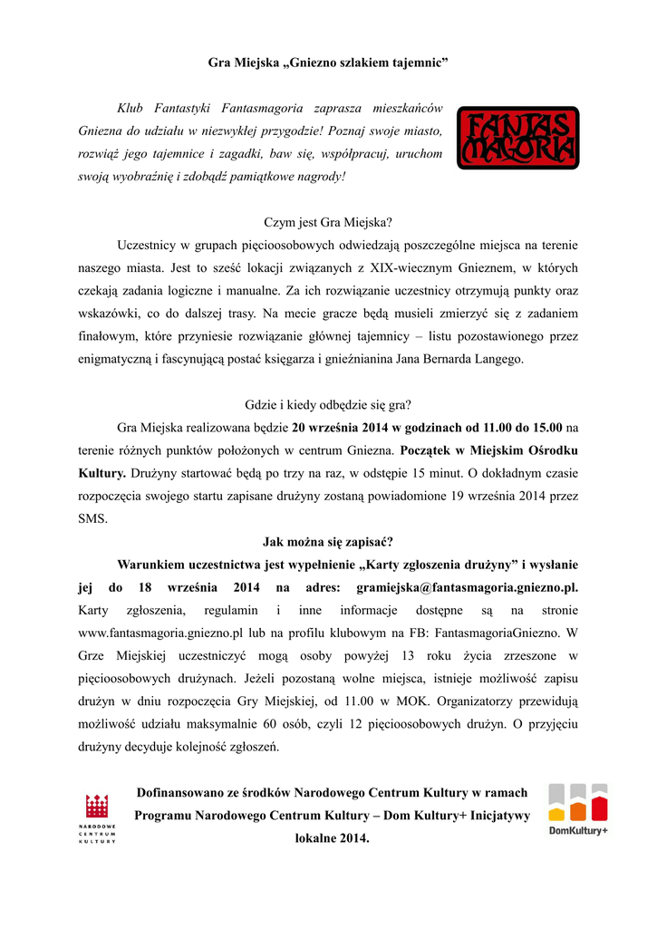 Gra Miejska „Gniezno szlakiem tajemnic” Klub Fantastyki Fantasmagoria zaprasza mieszkańców Gniezna do udziału w niezwykłej przygodzie! Poznaj swoje miasto, rozwiąż jego tajemnice i zagadki, baw się, współpracuj, uruchom swoją wyobraźnię i zdobądź pamiątkowe nagrody! Czym jest Gra Miejska? Uczestnicy w grupach pięcioosobowych odwiedzają poszczególne miejsca na terenie naszego miasta. Jest to sześć lokacji związanych z XIX-wiecznym Gnieznem, w których czekają zadania logiczne i manualne. Za ich rozwiązanie uczestnicy otrzymują punkty oraz wskazówki, co do dalszej trasy. Na mecie gracze będą musieli zmierzyć się z zadaniem finałowym, które przyniesie rozwiązanie głównej tajemnicy – listu pozostawionego przez enigmatyczną i fascynującą postać księgarza i gnieźnianina Jana Bernarda Langego. Gdzie i kiedy odbędzie się gra? Gra Miejska realizowana będzie 20 września 2014 w godzinach od 11.00 do 15.00 na terenie różnych punktów położonych w centrum Gniezna. Początek w Miejskim Ośrodku Kultury. Drużyny startować będą po trzy na raz, w odstępie 15 minut. O dokładnym czasie rozpoczęcia swojego startu zapisane drużyny zostaną powiadomione 19 września 2014 przez SMS. Jak można się zapisać? Warunkiem uczestnictwa jest wypełnienie „Karty zgłoszenia drużyny” i wysłanie jej Karty do 18 września zgłoszenia, 2014 regulamin na i adres: inne [email protected]. informacje dostępne są na stronie www.fantasmagoria.gniezno.pl lub na profilu klubowym na FB: FantasmagoriaGniezno. W Grze Miejskiej uczestniczyć mogą osoby powyżej 13 roku życia zrzeszone w pięcioosobowych drużynach. Jeżeli pozostaną wolne miejsca, istnieje możliwość zapisu drużyn w dniu rozpoczęcia Gry Miejskiej, od 11.00 w MOK. Organizatorzy przewidują możliwość udziału maksymalnie 60 osób, czyli 12 pięcioosobowych drużyn. O przyjęciu drużyny decyduje kolejność zgłoszeń. Dofinansowano ze środków Narodowego Centrum Kultury w ramach Programu Narodowego Centrum Kultury – Dom Kultury+ Inicjatywy lokalne 2014.