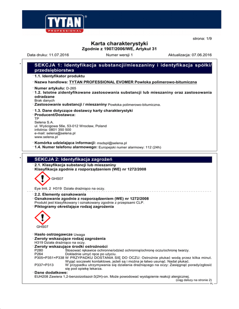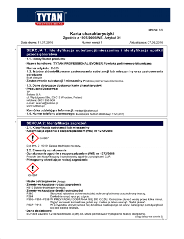 43.0 strona: 1/9 Karta charakterystyki Zgodnie z 1907/2006/WE, Artykuł 31 Data druku: 11.07.2016 * Numer wersji 1 Aktualizacja: 07.06.2016 SEKCJA 1: Identyfikacja substancji/mieszaniny i identyfikacja spółki/ przedsiębiorstwa · 1.1. Identyfikator produktu · Nazwa handlowa: TYTAN PROFESSIONAL EVOMER Powłoka polimerowo-bitumiczna · Numer artykułu: D-265 · 1.2. Istotne zidentyfikowane zastosowania substancji lub mieszaniny oraz zastosowania odradzane Brak danych · Zastosowanie substancji / mieszaniny Powłoka polimerowo-bitumiczna. · 1.3. Dane dotyczące dostawcy karty charakterystyki · Producent/Dostawca: TP Selena S.A. ul. Wyścigowa 56e, 53-012 Wrocław, Poland infolinia: 0801 350 500 e-mail: [email protected] www.selena.pl · Komórka udzielająca informacji: [email protected] · 1.4. Numer telefonu alarmowego: Europejski numer alarmowy: 112 (24h) * SEKCJA 2: Identyfikacja zagrożeń · 2.1. Klasyfikacja substancji lub mieszaniny · Klasyfikacja zgodnie z rozporządzeniem (WE) nr 1272/2008 GHS07 Eye Irrit. 2 H319 Działa drażniąco na oczy. · 2.2. Elementy oznakowania · Oznakowanie zgodnie z rozporządzeniem (WE) nr 1272/2008 Produkt jest klasyfikowany i oznakowany zgodnie z przepisami CLP. · Piktogramy określające rodzaj zagrożenia GHS07 · Hasło ostrzegawcze Uwaga · Zwroty wskazujące rodzaj zagrożenia H319 Działa drażniąco na oczy. · Zwroty wskazujące środki ostrożności P280 Stosować rękawice ochronne/odzież ochronną/ochronę oczu/ochronę twarzy. P264 Dokładnie umyć ręce po użyciu. P305+P351+P338 W PRZYPADKU DOSTANIA SIĘ DO OCZU: Ostrożnie płukać wodą przez kilka minut. Wyjąć soczewki kontaktowe, jeżeli są i można je łatwo usunąć. Nadal płukać. P337+P313 W przypadku utrzymywania się działania drażniącego na oczy: Zasięgnąć porady/zgłosić się pod opiekę lekarza. · Dane dodatkowe: EUH208 Zawiera 1,2-benzoizotiazol-3(2H)-on. Może powodować wystąpienie reakcji alergicznej. (ciąg dalszy na stronie 2) PL 43.0 strona: 2/9 Karta charakterystyki Zgodnie z 1907/2006/WE, Artykuł 31 Data druku: 11.07.2016 Numer wersji 1 Aktualizacja: 07.06.2016 Nazwa handlowa: TYTAN PROFESSIONAL EVOMER Powłoka polimerowo-bitumiczna (ciąg dalszy od strony 1) · 2.3. Inne zagrożenia · Wyniki oceny właściwości PBT i vPvB · PBT: Brak danych. · vPvB: Brak danych. * SEKCJA 3: Skład/informacja o składnikach · 3.1. Charakterystyka chemiczna: Mieszaniny · Opis: Mieszanka z niżej wymienionych składników z bezpiecznymi domieszkami. · Składniki niebezpieczne: Numer WE: 931-296-8 1-Propanaminium, 3-amino-N-(carboxymethyl)-N, N-dimethyl, N- <3% Reg.nr.: 2119488533-30-XXXX C8-18` acyl derivs., hydroxides, inner salts Eye Dam. 1, H318; Aquatic Chronic 3, H412 CAS: 2634-33-5 1,2-benzoizotiazol-3(2H)-on <0,05% EINECS: 220-120-9 Eye Dam. 1, H318; Aquatic Acute 1, H400; Aquatic Chronic 2, H411; Acute Tox. 4, H302; Skin Irrit. 2, H315; Skin Sens. 1, H317 · Wskazówki dodatkowe: Pełna treść przytoczonych wskazówek dotyczących zagrożeń znajduje się w sekcji 16. * SEKCJA 4: Środki pierwszej pomocy · 4.1. Opis środków pierwszej pomocy · Po wdychaniu: Dostarczyć świeże powietrze, w razie dolegliwości wezwać lekarza. · Po styczności ze skórą: Zdjąć zanieczyszczoną odzież i buty. Natychmiast zmyć wodą. W przypadku trwałego podrażnienia skóry zgłosić się do lekarza. · Po styczności z oczami: Zdjąć soczewki kontaktowe jeśli obecne. Płukać oczy z otwartą powieką przez kilka minut pod bieżącą wodą i zasięgnąć porady lekarza. · Po przełknięciu: Nie wywoływać wymiotów. Natychmiast zasięgnąć porady lekarza. · Wskazówki dla lekarza: · 4.2. Najważniejsze ostre i opóźnione objawy oraz skutki narażenia Brak danych. · 4.3. Wskazania dotyczące wszelkiej natychmiastowej pomocy lekarskiej i szczególnego postępowania z poszkodowanym Brak danych. * SEKCJA 5: Postępowanie w przypadku pożaru · 5.1. Środki gaśnicze · Przydatne środki gaśnicze: Dwutlenek węgla. Proszek gaśniczy. Piana. Piasek. Strumień rozpylonej wody. Zabiegi gaszenia ognia dostosować do otoczenia. (ciąg dalszy na stronie 3) PL 43.0 strona: 3/9 Karta charakterystyki Zgodnie z 1907/2006/WE, Artykuł 31 Data druku: 11.07.2016 Numer wersji 1 Aktualizacja: 07.06.2016 Nazwa handlowa: TYTAN PROFESSIONAL EVOMER Powłoka polimerowo-bitumiczna (ciąg dalszy od strony 2) · Środki gaśnicze nieprzydatne ze względów bezpieczeństwa: Zwarty strumień wody. · 5.2. Szczególne zagrożenia związane z substancją lub mieszaniną Podczas pożaru mogą uwolnić się: Tlenki azotu (NOx). Tlenek węgla (CO). Tlenki siarki (SxOx). · 5.3. Informacje dla straży pożarnej · Specjalne wyposażenie ochronne: Założyć urządzenie ochrony dróg oddechowych. Nosić pełne ubranie ochronne. · Inne dane Pozostałości po pożarze i skażona woda muszą być usunięte zgodnie z przepisami. * SEKCJA 6: Postępowanie w przypadku niezamierzonego uwolnienia do środowiska · 6.1. Indywidualne środki ostrożności, wyposażenie ochronne i procedury w sytuacjach awaryjnych Chronić oczy i skórę. Nosić okulary i rękawice ochronne. Unikać bezpośredniego kontaktu. · 6.2. Środki ostrożności w zakresie ochrony środowiska: Nie dopuścić do przedostania się do kanalizacji lub zbiorników wodnych. · 6.3. Metody i materiały zapobiegające rozprzestrzenianiu się skażenia i służące do usuwania skażenia: Materiał zebrany usunąć w sposób zgodny z przepisami. · 6.4. Odniesienia do innych sekcji Informacje na temat bezpiecznej obsługi patrz sekcja 7. Informacje na temat osobistego wyposażenia ochronnego patrz sekcja 8. Informacje na temat utylizacji patrz sekcja 13. * SEKCJA 7: Postępow anie z substancjami i mieszaninami oraz ich magazynowanie · Sposób obchodzenia się: · 7.1. Środki ostrożności dotyczące bezpiecznego postępowania Przy pracy nie jeść, nie pić, nie palić. Zapewnić dobrą wentylację. Zapewnić stanowsiko 