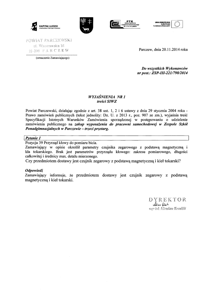 KAPITAŁ LUDZKI Zakład Szkolenia i Doradztwa Ekonomicznego Sp. z o.o. w Lublinie UNIA EUROPEJSKA EUROPEJSKI FUNDUSZ SPOŁECZNY NARODOWA SI RAIfcCIASPÓJNOŚĆ! Parczew, dnia 20.11.2014 roku (oznaczenie Zamawiającego) Do wszystkich Wykonawców nr post.: ZSP-III-221/798/2014 WYJAŚNIENIA NR 1 treści SIWZ Powiat Parczewski, działając zgodnie z art. 38 ust. 1, 2 i 6 ustawy z dnia 29 stycznia 2004 roku Prawo zamówień publicznych (tekst jednolity: Dz. U. z 2013 r., poz. 907 ze zm.), wyjaśnia treść Specyfikacji Istotnych Warunków Zamówienia sporządzonej w postępowaniu o udzielenie zamówienia publicznego na zakup wyposażenia do pracowni samochodowej w Zespole Szkół Ponadgimnazjalnych w Parczewie - trzeci przetarg. Pytanie 1 Pozycja 39 Przyrząd kłowy do pomiaru bicia. Zamawiający w opisie określił parametry czujnika zegarowego z podstawą magnetyczną i kła tokarskiego. Brak jest parametrów przyrządu kłowego: zakresu pomiarowego, długości całkowitej i średnicy max. detalu mierzonego. Czy przedmiotem dostawy jest czujnik zegarowy z podstawą magnetyczną i kieł tokarski? Odpowiedz Zamawiający informuje, że przedmiotem dostawy jest czujnik zegarowy z podstawą magnetyczną i kieł tokarski. DYREKTOR. JjUu* ІАЛ 7"' * u'> '>.;/ w K;ra!:V % KAPITAŁ LUDZKI N AKOOOWA SI RAIfcCIASPÓJNOŚCI PTE Zakład Szkolenia Doradztwa Ekonomicznego ~ i. z o.o. w Lublinie UNIA EUROPEJSKA EUROPEJSKI FUNDUSZ SPOŁECZNY Parczew, dnia 20.11.2014 roku (oznaczenie Zamawiającego) Do wszystkich Wykonawców nr post.: ZSP-III-221/798/2014 WYJAŚNIENIA NR 2 treści SIWZ Powiat Parczewski, działając zgodnie z art. 38 ust. 1, 2 i 6 ustawy z dnia 29 stycznia 2004 roku Prawo zamówień publicznych (tekst jednolity: Dz. U. z 2013 r., poz. 907 ze zm.), wyjaśnia treść Specyfikacji Istotnych Warunków Zamówienia sporządzonej w postępowaniu o udzielenie zamówienia publicznego na zakup wyposażenia do pracowni samochodowej w Zespole Szkól Ponadgimnazjalnych w Parczewie - trzeci przetarg. Pytanie 1 pozycja nr 6 - Sprężarka spełniająca wszystkie parametry liczbowe specyfikacji: WALTER GK 530 3.0 200 nie posiada niestety dodatkowego manometru wskazującego ciśnienie w zbiorniku oraz nie posiada również zabezpieczenia termicznego silnika przed przeciążeniem. Parametry te są charakterystyczne dla sprężarek producenta METABO, który z kolei nie posiada w ofercie modelu który spełniałby parametry wymiarowe i wagowe. Czy zamawiający dopuszcza dostawę sprężarki, która nie spełnia w 100 % założeń specyfikacji? Odpowiedz Zamawiający informuje, że dopuszcza sprężarkę nie posiadającą manometru wskazującego ciśnienie w zbiorniku oraz nie posiadającą zabezpieczenia termicznego silnika przed przeciążeniem pod warunkiem, że oferowane urządzenie posiadać będzie manometr wskazujący ciśnienie na reduktorze oraz zabezpieczenie termiczne regulatora ciśnieniowego (presostatu). Pytanie 2 pozycja nr 4 - wiertarka ręczna jej parametry wskazują na zastosowanie wiertarki producenta Black & Decker o oznaczeniu KR703K jednak jak wiemy od dystrybutora tych urządzeń w Polsce model ten został wycofany przez producenta z oferty i jednocześnie zastąpiony przez modelem KR705 który posiada wyższą moc wynoszącą 750 W. Czy zamawiający dopuszcza zastosowanie modelu KR705, który posiada porównywalne parametry jednak nie spełnia założeń specyfikacji? Odpowiedz Zamawiający informuje, że dopuszcza zastosowanie urządzenia, które posiada wskazane parametry i wyższą moc tj. 750W. DYREKTOR