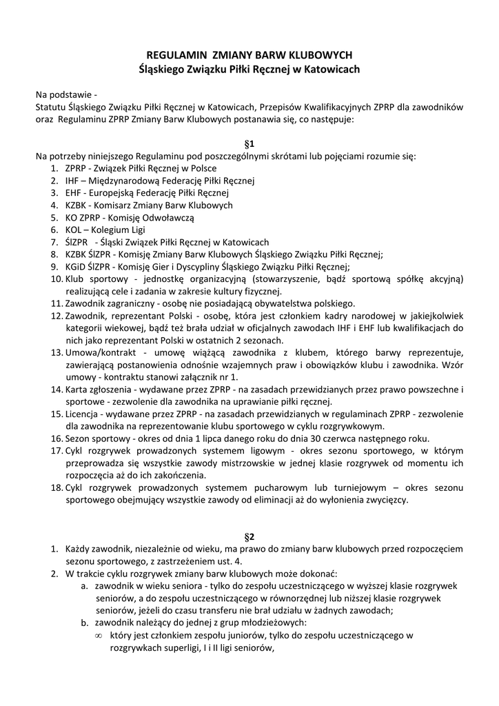 REGULAMIN ZMIANY BARW KLUBOWYCH Śląskiego Związku Piłki Ręcznej w Katowicach Na podstawie Statutu Śląskiego Związku Piłki Ręcznej w Katowicach, Przepisów Kwalifikacyjnych ZPRP dla zawodników oraz Regulaminu ZPRP Zmiany Barw Klubowych postanawia się, co następuje: §1 Na potrzeby niniejszego Regulaminu pod poszczególnymi skrótami lub pojęciami rozumie się: 1. ZPRP - Związek Piłki Ręcznej w Polsce 2. IHF – Międzynarodową Federację Piłki Ręcznej 3. EHF - Europejską Federację Piłki Ręcznej 4. KZBK - Komisarz Zmiany Barw Klubowych 5. KO ZPRP - Komisję Odwoławczą 6. KOL – Kolegium Ligi 7. ŚlZPR - Śląski Związek Piłki Ręcznej w Katowicach 8. KZBK ŚlZPR - Komisję Zmiany Barw Klubowych Śląskiego Związku Piłki Ręcznej; 9. KGiD ŚlZPR - Komisję Gier i Dyscypliny Śląskiego Związku Piłki Ręcznej; 10. Klub sportowy - jednostkę organizacyjną (stowarzyszenie, bądź sportową spółkę akcyjną) realizującą cele i zadania w zakresie kultury fizycznej. 11. Zawodnik zagraniczny - osobę nie posiadającą obywatelstwa polskiego. 12. Zawodnik, reprezentant Polski - osobę, która jest członkiem kadry narodowej w jakiejkolwiek kategorii wiekowej, bądź też brała udział w oficjalnych zawodach IHF i EHF lub kwalifikacjach do nich jako reprezentant Polski w ostatnich 2 sezonach. 13. Umowa/kontrakt - umowę wiążącą zawodnika z klubem, którego barwy reprezentuje, zawierającą postanowienia odnośnie wzajemnych praw i obowiązków klubu i zawodnika. Wzór umowy - kontraktu stanowi załącznik nr 1. 14. Karta zgłoszenia - wydawane przez ZPRP - na zasadach przewidzianych przez prawo powszechne i sportowe - zezwolenie dla zawodnika na uprawianie piłki ręcznej. 15. Licencja - wydawane przez ZPRP - na zasadach przewidzianych w regulaminach ZPRP - zezwolenie dla zawodnika na reprezentowanie klubu sportowego w cyklu rozgrywkowym. 16. Sezon sportowy - okres od dnia 1 lipca danego roku do dnia 30 czerwca następnego roku. 17. Cykl rozgrywek prowadzonych systemem ligowym - okres sezonu sportowego, w którym przeprowadza się wszystkie zawody mistrzowskie w jednej klasie rozgrywek od momentu ich rozpoczęcia aż do ich zakończenia. 18. Cykl rozgrywek prowadzonych systemem pucharowym lub turniejowym – okres sezonu sportowego obejmujący wszystkie zawody od eliminacji aż do wyłonienia zwycięzcy. §2 1. Każdy zawodnik, niezależnie od wieku, ma prawo do zmiany barw klubowych przed rozpoczęciem sezonu sportowego, z zastrzeżeniem ust. 4. 2. W trakcie cyklu rozgrywek zmiany barw klubowych może dokonać: a. zawodnik w wieku seniora - tylko do zespołu uczestniczącego w wyższej klasie rozgrywek seniorów, a do zespołu uczestniczącego w równorzędnej lub niższej klasie rozgrywek seniorów, jeżeli do czasu transferu nie brał udziału w żadnych zawodach; b. zawodnik należący do jednej z grup młodzieżowych: • który jest członkiem zespołu juniorów, tylko do zespołu uczestniczącego w rozgrywkach superligi, I i II ligi seniorów, 2 • który jest członkiem zespołu uczestniczącego w rozgrywkach superligi, I i II ligi, tylko do zespołu uczestniczącego w wyższej klasie rozgrywek, • może być transferowany do zespołu uczestniczącego w równorzędnej lub niższej klasie rozgrywek, jeżeli reprezentuje w rozgrywkach jedną z następujących grup: o Dzieci i Dzieci Młodsze, o Młodzicy i Młodzicy Młodsi, o Junior Młodszy; • każdy zawodnik, niezależnie od wieku, którego kontrakt sportowy został prawomocnie rozwiązany z przyczyn leżących po stronie klubu. 3. Zawodnicy mogą zmieniać barwy klubowe z uwzględnieniem zasad określonych w niniejszym Regulaminie. 4. Zawodnik, niezależnie od wieku, ukarany dyskwalifikacją lub dyskwalifikacją w zawieszeniu, nie ma prawa do zmiany barw klubowych w okresie biegu kary lub zawieszenia jej wykonania. §3 1. Decyzje w sprawie zmiany barw klubowych przez zawodnika wydaje, a także sprawuje nadzór nad prawidłowością procedury transferowej oraz rozstrzyga powstałe w związku z tym spory Komisja Zmiany Barw Klubowych Śl.ZPR powołana przez Zarząd Śl.ZPR. 2. Do kompetencji KZBK Śl.ZPR należą sprawy zmiany barw klubowych zawodników w rozgrywkach młodzieżowych oraz w IV i niższych klasach rozgrywek seniorów pomiędzy klubami zarejestrowanymi w Śl.ZPR w Katowicach. §4 1. Od decyzji KZBK Śl.ZPR służy stronom prawo wniesienia odwołania do Zarządu Śl.ZPR. Odwołanie wnosi się w terminie 7 dni od daty ogłoszenia lub doręczenia decyzji KZBK Śl.ZPR. Zarząd Śl.ZPR rozpatruje odwołania bez zbędnej zwłoki. 2. W przypadku odrzucenia protestu przez Zarząd ŚlZPR strona ma prawo wnieść odwołanie do Komisji Odwoławczej ZPRP w terminie 14 dni od daty otrzymania decyzji wraz z równoczesnym wpłaceniem kaucji w wysokości określonej w Regulaminie dyscyplinarnym ZPRP. §5 1. Warunkiem niezbędnym dla dokonania zmiany barw jest umieszczenie zawodnika na liście transferowej prowadzonej przez Śl.ZPR. 2. Za umieszczenie zawodnika na liście transferowej pobiera się opłatę, która będzie określona w uchwalanym corocznie przez Zarząd Śl.ZPR wykazie opłat związanych ze zmianą przynależności klubowej. Wykaz opłat stanowi załącznik nr 5. §6 1. Zawodnik może wystąpić do ŚL.ZPR z wnioskiem o umieszczenie go na liście transferowej, o ile nie posiada ważnej umowy-kontraktu z klubem lub wiążąca go umowa-kontrakt wygasa albo ulega rozwiązaniu przed rozpoczęciem następnego cyklu rozgrywkowego. Koszt wpisu ponosi zawodnik. Wzór wniosku stanowi załącznik nr 2. 2. Zawodnik składający wniosek, o którym mowa wyżej może przedłożyć oświadczenie klubu, którego barwy ostatnio reprezentował - stwierdzające, że spełnione są wskazane w ust. 1 warunki do umieszczenia zawodnika na liście transferowej. Klub zobowiązany jest wydać takie oświadczenie na prośbę zawodnika w terminie 7 dni od daty jej otrzymania oraz może dołączyć zastrzeżeni