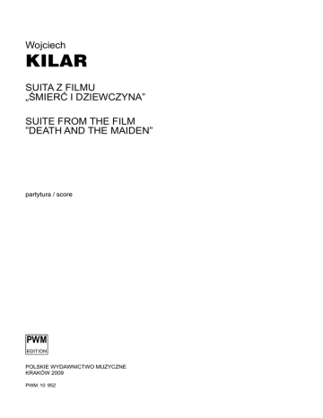 Wojciech KILAR SUITA Z FILMU „ŚMIERĆ I DZIEWCZYNA” SUITE FROM THE FILM ”DEATH AND THE MAIDEN” partytura / score POLSKIE WYDAWNICTWO MUZYCZNE KRAKÓW 2009 PWM 10 952 ORCHESTRA: 2 flauti – (fl) anche 2 piccoli – (picc) 2 oboi – (ob) II anche corno inglese – (c. ing.) 2 clarinetti in si b – (cl) 4 3 3 1 corni in fa – (cr) trombe in do – (tr) tromboni – (tn) tuba – (tb) timpano – (tmp) 3 batterie: xilofono – xlf tamburo con corde – (tmb cc) tamburo senza corde – (tmb sc) tom-toms – (tomt) tam-tam – (tmt) arpa – (ar) cembalo – (cemb) pianoforte – (pf) 14 violini I – (vn I) 12 violini II – (vn II) 12 viole – (vl) 8 violoncelli – (vc) 8 contrabbassi (5-8 d. 5 corde) – (cb) SUITA Z FILMU „ŚMIERĆ I DZIEWCZYNA” SUITE FROM THE FILM ”DEATH AND THE MAIDEN” I. ”THE CONFESSION” div. WOJCIECH KILAR (*1932) q = ca 60 (w = ca 4”) viole violoncelli mf misterioso contrabbassi mf misterioso vn II div. vl vc cb 7 mf misterioso © 2009 by Polskie Wydawnictwo Muzyczne SA, Kraków, Poland. All rights reserved. 4 vn II div. vl vc cb vn II div. 13 vl vc cb mf misterioso vn II div. vl vc cb PWM 10 952 19