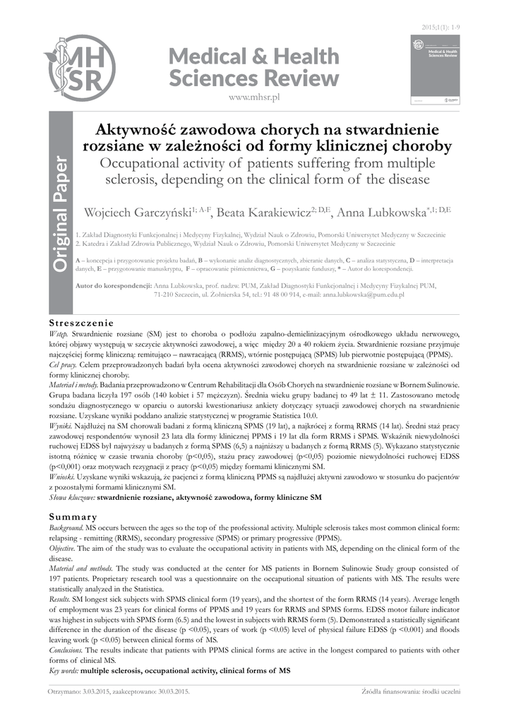 2015;1(1): 1-9 e-ISSN 2450-1670 Volume 1 Issue 1 Medical & Health Sciences Review Original Paper www.mhsr.pl www.mhsr.pl Aktywność zawodowa chorych na stwardnienie rozsiane w zależności od formy klinicznej choroby Occupational activity of patients suffering from multiple sclerosis, depending on the clinical form of the disease Wojciech Garczyński1; A-F, Beata Karakiewicz2; D,E, Anna Lubkowska*,1; D,E 1. Zakład Diagnostyki Funkcjonalnej i Medycyny Fizykalnej, Wydział Nauk o Zdrowiu, Pomorski Uniwersytet Medyczny w Szczecinie 2. Katedra i Zakład Zdrowia Publicznego, Wydział Nauk o Zdrowiu, Pomorski Uniwersytet Medyczny w Szczecinie A – koncepcja i przygotowanie projektu badań, B – wykonanie analiz diagnostycznych, zbieranie danych, C – analiza statystyczna, D – interpretacja danych, E – przygotowanie manuskryptu, F – opracowanie piśmiennictwa, G – pozyskanie funduszy, * – Autor do korespondencji. Autor do korespondencji: Anna Lubkowska, prof. nadzw. PUM, Zakład Diagnostyki Funkcjonalnej i Medycyny Fizykalnej PUM, 71-210 Szczecin, ul. Żołnierska 54, tel.: 91 48 00 914, e-mail: [email protected] Str eszczenie Wstęp. Stwardnienie rozsiane (SM) jest to choroba o podłożu zapalno-demielinizacyjnym ośrodkowego układu nerwowego, której objawy występują w szczycie aktywności zawodowej, a więc między 20 a 40 rokiem życia. Stwardnienie rozsiane przyjmuje najczęściej formę kliniczną: remitująco – nawracającą (RRMS), wtórnie postępującą (SPMS) lub pierwotnie postępującą (PPMS). Cel pracy. Celem przeprowadzonych badań była ocena aktywności zawodowej chorych na stwardnienie rozsiane w zależności od formy klinicznej choroby. Materiał i metody. Badania przeprowadzono w Centrum Rehabilitacji dla Osób Chorych na stwardnienie rozsiane w Bornem Sulinowie. Grupa badana liczyła 197 osób (140 kobiet i 57 mężczyzn). Średnia wieku grupy badanej to 49 lat ± 11. Zastosowano metodę sondażu diagnostycznego w oparciu o autorski kwestionariusz ankiety dotyczący sytuacji zawodowej chorych na stwardnienie rozsiane. Uzyskane wyniki poddano analizie statystycznej w programie Statistica 10.0. Wyniki. Najdłużej na SM chorowali badani z formą kliniczną SPMS (19 lat), a najkrócej z formą RRMS (14 lat). Średni staż pracy zawodowej respondentów wynosił 23 lata dla formy klinicznej PPMS i 19 lat dla form RRMS i SPMS. Wskaźnik niewydolności ruchowej EDSS był najwyższy u badanych z formą SPMS (6,5) a najniższy u badanych z formą RRMS (5). Wykazano statystycznie istotną różnicę w czasie trwania choroby (p<0,05), stażu pracy zawodowej (p<0,05) poziomie niewydolności ruchowej EDSS (p<0,001) oraz motywach rezygnacji z pracy (p<0,05) między formami klinicznymi SM. Wnioski. Uzyskane wyniki wskazują, że pacjenci z formą kliniczną PPMS są najdłużej aktywni zawodowo w stosunku do pacjentów z pozostałymi formami klinicznymi SM. Słowa kluczowe: stwardnienie rozsiane, aktywność zawodowa, formy kliniczne SM Summar y Background. MS occurs between the ages so the top of the professional activity. Multiple sclerosis takes most common clinical form: relapsing - remitting (RRMS), secondary progressive (SPMS) or primary progressive (PPMS). Objective. The aim of the study was to evaluate the occupational activity in patients with MS, depending on the clinical form of the disease. Material and methods. The study was conducted at the center for MS patients in Bornem Sulinowie Study group consisted of 197 patients. Proprietary research tool was a questionnaire on the occaputional situation of patients with MS. The results were statistically analyzed in the Statistica. Results. SM longest sick subjects with SPMS clinical form (19 years), and the shortest of the form RRMS (14 years). Average length of employment was 23 years for clinical forms of PPMS and 19 years for RRMS and SPMS forms. EDSS motor failure indicator was highest in subjects with SPMS form (6.5) and the lowest in subjects with RRMS form (5). Demonstrated a statistically significant difference in the duration of the disease (p <0.05), years of work (p <0.05) level of physical failure EDSS (p <0.001) and floods leaving work (p <0.05) between clinical forms of MS. Conclusions. The results indicate that patients with PPMS clinical forms are active in the longest compared to patients with other forms of clinical MS. Key words: multiple sclerosis, occupational activity, clinical forms of MS Otrzymano: 3.03.2015, zaakceptowano: 30.03.2015. Źródła finansowania: środki uczelni 1 Wojciech Garczyński i wsp., Aktywność zawodowa chorych na stwardnienie rozsiane w zależności od formy klinicznej choroby WSTĘP Stwardnienie rozsiane (SM) jest przewlekłą chorobą o podłożu zapalnodemielinizacyjnym ośrodkowego układu nerwowego zaczynającą się zazwyczaj u młodych dorosłych (20-40 rok życia). Jedną z przyczyn zmian demielinizacyjnych są uwarunkowania genetyczne, które powstają w warunkach nieprawidłowych reakcji immunologicznych [1, 2, 3]. Konsekwencją demielinizacji jest spowolnienie przewodnictwa nerwowego. Zmiany zapalno – demielinizacyjne w ośrodkowym układzie nerwowym są przyczyną powstania deficytów neurologicznych o różnej progresji prowadząc często do niepełnosprawności [1, 3]. Zmiany demielinizacyjne charakteryzują się szybką progresją i występują głównie w istocie białej, w pniu mózgu, w móżdżku, w rdzeniu kręgowym i nerwie wzrokowym. Pojęcie rzutu choroby związane jest z pojawianiem się nowych lub zaostrzeniem już istniejących objawów neurologicznych trwających przynajmniej 24 godziny i niezwiązanych z infekcją. Stwardnienie rozsiane może przebiegać w sposób bardzo zróżnicowany w zakresie częstości rzutów oraz szybkości narastania niewydolności neurologicznej [4]. Do rozpoznania SM stosuje się kryteria diagnostyczne McDonalda [5]. Stwardnienie rozsiane może mieć przebieg z rzutami lub bez. Forma kliniczna pierwotnie po