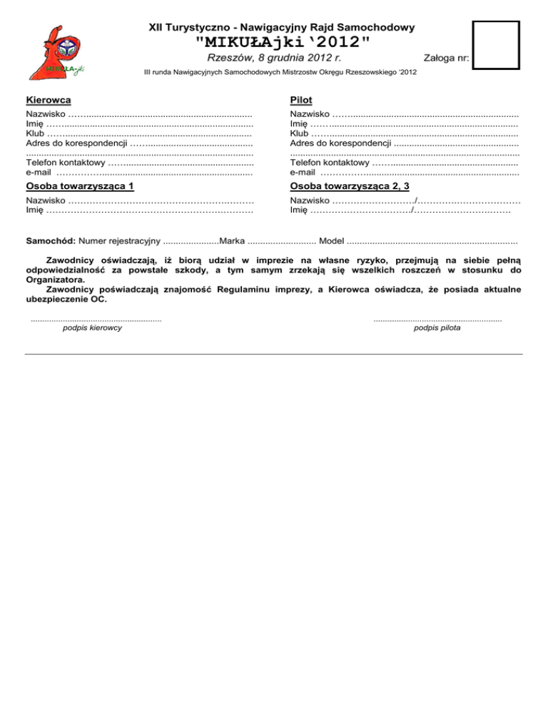 XII Turystyczno - Nawigacyjny Rajd Samochodowy "MIKUŁAjki‘2012" Rzeszów, 8 grudnia 2012 r. Załoga nr: III runda Nawigacyjnych Samochodowych Mistrzostw Okręgu Rzeszowskiego ‘2012 Kierowca Pilot Nazwisko ……................................................................. Imię …….......................................................................... Klub ……......................................................................... Adres do korespondencji ……......................................... ......................................................................................... Telefon kontaktowy …….................................................. e-mail ……………........................................................... Nazwisko …….................................................................. Imię …… .......................................................................... Klub …….......................................................................... Adres do korespondencji ................................................. .......................................................................................... Telefon kontaktowy …… .................................................. e-mail ……………............................................................ Osoba towarzysząca 1 Osoba towarzysząca 2, 3 Nazwisko …………………………………………….……… Imię ………………………………………………….………. Nazwisko ………………………/………….………………… Imię ……………………………/…………………….……. Samochód: Numer rejestracyjny ......................Marka ........................... Model ................................................................... Zawodnicy oświadczają, iż biorą udział w imprezie na własne ryzyko, przejmują na siebie pełną odpowiedzialność za powstałe szkody, a tym samym zrzekają się wszelkich roszczeń w stosunku do Organizatora. Zawodnicy poświadczają znajomość Regulaminu imprezy, a Kierowca oświadcza, że posiada aktualne ubezpieczenie OC. ......................................................... podpis kierowcy ........................................................ podpis pilota