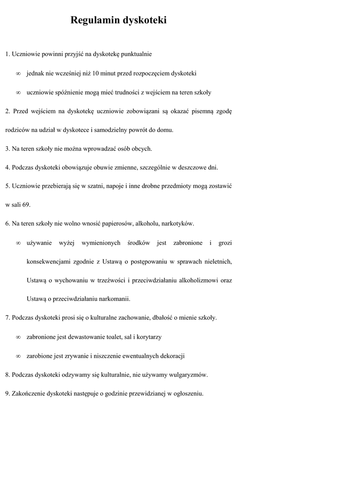 Regulamin dyskoteki 1. Uczniowie powinni przyjść na dyskotekę punktualnie • jednak nie wcześniej niż 10 minut przed rozpoczęciem dyskoteki • uczniowie spóźnienie mogą mieć trudności z wejściem na teren szkoły 2. Przed wejściem na dyskotekę uczniowie zobowiązani są okazać pisemną zgodę rodziców na udział w dyskotece i samodzielny powrót do domu. 3. Na teren szkoły nie można wprowadzać osób obcych. 4. Podczas dyskoteki obowiązuje obuwie zmienne, szczególnie w deszczowe dni. 5. Uczniowie przebierają się w szatni, napoje i inne drobne przedmioty mogą zostawić w sali 69. 6. Na teren szkoły nie wolno wnosić papierosów, alkoholu, narkotyków. • używanie wyżej wymienionych środków jest zabronione i grozi konsekwencjami zgodnie z Ustawą o postępowaniu w sprawach nieletnich, Ustawą o wychowaniu w trzeźwości i przeciwdziałaniu alkoholizmowi oraz Ustawą o przeciwdziałaniu narkomanii. 7. Podczas dyskoteki prosi się o kulturalne zachowanie, dbałość o mienie szkoły. • zabronione jest dewastowanie toalet, sal i korytarzy • zarobione jest zrywanie i niszczenie ewentualnych dekoracji 8. Podczas dyskoteki odzywamy się kulturalnie, nie używamy wulgaryzmów. 9. Zakończenie dyskoteki następuje o godzinie przewidzianej w ogłoszeniu.