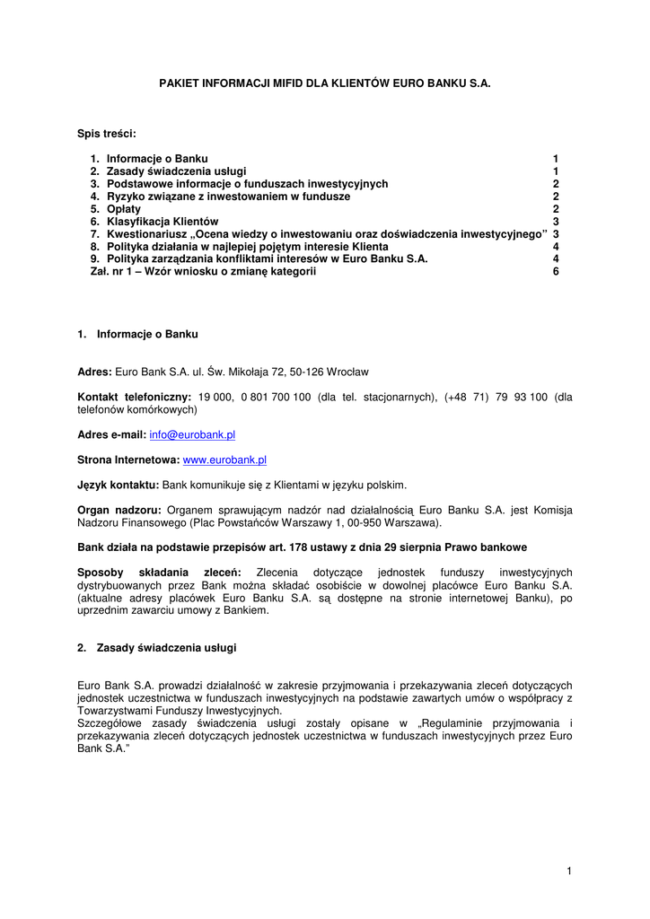 1 PAKIET INFORMACJI MIFID DLA KLIENTÓW EURO BANKU S.A.
