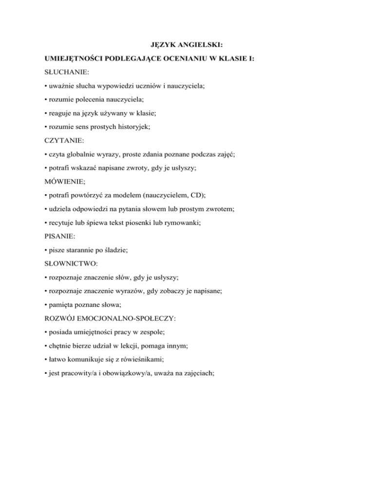 JĘZYK ANGIELSKI: UMIEJĘTNOŚCI PODLEGAJĄCE OCENIANIU W KLASIE I: SŁUCHANIE: • uważnie słucha wypowiedzi uczniów i nauczyciela; • rozumie polecenia nauczyciela; • reaguje na język używany w klasie; • rozumie sens prostych historyjek; CZYTANIE: • czyta globalnie wyrazy, proste zdania poznane podczas zajęć; • potrafi wskazać napisane zwroty, gdy je usłyszy; MÓWIENIE; • potrafi powtórzyć za modelem (nauczycielem, CD); • udziela odpowiedzi na pytania słowem lub prostym zwrotem; • recytuje lub śpiewa tekst piosenki lub rymowanki; PISANIE: • pisze starannie po śladzie; SŁOWNICTWO: • rozpoznaje znaczenie słów, gdy je usłyszy; • rozpoznaje znaczenie wyrazów, gdy zobaczy je napisane; • pamięta poznane słowa; ROZWÓJ EMOCJONALNO-SPOŁECZY: • posiada umiejętności pracy w zespole; • chętnie bierze udział w lekcji, pomaga innym; • łatwo komunikuje się z rówieśnikami; • jest pracowity/a i obowiązkowy/a, uważa na zajęciach; KLASA I UMIEJETNOŚCI OPANOWANE WSPANIALE Uczeń: • potrafi swobodnie i bezbłędnie posługiwać się słownictwem wprowadzanym na lekcjach, samodzielnie rozwija zdolności językowe; • rozumie proste polecenia i od razu prawidłowo na nie reaguje; • bezbłędnie naśladuje wypowiedzi nauczyciela; • zawsze potrafi zrozumieć sens słuchanych historyjek i scenek prezentowanych na lekcjach; • samodzielnie recytuje wierszyki i rymowanki, śpiewa piosenki; • samodzielnie i bezproblemowo wykonuje ćwiczenia w podręczniku, ćwiczeniach, na kartach pracy, sprawdzianach itp.; • zawsze jest przygotowany do lekcji; • zawsze chętnie bierze udział w zabawach indywidualnych i grupowych, konkursach. ( OCENY CZĄSTKOWE: 6 punktów) UMIEJĘTNOŚCI OPANOWANE BARDZO DOBRZE Uczeń: • potrafi nazwać przedmioty, rzeczy, zwierzęta itd., których nazwy były stosunkowo niedawno wprowadzane i utrwalane na lekcjach; • rozumie proste polecenia i właściwie na nie reaguje; • umiejętnie naśladuje wypowiedzi nauczyciela; • zawsze potrafi zrozumieć ogólny sens słuchanych historyjek i scenek prezentowanych na lekcjach gdy są wspierane obrazkami, gestami, przedmiotami; • bezbłędnie recytuje wierszyki i rymowanki, śpiewa piosenki w grupie lub z pomocą nauczyciela; • samodzielnie wykonuje ćwiczenia w podręczniku i zeszycie ćwiczeń; • jest przygotowany do lekcji; • chętnie bierze udział w większości zabaw indywidualnych i grupowych. ( OCENY CZĄSTKOWE: 5 punktów) UMIEJĘTNOŚCI OPANOWANE DOBRZE Uczeń: • potrafi nazwać przedmioty, rzeczy, zwierzęta itd., których nazwy były stosunkowo niedawno wprowadzane i utrwalane na lekcjach, choć zdarza mu się popełniać błędy; • rozumie proste polecenia i często właściwie na nie reaguje; • naśladuje wypowiedzi nauczyciela popełniając drobne błędy; • często potrafi zrozumieć ogólny sens słuchanych historyjek i scenek prezentowanych na lekcjach; • recytuje wierszyki i rymowanki, śpiewa piosenki popełniając drobne błędy; • samodzielnie wykonuje większość ćwiczeń w podręczniku i zeszycie ćwiczeń popełniając przy tym drobne błędy; • często jest przygotowany do lekcji; • chętnie bierze udział w wybranych zabawach indywidualnych i grupowych. ( OCENY CZĄSTKOWE: 4 punkty) UMIEJĘTNOŚCI OPANOWANE DOŚĆ DOBRZE Uczeń: • przy pomocy nauczyciela lub kolegów potrafi nazwać przedmioty, rzeczy, zwierzęta itd., których nazwy były stosunkowo niedawno wprowadzane i utrwalane na lekcjach, choć zdarza mu się popełniać błędy; • rozumie proste polecenia i czasami właściwie na nie reaguje; • naśladuje wypowiedzi nauczyciela popełniając błędy; • ma czasami problemy ze zrozumieniem ogólnego sensu słuchanych historyjek i scenek prezentowanych na lekcjach; • recytuje wierszyki i rymowanki, śpiewa piosenki popełniając błędy; • wykonuje ćwiczenia w podręczniku i zeszycie ćwiczeń popełniając błędy; • czasami jest przygotowany do lekcji; • bierze udział w wybranych zabawach indywidualnych i grupowych. ( OCENY CZĄSTKOWE: 3 punkty) UMIEJĘTNOŚCI OPANOWANE SŁABO Uczeń: • myli nazwy przedmiotów, rzeczy, zwierząt itd., których nazwy były wprowadzane i utrwalane na lekcjach; • rozumie proste polecenia i właściwie na nie reaguje tylko przy pomocy gestu nauczyciela; • rzadko potrafi zrozumieć ogólny sens słuchanych historyjek i scenek prezentowanych na lekcjach; • rzadko poprawnie naśladuje wypowiedzi nauczyciela; • niechętnie i tylko w grupie recytuje wierszyki i rymowanki, śpiewa piosenki popełniając przy tym błędy; • niechętnie i tylko z pomocą nauczyciela wykonuje ćwiczenia w podręczniku; • prawie zawsze jest nieprzygotowany do lekcji; • niechętnie bierze udział w zabawach indywidualnych i grupowych. (OCENY CZĄSTKOWE: 2 punkty) UMIEJĘTNOŚCI NIE ZOSTAŁY OPANOWANE Uczeń: • nie potrafi wykonać zadań o elementarnym stopniu trudności, nie opanował wymaganych wiadomości i umiejętności przewidzianych w programie nauczania, zgodnym z nową podstawa programową. (OCENY CZĄSTKOWE: 1 punkt) SZCZEGÓŁOWE WYMAGANIA PROGRAMOWE POSIADA NAUCZYCIEL PRZEDMIOTU.