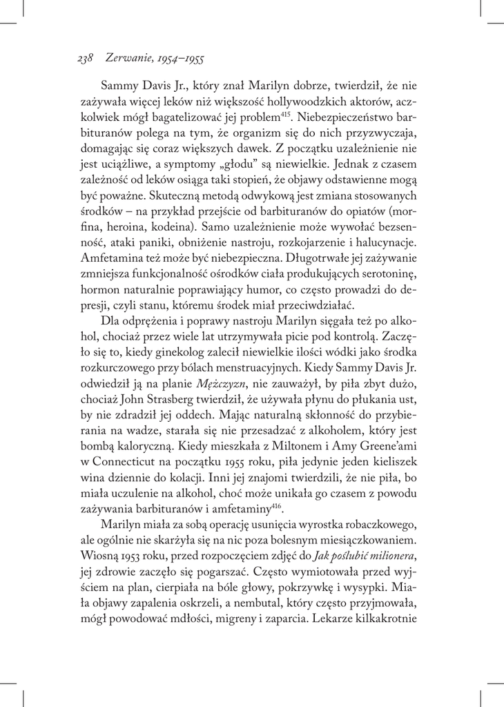 238 Zerwanie, 1954 – 1955 Sammy Davis Jr., który znał Marilyn dobrze, twierdził, że nie zażywała więcej leków niż większość hollywoodzkich aktorów, aczkolwiek mógł bagatelizować jej problem415. Niebezpieczeństwo barbituranów polega na tym, że organizm się do nich przyzwyczaja, domagając się coraz większych dawek. Z początku uzależnienie nie jest uciążliwe, a symptomy „głodu” są niewielkie. Jednak z czasem zależność od leków osiąga taki stopień, że objawy odstawienne mogą być poważne. Skuteczną metodą odwykową jest zmiana stosowanych środków – na przykład przejście od barbituranów do opiatów (morfina, heroina, kodeina). Samo uzależnienie może wywołać bezsenność, ataki paniki, obniżenie nastroju, rozkojarzenie i halucynacje. Amfetamina też może być niebezpieczna. Długotrwałe jej zażywanie zmniejsza funkcjonalność ośrodków ciała produkujących serotoninę, hormon naturalnie poprawiający humor, co często prowadzi do depresji, czyli stanu, któremu środek miał przeciwdziałać. Dla odprężenia i poprawy nastroju Marilyn sięgała też po alkohol, chociaż przez wiele lat utrzymywała picie pod kontrolą. Zaczęło się to, kiedy ginekolog zalecił niewielkie ilości wódki jako środka rozkurczowego przy bólach menstruacyjnych. Kiedy Sammy Davis Jr. odwiedził ją na planie Mężczyzn, nie zauważył, by piła zbyt dużo, chociaż John Strasberg twierdził, że używała płynu do płukania ust, by nie zdradził jej oddech. Mając naturalną skłonność do przybierania na wadze, starała się nie przesadzać z alkoholem, który jest bombą kaloryczną. Kiedy mieszkała z Miltonem i Amy Greene’ami w Connecticut na początku 955 roku, piła jedynie jeden kieliszek wina dziennie do kolacji. Inni jej znajomi twierdzili, że nie piła, bo miała uczulenie na alkohol, choć może unikała go czasem z powodu zażywania barbituranów i amfetaminy416. Marilyn miała za sobą operację usunięcia wyrostka robaczkowego, ale ogólnie nie skarżyła się na nic poza bolesnym miesiączkowaniem. Wiosną 953 roku, przed rozpoczęciem zdjęć do Jak poślubić milionera, jej zdrowie zaczęło się pogarszać. Często wymiotowała przed wyjściem na plan, cierpiała na bóle głowy, pokrzywkę i wysypki. Miała objawy zapalenia oskrzeli, a nembutal, który często przyjmowała, mógł powodować mdłości, migreny i zaparcia. Lekarze kilkakrotnie Zerwanie, 1954 – 1955 239 stwierdzali u niej anemię, którą leczyli zastrzykami z witaminy B2, która na krótki czas poprawiała samopoczucie. Czasem symulowała, ponieważ była wykończona i potrzebowała odpoczynku lub chciała wymóc coś na producentach. Według Jacka Cole’a, jeśli zauważyła najmniejszą krostkę na twarzy, zawiadamiała, że nie przyjdzie z powodu choroby. Cole przesadza, ale Marilyn perfekcjonistka i Marilyn, której brakowało pewności siebie, czasem się spotykały i dochodziły do wniosku, że nie są w stanie pracować417. Nabawiła się też alergii. Alkohol i leki mogą przeciążyć wątrobę, ośrodek detoksykacji ciała, a wtedy może się pojawić uczulenie na jakiś typ pokarmu czy pyłki roślin, wywołując katar i utrudniając oddychanie. Do tego jeszcze Marilyn paliła papierosy jak większość jej pokolenia. Amy Greene podaje, że Marilyn dwanaście razy poddała się aborcji. Kiedy spytałam o to Steffi Skolsky, odpowiedziała wymijająco, że aborcja była w Hollywood popularną metodą regulacji urodzeń. Marilyn niejednokrotnie zapewniała, że chce mieć dziecko, ale jednocześnie według Susan Strasberg obawiała się, że ciąża zdeformuje jej ciało i bała się bólów porodowych. Z drugiej strony jej poronienia i aborcje poskutkowały depresją i żalem, że nigdy nie będzie mieć dziecka418. Mimo nie zawsze dobrego samopoczucia na planie Jak poślubić milionera Marilyn dawała z siebie wszystko, korzystając z zapasów swej niespożytej energii. Wytwórnia, płacąc swym gwiazdom stałe pensje, musiała maksymalnie je wykorzystać, zmuszając do kręcenia jednego filmu za drugim. Marilyn zdarzały się momenty depresji, ale ukrywała je podobnie jak bóle menstruacyjne. Wciąż dręczyła ją bezsenność i jej demony. Zdradzała objawy hipomanii, która jednak nie była na tyle rozwinięta, by uniemożliwić jej ukończenie filmu. Pod koniec września 953 roku zmarła Grace Goddard. To był dla Marilyn cios. Od dzieciństwa była dla niej największym wsparciem. Przez kilka lat wraz z Docem zajmowała się jej rachunkami, podatkami i odpowiadała na listy od wielbicieli. Nadzorowała też opiekę nad Gladys i regularnie ją odwiedzała. Marilyn zapłaciła za pochówek Grace na Westwood Memorial Cemetery and Mortuary, gdzie spoczywała Ana Lower. 240 Zerwanie, 1954 – 1955 Po śmierci Grace Joe postanowił wziąć w swoje ręce sprawy związane z karierą Marilyn. Uważał, że potrzebuje profesjonalnego menedżera, a nie kolejnego członka rodziny. W końcu była wielką gwiazdą. Za pośrednictwem swego prawnika Loyda Wrighta dotarł do Inez Melson, która prowadziła w Hollywood niewielką firmę zajmującą się zarządzaniem. Namówił Marilyn, by ją zatrudniła419. Marilyn lubiła Inez, kolejną starszą kobietę, na którą mogła liczyć, kiedy potrzebowała porady. Dobrze czuła się w jej domu w Hollywood Hills. Inez hodowała papużki aleksandretty, takie same, z jakimi Marilyn uwielbiała się bawić w ptaszarni Giffenów, kiedy mieszkała u nich jako dziecko. Inez nie zajęła jednak miejsca Grace w życiu Marilyn – aktorka miała już kilka starszych przyjaciółek, które czasem jej matkowały: Anne Karger, Xenię Czechow i Lottę Goslar420. Inez przejęła nadzorowanie opieki nad Gladys Eley. Odwiedzała ją mniej więcej raz na tydzień i pilnowała, by w każdą niedzielę zabierano ją do miejscowego kościoła scjentystycznego. Wysyłała jej w imieniu Marilyn kartki świąteczne i urodzinowe. Gla