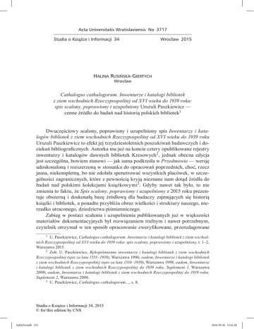 Acta Universitatis Wratislaviensis No 3717 Studia o Książce i Informacji 34 Wrocław 2015 Halina Rusińska-Giertych Wrocław Cathalogus cathalogorum. Inwentarze i katalogi bibliotek z ziem wschodnich Rzeczypospolitej od XVI wieku do 1939 roku: spis scalony, poprawiony i uzupełniony Urszuli Paszkiewicz — cenne źródło do badań nad historią polskich bibliotek1 Dwuczęściowy scalony, poprawiony i uzupełniony spis Inwentarzy i katalogów bibliotek z ziem wschodnich Rzeczypospolitej od XVI wieku do 1939 roku Urszuli Paszkiewicz to efekt jej trzydziestoletnich poszukiwań badawczych i dociekań bibliograficznych. Autorka ma już na koncie cztery opublikowane rejestry inwentarzy i katalogów dawnych bibliotek Kresowych2, jednak obecna edycja jest szczególna, bowiem stanowi — jak sama podkreśla w Przedmowie — wersję udoskonaloną i rozszerzoną w stosunku do opracowań poprzednich, choć, rzecz jasna, niekompletną, bo nie zdołała spenetrować wszystkich placówek, w szczególności zagranicznych, które z pewnością kryją nieznane nam dotąd źródła do badań nad polskimi kolekcjami książkowymi3. Gdyby nawet tak było, to nie zmienia to faktu, że Spis scalony, poprawiony i uzupełniony z 2015 roku prezentuje obszerną i doskonałą bazę źródłową dla badaczy zajmujących się historią książki i bibliotek, a ponadto przybliża obraz wielkości i struktury naszego, nierzadko utraconego, dziedzictwa piśmienniczego. Zabieg w postaci scalenia i uzupełnienia publikowanych już w większości materiałów dokumentacyjnych był rozwiązaniem trafnym i nawet potrzebnym, czytelnik otrzymał w ten sposób opracowanie zweryfikowane, przeredagowane 1 U. Paszkiewicz, Cathalogus cathalogorum. Inwentarze i katalogi bibliotek z ziem wschodnich Rzeczypospolitej od XVI wieku do 1939 roku: spis scalony, poprawiony i uzupełniony, t. 1–2, Warszawa 2015. 2 Zob. U. Paszkiewicz, Rękopiśmienne inwentarze i katalogi bibliotek z ziem wschodnich Rzeczypospolitej (spis za lata 1553–1939), Warszawa 1996; eadem, Inwentarze i katalogi bibliotek z ziem wschodnich Rzeczypospolitej (spis za lata 1510–1939), Warszawa 1998; eadem, Inwentarze i katalogi bibliotek z ziem wschodnich Rzeczypospolitej do 1939 roku. Suplement 1, Warszawa 2000; eadem, Inwentarze i katalogi bibliotek z ziem wschodnich Rzeczypospolitej do 1939 roku. Suplement 2, Warszawa 2006. 3 U. Paszkiewicz, Cathalogus cathalogorum…, s. 8. Studia o Książce i Informacji 34, 2015 © for this edition by CNS SoKiI34.indb 135 2016-09-26 13:41:28 136 Recenzje i przeglądy i wzbogacone o nowe ustalenia, między innymi poczynione w wyniku ponownej autopsji źródeł4. To dobrze, że Autorka dba, by jej — jakże ważny informator o zbiorach książkowych na ziemiach wschodnich Rzeczypospolitej — był aktualizowany i wzbogacany nowymi odkryciami poszukiwawczymi5. Taka praktyka czyni dzieło coraz doskonalszym, a czytelnik, wraz z kolejną edycją, może liczyć na bardziej kompletną lekturę. Opracowanie z 2015 roku zostało poszerzone na przykład o wykaz Właścicieli bibliotek prywatnych, który gromadzi w układzie alfabetycznym około 600 nazwisk posiadaczy księgozbiorów, podaje podstawowe informacje na ich temat (dane biograficzne, działalność zawodowa, funkcje społeczne), lokalizuje kolekcje oraz w miarę możliwości opisuje losy tych zespołów po śmierci ich właścicieli. W zestawieniu można również napotkać nazwiska ofiarodawców, którzy przekazali swoje zbiory poszczególnym bibliotekom. Wykaz inwentarzy i katalogów, przedstawiony w najnowszym wydaniu, składa się z dwóch woluminów. Wolumin pierwszy liczy 717 stron, drugi — 772 strony. Publikacja podzielona została na dwie części. Część I: Opisy jednostkowe poprzedzona została Przedmową (s. [7]–20), Wykazem skrótów cytowanych wydawnictw (s. [21]–39), Wykazem skrótów zastosowanych w opisach (s. [40]–43) oraz Innymi skrótami (s. 43–44). W zrębie głównym (na s. 45–717) umieszczono opisy inwentarzy i katalogów — hasła Albertyn–Myto. Ponadto (pomiędzy s. 352–353) odnajdujemy 32-stronicową wkładkę z ilustracjami, w większości kolorowymi, wypełnionymi znakami własnościowymi książek, które znalazły się w rejestrowanych kolekcjach. Dzięki dołączonej wkładce czytelnik może podziwiać ekslibrisy, superekslibrisy, pieczątki, stemple, naklejki typograficzne, podpisy właścicieli księgozbiorów, pierwsze strony przykładowych spisów i wreszcie — galerię Czytelni Głównej Biblioteki Uniwersyteckiej we Lwowie. Opisy jednostkowe, wchodzące w skład części pierwszej, kontynuowane są w woluminie drugim, w którym umieszczono hasła Nadiatycze–Żyżma (s. [7]–518) oraz dwa spisy: Miejscowości nieznane (s. [519]–523) i Addenda. Miejscowości poza granicami Rzeczypospolitej (s. [524]). Strona [525] woluminu drugiego rozpoczyna część drugą recenzowanego spisu, noszącą tytuł Część II: Informacje zbiorcze. Obejmuje ona hasła Agłona–Żydowice (s. 526–577) oraz cztery opisy, określone jako Addenda. Miejscowości poza granicami Rzeczypospolitej (s. [578]). W dalszej kolejności odnajdujemy aparat pomocniczy w postaci Indeksu nazw osobowych (s. [579]–628), wykazu nazwisk w układzie alfabetycznym, zatytułowanego Właściciele bibliotek prywatnych 4 Autorka przyznaje, że w wyniku ponownej autopsji źródeł udało się jej (dopiero po piętnastu latach) całkowicie zweryfikować trzy opisy katalogów — Biblioteki Kolegium OO. Teatynów we Lwowie i Biblioteki Gimnazjum Podolskiego w Winnicy i właściwie umiejscowić w najnowszym spisie — zob. U. Paszkiewicz, Cathalogus cathalogorum…, s. 10–11 oraz opisy poz. 1588, 4577, 4578. 5 W latach 2006–2014 autorka zebrała 827 nowych dokumentów — zob. ibidem, s. 10. Studia o Książce i Informacji 34, 2015 © for this edition by CNS SoKiI34.indb 136 2016-09-26 13:41:28 Recenzje i przeglądy 137 (s. [629]–672, Indeksu bibliotek ins