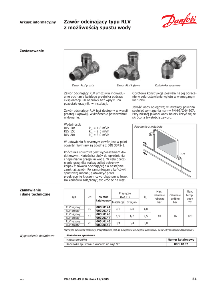 Arkusz informacyjny Zawór odcinający typu RLV z moŜliwością spustu wody Zastosowanie Zawór RLV prosty Zawór RLV kątowy Obrotowa konstrukcja pozwala na jej obracanie w celu ustawienia wylotu w wymaganym kierunku. Zawór odcinający RLV umoŜliwia indywidualne odcinanie kaŜdego grzejnika podczas eksploatacji lub naprawy bez wpływu na pozostałe grzejniki w instalacji. Jakość wody obiegowej w instalacji powinna spełniać wymagania normy PN-93/C-04607. Przy niŜszej jakości wody naleŜy liczyć się ze skrócona trwałością zaworu. Zawór odcinający RLV jest dostępny w wersji prostej i kątowej. Wykończenie powierzchni: niklowanie. Wydajności: RLV 10: RLV 15: RLV 20: Końcówka spustowa Połączenie z instalacją kvs = 1,8 m3/h kvs = 2,5 m3/h kvs = 3,0 m3/h W ustawieniu fabrycznym zawór jest w pełni otwarty. Wymiary są zgodne z DIN 3842-1. Końcówka spustowa jest wyposaŜeniem dodatkowym. Końcówka słuŜy do opróŜniania i napełniania grzejnika wodą. W celu opróŜnienia grzejnika naleŜy zdjąć ochronny kołpak z zaworu odcinającego a następnie zamknąć zawór. Po zamontowaniu końcówki spustowej moŜna ją otworzyć przez przekręcenie kluczem czworokątnym w lewo. Do końcówki załączony jest króciec na wąŜ. Zamawianie i dane techniczne Typ RLV RLV RLV RLV RLV RLV kątowy prosty kątowy prosty kątowy prosty DN 10 15 20 Numer katalogowy 003L0141 003L0142 003L0143 003L0144 003L0145 003L0146 Przyłącze ISO 7-1 kvs Instalacja Grzejnik 3/8 3/8 1,8 1/2 1/2 2,5 3/4 3/4 3,0 Max. ciśnienie robocze bar Ciśnienie próbne bar Max. temp. vody °C 10 16 120 Przyłącze od strony instalacji przygotowane jest do połączenia ze złączką zaciskową, patrz „WyposaŜenie dodatkowe”. WypasaŜenie dodatkowe Końcówka spustowa Nazwa produktu Końcówka spustowa z króćcem na wąŜ ¾” DKCD VD.32.C6.49 © Danfoss 11/2005 Numer katalogowy 003L0152 51
