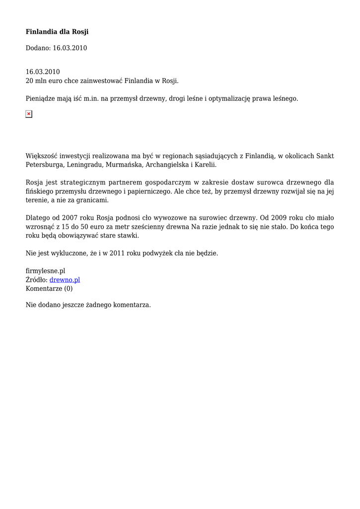 Finlandia dla Rosji Dodano: 16.03.2010 16.03.2010 20 mln euro chce zainwestować Finlandia w Rosji. Pieniądze mają iść m.in. na przemysł drzewny, drogi leśne i optymalizację prawa leśnego. Większość inwestycji realizowana ma być w regionach sąsiadujących z Finlandią, w okolicach Sankt Petersburga, Leningradu, Murmańska, Archangielska i Karelii. Rosja jest strategicznym partnerem gospodarczym w zakresie dostaw surowca drzewnego dla fińskiego przemysłu drzewnego i papierniczego. Ale chce też, by przemysł drzewny rozwijał się na jej terenie, a nie za granicami. Dlatego od 2007 roku Rosja podnosi cło wywozowe na surowiec drzewny. Od 2009 roku cło miało wzrosnąć z 15 do 50 euro za metr sześcienny drewna Na razie jednak to się nie stało. Do końca tego roku będą obowiązywać stare stawki. Nie jest wykluczone, że i w 2011 roku podwyżek cła nie będzie. firmylesne.pl Źródło: drewno.pl Komentarze (0) Nie dodano jeszcze żadnego komentarza.