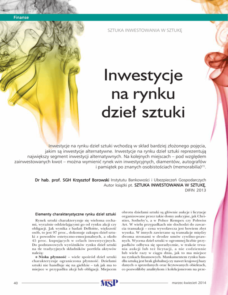Finanse SZTUKA INWESTOWANIA W SZTUKĘ Inwestycje na rynku dzieł sztuki Inwestycje na rynku dzieł sztuki wchodzą w skład bardziej złożonego pojęcia, jakim są inwestycje alternatywne. Inwestycje na rynku dzieł sztuki reprezentują największy segment inwestycji alternatywnych. Na kolejnych miejscach – pod względem zainwestowanych kwot – można wymienić rynek win inwestycyjnych, diamentów, autografów i pamiątek po znanych osobistościach (memorabilia)(1). Dr hab. prof. SGH Krzysztof Borowski Instytutu Bankowości i Ubezpieczeń Gospodarczych Autor książki pt. SZTUKA INWESTOWANIA W SZTUKĘ SZTUKĘ, DIFIN 2013 Elementy charakterystyczne rynku dzieł sztuki Rynek sztuki charakteryzuje się wieloma cechami, wyraźnie oddzielającymi go od rynku akcji czy obligacji. Jak wynika z badań Delloitte, większość osób, to jest 97 proc., dokonuje zakupu dzieł sztuki z powodów estetyczno-emocjonalnych, a około 45 proc. kupujących w celach inwestycyjnych. Do podstawowych wyróżników rynku dzieł sztuki na tle tradycyjnych składników portfela aktywów należą: C Niska płynność – wiele spośród dzieł sztuki charakteryzuje ograniczona płynność. Dziełami sztuki nie handluje się na giełdzie – tak jak ma to miejsce w przypadku akcji lub obligacji. Miejscem 40 40 obrotu dziełami sztuki są głównie aukcje i licytacje organizowane przez takie domy aukcyjne, jak Christies, Sotheby’s, a w Polsce Rempex czy Polswiss Art. W wielu przypadkach nie dochodzi do zawarcia transakcji – cena wywoławcza jest bowiem zbyt wysoka. W innych zawierane są transakcje między dwoma stronami w drodze umów cywilno-prawnych. Wycena dzieł sztuki w ogromnej liczbie przypadków odbywa się sporadycznie, w trakcie trwania aukcji lub też licytacji, a nie codziennie lub wiele razy w ciągu dnia, jak to ma miejsce na rynkach finansowych. Mankamentem rynku handlu sztuką jest brak globalnej czy nawet krajowej bazy danych o sprzedanych oraz licytowanych obiektach, co pozwoliłoby analitykom i kolekcjonerom na prze- marzec-kwiecień marzec-kwiecień 2014 2014 Finanse prowadzanie pogłębionych analiz. O rynku kolekcjonerskim mówi się, że jest to rynek 3D. Określenie pochodzi od pierwszych liter angielskich słów opisujących sytuację, kiedy przedmiot pojawia się na aukcji: 1. Death – śmierć kolekcjonera. Spadkobiercy dokonują sprzedaży odziedziczonych aktywów. 2. Debts – długi. Kolekcjoner w obliczu bankructwa decyduje się na sprzedaż dzieła. 3. Divorce – rozwód. Przedmiot kolekcjonerski pojawia się na aukcji w momencie przeprowadzania przez parę rozwodu i podziału majątku. C Trudność określenia wartości rynkowej inwestycji – czasem, kiedy konieczne staje się określenie ceny, należy dokonać jej oszacowania. Jeśli w trakcie aukcji lub licytacji, cena przedmiotu nie osiągnęła nawet wartości wywoławczej, nadal nie jest znana rynkowa wartość przedmiotu. W nielicznych przypadkach dochodzi do zawarcia po licytacji tzw. transakcji warunkowej, tj. po niższej cenie niż cena wywoławcza – pod warunkiem, że oferta złożona przez kolekcjonera zostanie zaakceptowana przez właściciela dzieła – w tym przypadku można także mówić o ustaleniu ceny rynkowej dzieła sztuki. C Dłuższy horyzont inwestycyjny – inwestycje na tym rynku charakteryzują się długim horyzontem inwestycyjnym – w przypadku wielu klas inwestycji alternatywnych, często wieloletnim (przyjmuje się, że na rynku obrazów minimalny horyzont inwestycyjny wynosi około pięciu lat). Na pewno nie jest to rynek przeznaczony dla spekulantów, którzy w ciągu kilku godzin czy dni chcieliby uzyskać bardzo wysoką stopę zwrotu. marzec-kwiecień marzec-kwiecień 2014 2014 Utrzymywanie inwestycji przez wiele lat oraz niska płynność są rekompensowane przez wyższe stopy zwrotu realizowane w dłuższych horyzontach czasowych. C Nieregularność przepływów pieniężnych generowanych przez dzieła sztuki – z uwagi na fakt, iż jest to mało płynny rynek, również przychody finansowe z tytułu sprzedaży tych aktywów nie mogą być z góry zaplanowane. C Rynek wymagający dużej wiedzy – ta cecha jest doskonale widoczna na rynku kolekcjonerskim (zwłaszcza na rynku pasji). Kolekcjonerzy muszą opanować ogromny zasób wiedzy w wąskiej dziedzinie zanim staną się w niej ekspertami. Zanim zaczną odróżniać falsyfikaty od prawdziwych przedmiotów, a także zanim będą dobrze orientować się we wszystkich detalach i szczegółach zbieranych przedmiotów. Po latach żmudnych studiów będą umieli także określić ich przybliżoną wartość rynkową. C Ograniczenia w dostępie do informacji – pewna grupa inwestorów zawsze będzie znajdowała się w pozycji uprzywilejowanej w stosunku do innych (asymetria informacji). Fakt ten jest główną przyczyną występowania nieefektywności rynków inwestycji alternatywnych (a zwłaszcza kolekcjonerskiego). Jednak w ostatnich latach obserwuje się coraz szerszy dostęp do informacji, głównie za sprawą Internetu. Wcześniej informacje o cenach uzyskiwanych przez dzieła sztuki w trakcie licytacji nie były publikowane lub też były udostępniane jedynie w katalogach poszczególnych domów aukcyjnych. Nie ma natomiast informacji na temat cen sprzedaży w galeriach dzieł sztuki. C Występowanie inwestorów nie maksymalizujących zysku – są to inwestorzy gotowi zapłacić wysoką cenę, aby tylko wejść w posiadanie upragnionego przedmiotu – przykładowo zapaleni kolekcjonerzy, muzea, a także banki. Ci pierwsi są gotowi wywindować notowania do niebotycznych poziomów, aby nabyć obiekt swoich pożądań, na który czekali wiele 41 41 Finanse lat zanim pojawił się na aukcji. Muzea posiadają dużą siłę nabywczą – często inwestorzy prywatni nie mogą konkurować z nimi w trakcie licytacji. Banki z kolei dokonują zakupu dzieł sztuki głównie w celach inwestycyjnych – ich kolekcje liczą w wielu przypadk
