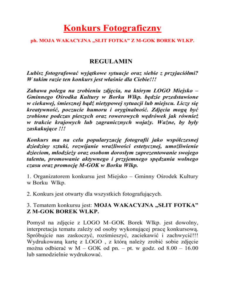 Konkurs Fotograficzny ph. MOJA WAKACYJNA „SŁIT FOTKA” Z M-GOK BOREK WLKP. REGULAMIN Lubisz fotografować wyjątkowe sytuacje oraz siebie z przyjaciółmi? W takim razie ten konkurs jest właśnie dla Ciebie!!! Zabawa polega na zrobieniu zdjęcia, na którym LOGO Miejsko – Gminnego Ośrodka Kultury w Borku Wlkp. będzie przedstawione w ciekawej, śmiesznej bądź nietypowej sytuacji lub miejscu. Liczy się kreatywność, poczucie humoru i oryginalność. Zdjęcia mogą być zrobione podczas pieszych oraz rowerowych wędrówek jak również w trakcie krajowych lub zagranicznych wojaży. Ważne, by były zaskakujące !!! Konkurs ma na celu popularyzację fotografii jako współczesnej dziedziny sztuki, rozwijanie wrażliwości estetycznej, umożliwienie dzieciom, młodzieży oraz osobom dorosłym zaprezentowanie swojego talentu, promowanie aktywnego i przyjemnego spędzania wolnego czasu oraz promocję M-GOK w Borku Wlkp. 1. Organizatorem konkursu jest Miejsko – Gminny Ośrodek Kultury w Borku Wlkp. 2. Konkurs jest otwarty dla wszystkich fotografujących. 3. Tematem konkursu jest: MOJA WAKACYJNA „SŁIT FOTKA” Z M-GOK BOREK WLKP. Pomysł na zdjęcie z LOGO M–GOK Borek Wlkp. jest dowolny, interpretacja tematu zależy od osoby wykonującej pracę konkursową. Spróbujcie nas zaskoczyć, rozśmieszyć, zaciekawić i zachwycić!!! Wydrukowaną kartę z LOGO , z którą należy zrobić sobie zdjęcie można odbierać w M – GOK od pn. – pt. w godz. od 8.00 – 16.00 lub samodzielnie wydrukować. Logo w wysokiej rozdzielczości (przeznaczone do druku), dostępne również pod TYM LINKIEM. Pamiętajcie - liczy się oryginalna koncepcja!!! kluczem do wygranej w konkursie!!! Kreatywność jest Zdjęcia poddane obróbce graficznej nie będą brały udziału w konkursie. 4. Każdy z autorów może dostarczyć dowolną ilość fotografii. 5. Do konkursu dopuszcza się wyłącznie prace dostarczone na nośniku elektronicznym – płyta CD/DVD. (fotografie winny być oznaczone numerem i tytułem zgodnym z kartą zgłoszenia) 6. Opisane płyty CD/DVD (w sposób umożliwiający identyfikację uczestnika konkursu,) wraz z kartą zgłoszenia (karta do pobrania ze strony internetowej www.mgok.borekwlkp.pl ) należy nadsyłać do M – GOK Borek Wlkp. (ul. Powstańców Wlkp. 4) 7. Do prac konkursowych należy dołączyć oświadczenie o posiadaniu praw autorskich do zdjęć oraz zgodę na przetwarzanie danych osobowych . 8. Z chwilą nadesłania fotografie przechodzą na własność organizatora, który przejmuje autorskie prawa do nadesłanych prac. 10. Zdjęcia należy nadsyłać do dnia 29.08.2014 roku. Rozstrzygnięcie konkursu nastąpi podczas obchodów „Zakończenia Lata”. 11. Oceny zdjęć dokona jury powołane przez organizatora. Decyzje jury są ostateczne. 12. Wszyscy laureaci zostaną powiadomieni o werdykcie jury telefonicznie. 13.Wszystkie prace będą opublikowane w witrynie www.mgok.borekwlkp.pl , na Facebooku oraz zostaną zaprezentowane w formie pokazu multimedialnego podczas Koncertu z okazji Dnia Kobiet w dniu 08.03.2015 14. Udział w konkursie jest jednoznaczny z nieodpłatnym udzieleniem prawa do wykorzystywania prac w następujących polach eksploatacji: druku w dowolnej liczbie publikacji i w dowolnym nakładzie, używania ich w Internecie oraz w innych formach utrwaleń. 15. Organizator przewiduje nagrody rzeczowe dla wyróżnionych autorów zdjęć. 16. Nadesłanie prac oznacza akceptację warunków konkursu i regulaminu, którego ostateczna interpretacja należy do jury konkursu. Konkurs Fotograficzny ph. MOJA WAKACYJNA „SŁIT FOTKA” Z M-GOK BOREK WLKP. KARTA ZGŁOSZENIA Imię i nazwisko …………………………... Wiek ........................................................... Adres........................................................... Telefon;....................................................... e-mail:............................................................ Tytuły zdjęć 1. ............................................................ 2. ............................................................ 3. ............................................................ 4. ……………………………………… 5. ……………………………………… 6. ……………………………………… 7. ……………………………………… 8. ……………………………………… 1.Oświadczam, że jestem autorem zdjęć zgłoszonych do konkursu. 2. Posiadam zezwolenie na rozpowszechnianie wizerunku sfotografowanych osób na potrzeby konkursu. 3. Uznaję warunki regulaminu oraz wyrażam zgodę na publikowanie moich danych osobowych na potrzeby związane z realizacją konkursu - zgodnie z ustawą z dnia 28.08.1997r. o ochronie danych osobowych ( Dz. U. Nr 133 poz. 883) podpis........................ data……………….
