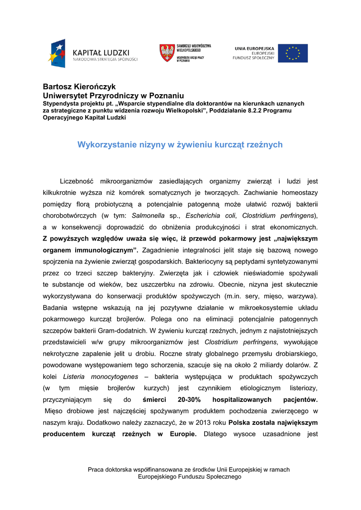 Bartosz Kierończyk Uniwersytet Przyrodniczy w Poznaniu Stypendysta projektu pt. „Wsparcie stypendialne dla doktorantów na kierunkach uznanych za strategiczne z punktu widzenia rozwoju Wielkopolski”, Poddziałanie 8.2.2 Programu Operacyjnego Kapitał Ludzki Wykorzystanie nizyny w żywieniu kurcząt rzeźnych Liczebność mikroorganizmów zasiedlających organizmy zwierząt i ludzi jest kilkukrotnie wyższa niż komórek somatycznych je tworzących. Zachwianie homeostazy pomiędzy florą probiotyczną a potencjalnie patogenną może ułatwić rozwój bakterii chorobotwórczych (w tym: Salmonella sp., Escherichia coli, Clostridium perfringens), a w konsekwencji doprowadzić do obniżenia produkcyjności i strat ekonomicznych. Z powyższych względów uważa się więc, iż przewód pokarmowy jest „największym organem immunologicznym”. Zagadnienie integralności jelit staje się bazową nowego spojrzenia na żywienie zwierząt gospodarskich. Bakteriocyny są peptydami syntetyzowanymi przez co trzeci szczep bakteryjny. Zwierzęta jak i człowiek nieświadomie spożywali te substancje od wieków, bez uszczerbku na zdrowiu. Obecnie, nizyna jest skutecznie wykorzystywana do konserwacji produktów spożywczych (m.in. sery, mięso, warzywa). Badania wstępne wskazują na jej pozytywne działanie w mikroekosystemie układu pokarmowego kurcząt brojlerów. Polega ono na eliminacji potencjalnie patogennych szczepów bakterii Gram-dodatnich. W żywieniu kurcząt rzeźnych, jednym z najistotniejszych przedstawicieli w/w grupy mikroorganizmów jest Clostridium perfringens, wywołujące nekrotyczne zapalenie jelit u drobiu. Roczne straty globalnego przemysłu drobiarskiego, powodowane występowaniem tego schorzenia, szacuje się na około 2 miliardy dolarów. Z kolei Listeria monocytogenes – bakteria występująca w produktach spożywczych (w tym mięsie przyczyniającym brojlerów się do kurzych) jest czynnikiem śmierci 20-30% etiologicznym hospitalizowanych listeriozy, pacjentów. Mięso drobiowe jest najczęściej spożywanym produktem pochodzenia zwierzęcego w naszym kraju. Dodatkowo należy zaznaczyć, że w 2013 roku Polska została największym producentem kurcząt rzeźnych w Europie. Dlatego wysoce uzasadnione Praca doktorska współfinansowana ze środków Unii Europejskiej w ramach Europejskiego Funduszu Społecznego jest poszukiwanie innowacyjnych metod poprawy zdrowotności kurcząt, zmniejszenia frekwencji mikroorganizmów chorobotwórczych jak również poprawy ekonomiki chowu tych zwierząt. Mechanizmy działania jak i pozytywny wpływ bakterii probiotycznych na organizm zwierząt i człowieka jest dobrze poznany. Natomiast, w dostępnej literaturze często niedoceniane są efekty bakteriocyn, które pośrednio stosuje się w żywieniu ludzi od czasów starożytnych. Uzasadnione jest to faktem, iż wiele bakterii fermentacji mlekowej, wykorzystywanych w produkcji serów czy jogurtów wytwarza te antybakteryjne peptydy. Aktywność przewód bakteriocynogenną pokarmowy wykazują człowieka i również zwierząt mikroorganizmy zasiedlające w tym kurcząt rzeźnych. Jednak w piśmiennictwie naukowym istnieje niewiele informacji na temat wykorzystania preparatów zawierających bakteriocyny w odchowie drobiu. Z powyższych względów sformułowano następujące hipotezy badawcze: 1. Zastosowanie nizyny (E234) w żywieniu kurcząt rzeźnych pozytywnie wpłynie na mikrobiom przewodu pokarmowego. 2. Redukcja drobnoustrojów potencjalnie chorobotwórczych przyczyni się do poprawy wskaźników odchowu, dobrostanu i zdrowotności brojlerów kurzych. Głównym zamysłem badań realizowanych w ramach omawianej pracy doktorskiej było sporządzenie utylitarnego a jednocześnie innowacyjnego projektu. Jego praktyczne zastosowanie ma charakter zarówno lokalny (na terenie województwa Wielkopolskiego), jak europejski gdyż dużą część produkcji drobiarskiej (jaja, mięso) jest eksportowana do wielu krajów UE. EKONOMIA PRODUKCJI DROBIARSKIEJ Przemysł drobiarski w Polsce lokuje się w ścisłej czołówce na tle państw Europy. Produkcja piskląt kurcząt rzeźnych sięga ponad 780 mln. szt. (2012 r.). W br. (styczeńwrzesień) zanotowano wzrost wylęgów kurcząt rzeźnych na poziomie +12,7% (tj. 74,3 mln. szt.) w porównaniu do roku ubiegłego. Analizy handlu wykazują, iż w tym samym okresie wielkość eksportu piskląt wyniosła 55,3 mln. szt., odpowiednio o 10 mln. szt. więcej niż w minionym roku. Specyfika odchowu kurcząt rzeźnych tj. 35/42 dni, szybkie tempo wzrostu, wymusza na producentach przedsięwzięcie środków profilaktyki oraz podwyższenia zdrowotności zwierząt. Wystąpienie infekcji w stadzie kurcząt skutkuje drastycznymi kosztami ekonomicznymi, niejednokrotnie utylizacją całego rzutu. Szacuje się, iż roczne straty związane, tylko i wyłącznie, z kokcydiozą sięgają ok. 120 mln zł w skali kraju. Z powyższych względów podjęcie badań poprawiających wyniki odchowu drobiu a jednocześnie polepszających bezpieczeństwo łańcucha pokarmowego przez eliminację np. Salmonella sp. są istotnym problemem w nowoczesnej produkcji drobiarskiej. Praca doktorska współfinansowana ze środków Unii Europejskiej w ramach Europejskiego Funduszu Społecznego OCHRONA ŚRODOWISKA Salinomycyna i inne kokcydiostatyki jonoforowe bądź chemiczne obecnie wykorzystywane w prewencji weterynaryjnej, są preparatami wykazującymi działanie antybiotyczne, mogącymi wpływać na skażenie biosfery. Spowodowane jest to częstością trafiania ich metabolitów do środowiska wraz z pomiotem stosowanym do nawożenia pól. Równocześnie kałomocz używany jest w produkcji przemysłowej pieczarek (sektor spożywczy). Ze względu na kumulację antybiotyków w organizmie zwierzęcym, nakłada się konieczność stosowania okresu karencji. Z powyższych względów zjawisko lekooporności i konieczność poszukiwania alternatywnych rozwiązań dla użycia antybiotyków jest j