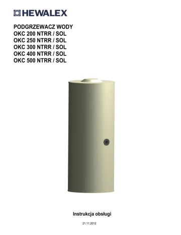 PODGRZEWACZ WODY OKC 200 NTRR / SOL OKC 250 NTRR / SOL OKC 300 NTRR / SOL OKC 400 NTRR / SOL OKC 500 NTRR / SOL Instrukcja obsługi 21.11.2012 Przed instalacją pogrzewacza należy uważnie przeczytać niniejszą instrukcję! Szanowny kliencie, Spółdzielcze Zakłady Dražice - strojírna Sp. z o.o. dziękują za korzystanie z produktu naszej marki. Za pośrednictwem niniejszej instrukcji zaznajomimy Państwa z wykorzystaniem, konstrukcją, montażem i konserwacją oraz dalszymi informacjami o ciśnieniowym pogrzewaczu wody serii OKC. Niezawodność i bezpieczeństwo produktu zostało potwierdzone przez testy przeprowadzone przez Instytut Badań Urządzeń Maszynowych w Brnie. Mamy nadzieję, że nasz produkt w spełni Państwa oczekiwania. Producent zastrzega sobie prawo do technicznej zmiany produktu. Produkt przeznaczony jest do stałego kontaktu z wodą pitną (użytkową). UWAGA! Podgrzewacz powinien być zamontowany w pomieszczeniu o temp. powietrza +2 do 45 °C i wilgotności względnej powietrza maksymalnie 80%. 1. PRZEZNACZENIE Podgrzewacz OKC NTRR / SOL posiada dwie spiralne wężownice i może służyć do podgrzewania wody użytkowej energią cieplną z kolektorów słonecznych i energią cieplną z kotła CO. 2. OPIS TECHNICZNY Zbiornik pogrzewacza wykonany jest z stalowej blachy i poddany próbie szczelności przy nadciśnieniu 1 MPa. Wnętrze podgrzewacza jest emaliowane. Podgrzewacz posiada w środkowej części króciec GW 6/4” do wkręcenia grzałki elektrycznej. Zbiornik wody jest izolowany przy użyciu twardej pianki poliuretanowej. 1. 2. 3. 4. 5. 6. 7. 8. 9. 10. 11. Zbiornik podwójnie emaliowany Termometr przylgowy Izolacja + płaszcz Króciec grzałki elektrycznej Odbiór ciepłej wody Anoda magnezowa Wężownica dla kotła CO Czujnik temperatury dla kotła CO Cyrkulacja Wężownica dla kolektorów słonecznych Czujnik temperatury dla kolektorów słonecznych 12. Zasilanie zimnej wody 21.11.2012 3. DANE TECHNICZNE OKC 200 NTRR / SOL, OKC 250 NTRR / SOL OKC 300 NTRR / SOL, OKC 400 NTRR / SOL, OKC 500 NTRR / SOL Typ Króciec przyłączeniowy OKC200 NTRR / SOL OKC250 NTRR / SOL Króciec przyłączeniowy OKC300 NTRR / SOL Króciec przyłączeniowy OKC400 NTRR / SOL OKC500 NTRR / SOL A B C D E F G H I J K L GZ ¾” GZ 1” GW ½” GZ 1” GZ 1” GW ¾” GW ¾” GZ 1” GZ ¾” - 81 211 357 519 651 711 922 1019 1281 1382 691 - 84 214 360 654 1005 894 1105 1334 1464 1558 716 - GZ ¾” GZ 1” GW ½” GW ¾” GZ 1” GZ 1” GW ¾” GZ 1” GZ ¾” - 74 205 370 755 905 1015 1165 1323 1674 1790 949 251 GZ 1” GZ 1” GW ½” GZ 1” GW ¾” GZ 1” GW ½” GZ 1” GZ 1” - 79 329 514,5 944 1194 1094 1289 1446 1798,5 1919 1005 304 55 220 380 965 1264 1114 1409 1604 1790 1892 1040 288 Typ podgrzewacza Średnica wewnętrzna, mm Średnica zewnętrzna, mm Wysokość całkowita, mm Ciśnienie max. w zbiorniku, MPa Ciśnienie max. w wężownicy, MPa Maksymalna temp. wody, °C Zalecana temp. wody, °C Powierzchnia wymiennika górnego, m2 Powierzchnia wymiennika dolnego, m2 Waga, kg OKC200 NTRR / SOL 500 603 1382 1 1 95 65 0,8 0,8 106 OKC250 NTRR / SOL 500 603 1532 1 1 95 65 1 1 120 21.11.2012 OKC300 NTRR / SOL 500 603 1790 1 1 95 65 0,8 1,2 125 OKC400 NTRR / SOL 550 650 1919 1 1 95 65 1,1 1,9 135 OKC500 NTRR / SOL 600 700 1892 1 1 95 65 1,4 2,0 144 4. PODŁĄCZENIE PODGRZEWACZA DO INSTALACJI WODY UŻYTKOWEJ Podłączenie pogrzewacza do instalacji zimnej wody jest przedstawione na rys.1. Ciepła woda 1 Rys. 1 3 4 Zimna woda 1 2 3 4 2 Zawór odcinający Zawór bezpieczeństwa + zawór zwrotny Naczynie przeponowe (min.12dm3) Zawór spustowy Pogrzewacz musi być wyposażony w zawór bezpieczeństwa o maksymalnym ciśnieniu otwarcia podanym na tabliczce znamionowej naklejonej na podgrzewaczu. Zawór bezpieczeństwa zamontować na dopływie zimnej wody. Między pogrzewaczem a zaworem bezpieczeństwa nie może się znajdować żaden zawór odcinający. W trakcie montażu należy postępować zgodnie z instrukcją producenta urządzenia zabezpieczającego. Przed uruchomieniem instalacji sprawdzić działanie zaworu bezpieczeństwa poprzez jego otwarcie. W trakcie normalnej eksploatacji należy dokonywać kontroli co najmniej raz na miesiąc. Z zaworu bezpieczeństwa może wyciekać woda przez rurkę wyciekową, dlatego rurka musi być swobodnie otwarta, umieszczona pionowo w dół i być w otoczeniu, w którym nie występują temperatury poniżej zera. Aby zapobiec wyciekaniu wody między podgrzewaczem a zaworem bezpieczeństwa zamontować należy naczynie przeponowe o ciśnieniu wstępnym równym ciśnieniu panującym w sieci wodociągowej. W przypadku występowania w instalacji wodociągowej ciśnienia równego lub wyższego niż ciśnienie otwarcia zaworu bezpieczeństwa, należy dodatkowo zamontować reduktor ciśnienia wody przed zaworem bezpieczeństwa. Aby zapobiec ewentualnemu poparzeniu się gorącą wodą, na wyjściu wody z podgrzewacza zamontować zawór mieszający antypoparzeniowy. W celu łatwego opróżnienia podgrzewacza z wody na zasilaniu zimnej wody zamontować zawór spustowy. Instalacje muszą być wykonane zgodnie z obowiązującymi przepisami. W celu poprawnego ustawienia zaworu redukcyjnego zalecamy, aby ciśnienie w podgrzewaczu było o 20% niższe, niż ciśnienie otwarcia zaworu bezpieczeństwa. 21.11.2012 5. PODŁĄCZENIE POGRZEWACZA DO INSTALACJI GRZEWCZYCH Podłączenie pogrzewacza do instalacji grzewczych jest przedstawione na rys.2. Na dopływie i odpływie wody grzewczej jest zalecane zamontowanie zaworów zamykających (na wypadek potrzeby demontażu pogrzewacza). Zawory powinny być zamontowane jak najbliżej pogrzewacza w celu wykluczenia większych strat ciepła. Obieg grzewczy trzeba podłączyć do oznaczonych dopływów i odpływów wymiennika pogrzewacza i w najwyższym miejscu zamontować zawór odpowietrzający. W celu ochrony pomp, zaworu trójdrożnego, zaworów zwrotnych i zapobiegania osadom w wymienniku należy wyposażyć