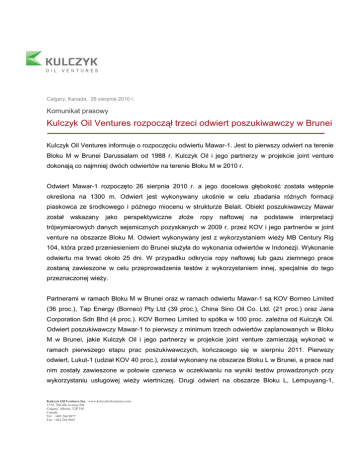 Calgary, Kanada, 26 sierpnia 2010 r. Komunikat prasowy Kulczyk Oil Ventures rozpoczął trzeci odwiert poszukiwawczy w Brunei Kulczyk Oil Ventures informuje o rozpoczęciu odwiertu Mawar-1. Jest to pierwszy odwiert na terenie Bloku M w Brunei Darussalam od 1988 r. Kulczyk Oil i jego partnerzy w projekcie joint venture dokonają co najmniej dwóch odwiertów na terenie Bloku M w 2010 r. Odwiert Mawar-1 rozpoczęto 26 sierpnia 2010 r. a jego docelowa głębokość została wstępnie określona na 1300 m. Odwiert jest wykonywany ukośnie w celu zbadania różnych formacji piaskowca ze środkowego i późnego miocenu w strukturze Belait. Obiekt poszukiwawczy Mawar został wskazany jako perspektywiczne złoże ropy naftowej na podstawie interpretacji trójwymiarowych danych sejsmicznych pozyskanych w 2009 r. przez KOV i jego partnerów w joint venture na obszarze Bloku M. Odwiert wykonywany jest z wykorzystaniem wieży MB Century Rig 104, która przed przeniesieniem do Brunei służyła do wykonania odwiertów w Indonezji. Wykonanie odwiertu ma trwać około 25 dni. W przypadku odkrycia ropy naftowej lub gazu ziemnego prace zostaną zawieszone w celu przeprowadzenia testów z wykorzystaniem innej, specjalnie do tego przeznaczonej wieży. Partnerami w ramach Bloku M w Brunei oraz w ramach odwiertu Mawar-1 są KOV Borneo Limited (36 proc.), Tap Energy (Borneo) Pty Ltd (39 proc.), China Sino Oil Co. Ltd. (21 proc.) oraz Jana Corporation Sdn Bhd (4 proc.). KOV Borneo Limited to spółka w 100 proc. zależna od Kulczyk Oil. Odwiert poszukiwawczy Mawar-1 to pierwszy z minimum trzech odwiertów zaplanowanych w Bloku M w Brunei, jakie Kulczyk Oil i jego partnerzy w projekcie joint venture zamierzają wykonać w ramach pierwszego etapu prac poszukiwawczych, kończacego się w sierpniu 2011. Pierwszy odwiert, Lukut-1 (udział KOV 40 proc.), został wykonany na obszarze Bloku L w Brunei, a prace nad nim zostały zawieszone w połowie czerwca w oczekiwaniu na wyniki testów prowadzonych przy wykorzystaniu usługowej wieży wiertniczej. Drugi odwiert na obszarze Bloku L, Lempuyang-1, Kulczyk Oil Ventures Inc. www.kulczykoilventures.com 1170, 700-4th Avenue SW Calgary, Alberta, T2P 3J4 Canada Tel: +403 264 8877 Fax: +403 264 8861 rozpoczął się 15 lipca i trwa do chwili obecnej. KOV Brunei Limited- pośredni podmiot zależny Kulczyk Oil ma 40 proc. udział w Bloku L i w każdym z dwóch odwiertów- Lukut-1 i Lempuyang-1. Aktywa Kulczyk Oil Kulczyk Oil to międzynarodowa spółka prowadząca poszukiwania ropy naftowej i gazu. Posiada zdywersyfikowane portfolio projektów w Brunei, Syrii i Ukrainie oraz profil ryzyka obejmujący działalność poszukiwawczą w Brunei i Syrii oraz działalność wydobywczą w Ukrainie. W Brunei KOV posiada udziały w prawie użytkowania górniczego, przyznanego mu zgodnie z dwoma umowami o podziale wpływów z wydobycia, uprawniającą do poszukiwania i wytwarzania ropy i gazu ziemnego z Bloku L i Bloku M. KOV posiada 40 proc. udział w Bloku L, obejmującym obszar lądowy i morski 2 o powierzchni 2 220 km (550.000 akrów) w północnym Brunei oraz 36 proc. udział w Bloku M, obejmującym 2 obszar lądowy o powierzchni 3.011 km (744.000 akrów) w południowym Brunei. Na Ukrainie KOV posiada faktyczny 70 proc. udział w KUB-Gas LLC. Aktywa KUB-Gas obejmują 100procentowe udziały w czterech koncesjach zlokalizowanych w pobliżu Ługańska, miasta w północnowschodniej części Ukrainy. W Syrii KOV posiada bezpośrednio 75 proc. udział w umowie o podziale wpływów z wydobycia, uprawniającej 2 do poszukiwania i wydobycia ropy i gazu ziemnego w obszarze Bloku 9 o powierzchni 10.032 km , położonego w północno-zachodniej Syrii. Wiodący akcjonariusz spółki, Kulczyk Investments S.A., zwiększył swoje zaangażowanie poprzez udział w IPO spółki na Giełdzie Papierów Wartościowych w Warszawie w maju 2010 r. i konwersję skryptu dłużnego i posiada obecnie niemal 50 procent udziału w kapitale spółki. Kulczyk Investments S.A. jest międzynarodowym domem inwestycyjnym, założonym przez polskiego przedsiębiorcę dr. Jana Kulczyka. Więcej informacji można uzyskać odwiedzając witrynę internetową Kulczyk Oil (www.kulczykoilventures.com) lub kontaktując się z: Kulczyk Oil Ventures Inc. – Kanada Norman W. Holton Vice Chairman Tel: +1-403-264-8877 E-mail:[email protected] www.kulczykoilventures.com Kulczyk Oil Ventures Inc. –Polska Jakub Korczak Vice President Investor Relations Managing Director CEE Tel.: +48 22 522 31 50 E-mail: [email protected] www.kulczykoil.com Tłumaczenie: Niniejszy tekst stanowi tłumaczenie informacji prasowej powstałej oryginalnie w języku angielskim. Stwierdzenia dotyczące przyszłości (Forward-looking Statements) Niniejsza informacja prasowa zawiera stwierdzenia dotyczące zdarzeń, które mają nastąpić po publikacji niniejszej informacji, odnoszące się do przyszłych działań w ramach odwiertu Mawar-1, odwiertu Lukut-1 i odwiertu Lempuyang-1 oraz do całości działań poszukiwawczych w Brunei oraz do wszelkich innych informacji, które nie stanowią danych historycznych. Mimo że przedstawiciele Spółki uznają założenia zawarte w stwierdzeniach dotyczących przyszłości za racjonalne, potencjalne wyniki sugerowane w powyższych stwierdzeniach odznaczają się znacznym poziomem ryzyka i niepewności, i nie można stwierdzić, że faktyczne rezultaty okażą się zgodne z powyższymi stwierdzeniami dotyczącymi przyszłości. Do czynników, które mogą uniemożliwić bądź utrudnić ukończenie spodziewanych działań Spółki, zaliczają się: prawdopodobieństwo wystąpienia problemów technicznych i mechanicznych w trakcie realizacji projektów, zmiany cen produktów, nieuzyskanie wymaganych prawem zgód, sytuacja finansowa na rynku lokalnym i międzynarodowym, jak również ryzyka związane z ropą naftową i gazem, ryzyka finansowe, polityczne i gospodarcze oraz wszelkie inne ryzyka nieprzewidziane przez Spó