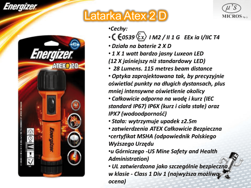 Latarka Atex 2 D •Cechy: • 0539 I M2 / II 1 G EEx ia I/IIC T4 • Działa na baterie 2 X D • 1 X 1 watt bardzo jasny Luxeon LED (12 X jaśniejszy niż standardowy LED) • 28 Lumens. 115 metres beam distance • Optyka zaprojektowana tak, by precyzyjnie oświetlad punkty na długich dystansach, plus mniej intensywne oświetlenie okolicy • Całkowicie odporna na wodę i kurz (IEC standard IP67) IP6X (kurz i ciała stałe) oraz IPX7 (wodoodpornośd) • Stała: wytrzymuje upadek z2.5m • zatwierdzenia ATEX Całkowicie Bezpieczna •certyfikat MSHA (odpowiednik Polskiego Wyższego Urzędu •u Górniczego -US Mine Safety and Health Administration) • UL zatwierdzona jako szczególnie bezpieczna w klasie - Class 1 Div 1 (najwyższa możliwa ocena)