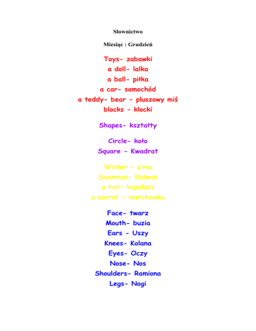 Słownictwo Miesiąc : Grudzień Toys- zabawki a doll- lalka a ball- piłka a car- samochód a teddy- bear - pluszowy miś blocks - klocki Shapes- kształty Circle- koło Square - Kwadrat Winter - zima Snowman- Bałwan a hat- kapelusz a carrot - marchewka Face- twarz Mouth- buzia Ears - Uszy Knees- Kolana Eyes- Oczy Nose- Nos Shoulders- Ramiona Legs- Nogi