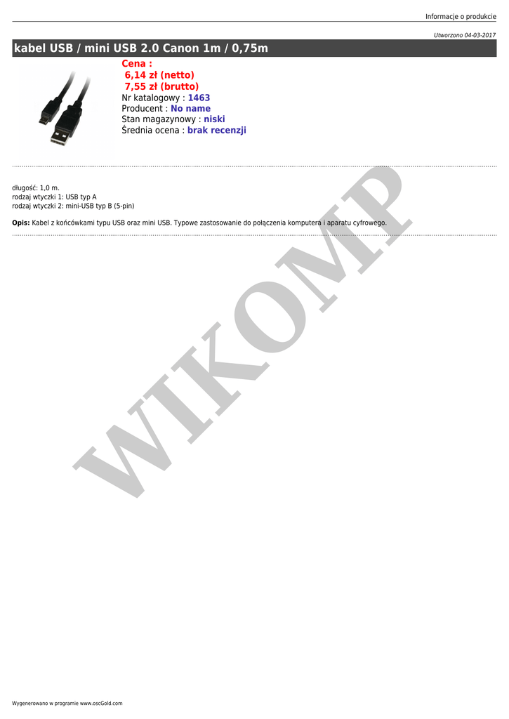Informacje o produkcie Utworzono 04-03-2017 kabel USB / mini USB 2.0 Canon 1m / 0,75m Cena : 6,14 zł (netto) 7,55 zł (brutto) Nr katalogowy : 1463 Producent : No name Stan magazynowy : niski Średnia ocena : brak recenzji P długość: 1,0 m. rodzaj wtyczki 1: USB typ A rodzaj wtyczki 2: mini-USB typ B (5-pin) W IK O M Opis: Kabel z końcówkami typu USB oraz mini USB. Typowe zastosowanie do połączenia komputera i aparatu cyfrowego. Wygenerowano w programie www.oscGold.com