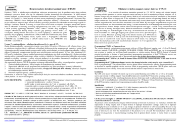 Bezprzewodowy detektor kontaktronowy CTX3H Detektor CTX3H z wbudowanym nadajnikiem radiowym przeznaczony jest do przekazywania drogą radiową informacji o otwarciu drzwi, okna itp. do odbiornika systemu alarmowego lub dozorowania. W skład zestawu wchodzi nadajnik z umieszczonymi wewnątrz kontaktronami (bocznym i czołowym) oraz magnes. Zasilany jest z baterii 12V typ GP23A, która pozwala na około roczną eksploatację w typowym zastosowaniu. Wyłącznik antysabotażowy TAMPER włącza nadajnik przy próbie odkręcenia obudowy. Każdorazowe rozwarcie kontaktronu (to jest odsunięcie magnesu) bądź otwarcie obudowy powoduje przesłanie do odbiornika zakodowanego sygnału radiowego. Transmisja trwa ok. 2 sekundy, a w tym czasie świeci dioda w nadajniku. Następuje przełączenie przekaźnika w odbiorniku na dowolny, wcześniej zaprogramowany czas od 0,5 s do 4 godzin. Słabą baterię w nadajniku CTX3H (<8,5V) sygnalizują odbiorniki CH4H, CH8H i CH20H. Przy współpracy z innymi odbiornikami baterię należy wymienić gdy przestaje świecić dioda LED ON 1 2 3 w nadajniku. Przełącznikiem DIP ustawia się kanał współpracy z odbiornikiem (patrz 1 2 rysunek). Przy współpracy z odbiornikiem CH4H, CH8H lub CH20H kanał pracy ustala się w odbiorniku, a w nadajniku należy wybrać kanał 1. W przypadku odbiornika 3 4 UMB100H oraz AN200H należy w CTX3H wybrać kanał 1, dla DWB100H oraz DW200H - kanał 1 lub 2. Uwaga: Przynajmniej jedna z sekcji przełącznika musi być w pozycji ON. Zasięg działania nadajnika w przestrzeni otwartej wynosi około 100 metrów. Żelbetonowe lub wilgotne ściany i stropy, metalowe ościeżnice i drzwi, zakłócenia od instalacji elektrycznych itp. mogą znacznie ograniczyć zasięg. Przed wykonaniem trwałej instalacji należy przeprowadzić próby potwierdzające pewność połączenia nadajnika z odbiornikiem. Zwiększenie zasięgu można uzyskać przez przylutowanie przewodu antenki (18 cm linka miedziana 0,250,35 mm2 w izolacji) do wolnego punktu lutowniczego znajdującego się obok zacisku baterii (+). Luźno zwisającą antenkę należy wyprowadzić na zewnątrz robiąc wycięcie w obudowie. Detektor może służyć także jako uniwersalny nadajnik wyzwalany z zewnątrz – należy wówczas podłączyć się do punktów lutowniczych znajdujących się pod kontaktronem. Rozwarcie tych styków wyzwoli 2 sekundową transmisję. Aby wprowadzić detektor CTX3H do pamięci wybranego odbiornika Elmes należy wykonać poniższe czynności: 1. Zamknąć obudowę detektora i zbliżyć magnes do kontaktronu (np. zamknąć drzwi). 2. Wprowadzić odbiornik w tryb programowania nadajników (wg opisu zawartego w instrukcji odbiornika). 3. Pobudzić detektor do transmisji poprzez krótkie, trwające nie dłużej niż dwie sekundy, odsunięcie magnesu od kontaktronu (np. otwarcie drzwi). 4. Ponownie wykonać operację z punktu 3 powyżej. Dostarczone w zestawie wkręty z łbem wpuszczanym służą do mocowania obudowy detektora, natomiast wkręty z łbem płaskim - do mocowania magnesu. DANE TECHNICZNE: - zasilanie baterią alkaliczną 12V typu GP23A, rok pracy w typowym zastosowaniu, - 2 wyłączniki kontaktronowe - czołowy i boczny, - pobór prądu: w stanie spoczynku - ok. 7 uA, w transmisji - ok. 10mA; - transmisja radiowa z mocą poniżej 5mW, częstotliwość 433,92 MHz., CE. - praca w pomieszczeniach zamkniętych i suchych w temperaturze od 0 do +40 C. - maksymalna odległość magnesu od obudowy detektora wynosi 10 mm. PRODUCENT: ELMES ELEKTRONIK, 54-611 Wrocław, ul. Avicenny 2, tel. (071) 784-59-61, fax 784-59-63, GWARANCJA: Producent udziela gwarancji na okres 1 roku od daty zakupu urządzenia i zobowiązuje się do jego każdorazowej bezpłatnej naprawy, jeżeli w okresie gwarancyjnym wystąpią wady z winy producenta. Wadliwe urządzenie należy dostarczyć do miejsca zakupu w stanie czystym i na własny koszt wraz z niniejszą gwarancją z potwierdzoną datą zakupu i krótkim opisem uszkodzenia. Gwarancja nie obejmuje baterii oraz wszelkich uszkodzeń powstałych w wyniku nieprawidłowego użytkowania, samowolnych regulacji, uszkodzeń mechanicznych, przeróbek i napraw. Elmes Elektronik nie ponosi odpowiedzialności za ewentualne straty i szkody bezpośrednie lub pośrednie mogące powstać w wyniku nieprawidłowości w działaniu instalacji, systemów lub urządzeń, w których zastosowano jego produkty. Podstawa: Rozporządzenie Rady Ministrów z dnia 30 maja 1995r. Dz. U. Nr 64, poz. 328. CE: Atest Z.R.T.O.M. „TECHOM” nr 169/02, klasa B. IŁ - potwierdzenie zgodności nr 188/2001. Data i podpis sprzedawcy (pieczęć): ...................................................................................................................................... www.elmes.pl, [email protected] Elmes Elektronik 2004. Wszystkie prawa zastrzeżone Miniature wireless magnet contact detector CTX3H A set consists of miniature transmitter powered by 12V GP23A battery and external magnet providing reliable operation as wireless magnetic contact and may be used for monitoring of doors, windows, etc. It features average one-year operation on single battery. Built-in two reed contacts facilitate installation of the external magnet on either shorter or longer side of the transmitter. Dip-switch selector of operating channel and built-in tamper contacts are also provided. The internal reed contact stays closed (short-circuit) as long as the distance of the external magnet from the reed side of the transmitter is less than 10mm. By moving the magnet further away the reed contact disconnects and the transmitter starts lasting 2 seconds transmission of the hopping code including the code of the preselected channel. Tamper contacts when activated provide same type 2 seconds lasting alarm transmission as in the case of moving the magnet away. When the transmission is ended the CTX3H disconnects power supply saving the battery life even the magnet is still away. All 