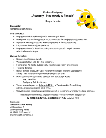 Konkurs Plastyczny „Pszczoły i inne owady w filmach” Regulamin Organizator: Tarnobrzeski Dom Kultury Cele konkursu:  Propagowanie kultury kinowej wśród najmłodszych dzieci.  Nawiązanie poprzez formę plastyczną do twórczości filmowej oglądanej przez dzieci.  Wyrażanie własnego stosunku do świata przyrody w formie plastycznej.  Inspirowanie do własnej pracy twórczej.  Propagowanie wśród dzieci i młodzieży znaczenia pszczół i innych owadów w środowisku naturalnym. Wymogi formalne:  Konkurs ma charakter otwarty.  Wiek uczestników: od 3 do 18 lat (włącznie).  Format prac: A3 (kartka dużego bloku rysunkowego), formy przestrzenne.  Technika dowolna.  Należy zwrócić uwagę, aby użyte materiały nie ulegały trwałemu uszkodzeniu a farby i inne materiały nie powodowały sklejania się prac.  Praca powinna być opisana na odwrocie ww. poniższego wzoru: Imię i nazwisko Tytuł pracy, Tel. Kontaktowy  Termin składania prac: do 8 sierpnia 2016 r. w Tarnobrzeskim Domu Kultury w Dziale Organizacji Imprez, pokój nr 47.  Wszystkie prace niespełniające przedstawionych w regulaminie wymogów nie będą oceniane. Rozstrzygnięcie konkursu, wręczenie nagród i otwarcie wystawy odbędzie się 12 sierpnia 2016 r., o godzinie 17.00 (duży holl TDK). Informacje: Tarnobrzeski Dom Kultury ul. Słowackiego 2 Dział Organizacji Imprez tel. 15 822 21 10, wew. 32 [email protected]