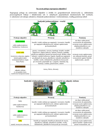 Na czym polega segregacja odpadów? Segregacja polega na sortowaniu odpadów u źródła (w gospodarstwach domowych) tj. oddzielaniu poszczególnych frakcji i składowaniu ich w odrębnych pojemnikach (kontenerach) lub workach, w zależności od rodzaju zabudowy (budynki jednorodzinne i wielorodzinne), według poniższej tabeli budynki jednorodzinne - worki Frakcja odpadów worki zielone szkło opakowaniowe bezbarwne i kolorowe worki żółte tworzywa sztuczne, papier, metal,opakowania wielomateriałowe (typu Tetra Pack) Wrzucaj Pamiętaj butelki i słoiki szklane po napojach i żywności, butelki po napojach alkoholowych, szklane opakowania po kosmetykach nie tłucz szkła przed wrzuceniem do pojemnika, wrzucaj czyste opakowania, zdejmuj plastikowe czy metalowe nakrętki gazety, czasopisma, zeszyty, katalogi, książki, torebki papierowe, papier pakowy, tekturę, kartony, pudełka, puszki po napojach, puszki po konserwach, drobny złom żelazny i metale kolorowe, kapsle, butelki po napojach, po płynach do mycia, plastikowe zakrętki, plastikowe torebki, worki, reklamówki, plastikowe koszyczki po owocach, pojemniki np. z jogurtu, śmietany itp., kartony z mleka, przetworów, soków wrzucaj czyste opakowania, nie zakręcaj butelek, przed wrzuceniem zgnieć butelki, opakowania, puszki worki brązowe odpady zielone trawę, liście, chwasty (w przypadku braku możliwości kompostowania) budynki wielorodzinne - kontenery i worki na odpady zielone Frakcja odpadów biały szkło opakowaniowe bezbarwne zielony szkło opakowaniowe kolorowe żółty metal, tworzywa sztuczne, Wrzucaj Pamiętaj butelki i słoiki szklane po napojach i żywności, butelki po napojach alkoholowych, szklane opakowania po kosmetykach nie tłucz szkła przed wrzuceniem do pojemnika, wrzucaj czyste opakowania, zdejmuj plastikowe czy metalowe nakrętki butelki i słoiki szklane po napojach i żywności, butelki po napojach alkoholowych, szklane opakowania po kosmetykach nie tłucz szkła przed wrzuceniem do pojemnika, wrzucaj czyste opakowania, zdejmuj plastikowe czy metalowe nakrętki butelki po napojach, butelki po płynach do mycia, plastikowe zakrętki, plastikowe torebki, worki, reklamówki, plastikowe koszyczki po owocach, wrzucaj czyste opakowania, zgnieć butelki i opakowania przed wrzuceniem, nie opakowania wielomateriałowe (typu Tetra Pack) niebieski papier pojemniki np. z jogurtu, śmietany itp., kartony z mleka, przetworów, soków zakręcaj butelek gazety, czasopisma, zeszyty, katalogi, książki, torebki papierowe, papier pakowy, pudełka, tekturę, kartony worki brązowe odpady zielone trawę, liście, chwasty (w przypadku braku możliwości kompostowania) Pozostałe odpady należy gromadzić w pojemnikach przeznaczonych do zmieszanych odpadów komunalnych. Jakie konsekwencje grożą mieszkańcom, którzy deklarując segregowanie odpadów w rzeczywistości tego nie robią? Selektywne zbieranie odpadów komunalnych jest obowiązkiem wynikającym z regulaminu utrzymania czystości i porządku w gminie. Niedopełnienie tego obowiązku jest wykroczeniem, zagrożonym karą grzywny. Zasady odbioru odpadów W zamian za uiszczoną opłatę firma wywozowa na zlecenie Gminy realizować będzie odbiór odpadów komunalnych bezpośrednio od właścicieli nieruchomości zamieszkałych, według następujących zasad: - w budownictwie jednorodzinnym: a) odpadów komunalnych zmieszanych zgromadzonych w pojemnikach – raz w tygodniu, b) odpadów komunalnych selektywnie zebranych zgromadzonych w workach foliowych - raz w miesiącu: • zielonych - szkło opakowaniowe bezbarwne i kolorowe, • żółtych - papier, metal, tworzywa sztuczne, opakowania wielomateriałowe (typu TetraPack), c) odpadów wielkogabarytowych, zużytego sprzętu elektrycznego i elektronicznego, zużytych opon wyłącznie z pojazdów osobowych – dwa razy w roku, według harmonogramu, który podany zostanie na stronie internetowej Gminy oraz tablicach ogłoszeń. - w budownictwie wielorodzinnym: a) odpadów komunalnych zmieszanych zgromadzonych w pojemnikach – cztery razy w tygodniu, b) odpadów komunalnych selektywnie zebranych zgromadzonych w pojemnikach - dwa razy w miesiącu: • biały – szkło opakowaniowe bezbarwne, • zielony – szkło opakowaniowe kolorowe, • żółty – metal, tworzywa sztuczne, opakowania wielomateriałowe (typu TetraPack) • niebieski - papier c) odpadów wielkogabarytowych, zużytego sprzętu elektrycznego i elektronicznego, zużytych opon wyłącznie z pojazdów osobowych – raz w tygodniu Ponadto firma wywozowa zorganizuje punkt selektywnego zbierania odpadów komunalnych, do którego każdy właściciel nieruchomości zamieszkałej będzie mógł przywieść bez dodatkowej opłaty następujące rodzaje odpadów: • papier, • metal, • tworzywa sztuczne, • szkło, • opakowania wielomateriałowe (typu TetraPack), • zużyte baterie i akumulatory, • przeterminowane leki i chemikalia, • • • • • zużyty sprzęt elektryczny i elektroniczny, odpady wielkogabarytowe, zużyte opony wyłącznie z pojazdów osobowych, budowlane i rozbiórkowe w ilości do 200 kg na mieszkańca rocznie z danej nieruchomości, odpady zielone (trawa, liście, chwasty) w workach foliowych koloru brązowego w ilości do 1 m 3 (10 worków) na nieruchomość rocznie. Za odpady budowlane, rozbiórkowe oraz zielone dostarczone do punktu selektywnego zbierania odpadów w ilościach większych niż: • 200 kg na mieszkańca rocznie z danej nieruchomości - dla odpadów budowlanych i rozbiórkowych • 1m3 na nieruchomość rocznie - dla odpadów zielonych mieszkaniec zapłaci dodatkową opłatę wynikającą z cennika firmy wywozowej. Punkt selektywnego zbierania odpadów czynny będzie od poniedziałku do piątku w godzinach od 700 do 2000 oraz w soboty w godzinach od 7 00 do 1400. Informacja o lokalizacji punktu selektywnego zbierania odpadów podana zostanie na stronie internetowej Gminy oraz umieszczona zostanie na tabl
