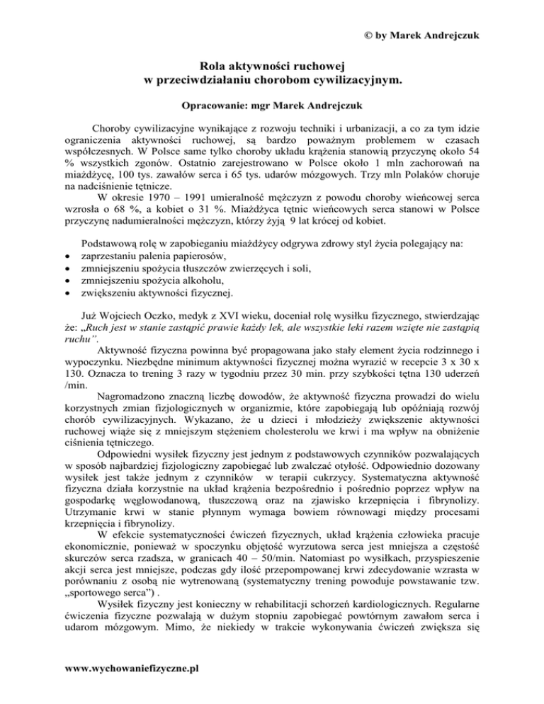 E\0DUHN$QGUHMF]XN 5RODDNW\ZQRFLUXFKRZHM ZSU]HFLZG]LDáDQLXFKRURERPF\ZLOL]DF\MQ\P 2SUDFRZDQLHPJU0DUHN$QGUHMF]XN &KRURE\ F\ZLOL]DF\MQH Z\QLNDMFH ] UR]ZRMX WHFKQLNL L XUEDQL]DFML DFR]DW\PLG]LH RJUDQLF]HQLD DNW\ZQRFL UXFKRZHM V EDUG]R SRZD*Q\P SUREOHPHP Z F]DVDFK ZVSyáF]HVQ\FK:3ROVFHVDPHW\ONRFKRURE\XNáDGXNU*HQLDVWDQRZL SU]\F]\Q RNRáR ZV]\VWNLFK ]JRQyZ 2VWDWQLR ]DUHMHVWURZDQR Z 3ROVFH RNRáR POQ ]DFKRURZD QD PLD*G*\F W\V]DZDáyZVHUFDLW\VXGDUyZPy]JRZ\FK7U]\POQ3RODNyZFKRUXMH QDQDGFLQLHQLHW WQLF]H : RNUHVLH ± XPLHUDOQRü P *F]\]Q ] SRZRGX FKRURE\ ZLHFRZHM VHUFD Z]URVáD R D NRELHW R 0LD*G*\FD W WQLF ZLHFRZ\FK VHUFD VWDQRZL Z 3ROVFH SU]\F]\Q QDGXPLHUDOQRFLP *F]\]QNWyU]\*\M ODWNUyFHMRGNRELHW x x x x 3RGVWDZRZ URO Z]DSRELHJDQLXPLD*G*\F\RGJU\ZD]GURZ\VW\O*\FLDSROHJDMF\QD ]DSU]HVWDQLXSDOHQLDSDSLHURVyZ ]PQLHMV]HQLXVSR*\FLDWáXV]F]yZ]ZLHU] F\FKLVROL ]PQLHMV]HQLXVSR*\FLDDONRKROX ]ZL NV]HQLXDNW\ZQRFLIL]\F]QHM -X* :RMFLHFK2F]NRPHG\N];9,ZLHNXGRFHQLDáURO Z\VLáNXIL]\F]QHJRVWZLHUG]DMF *HÄ5XFKMHVWZVWDQLH]DVWSLüSUDZLHND*G\OHNDOHZV]\VWNLHOHNLUD]HPZ]L WHQLH]DVWSL UXFKX´ $NW\ZQRüIL]\F]QDSRZLQQDE\üSURSDJRZDQDMDNRVWDá\HOHPHQW*\FLDURG]LQQHJRL Z\SRF]\QNX1LH]E GQHPLQLPXPDNW\ZQRFLIL]\F]QHMPR*QDZ\UD]LüZUHFHSFLH[[ 2]QDF]D WR WUHQLQJ UD]\ Z W\JRGQLX SU]H] PLQ SU]\ V]\ENRFL W WQD XGHU]H PLQ 1DJURPDG]RQR ]QDF]Q OLF]E GRZRGyZ *H DNW\ZQRü IL]\F]QD SURZDG]L GR ZLHOX NRU]\VWQ\FK ]PLDQ IL]MRORJLF]Q\FK Z RUJDQL]PLH NWyUH ]DSRELHJDM OXE RSy(QLDM UR]ZyM FKRUyE F\ZLOL]DF\MQ\FK :\ND]DQR *H X G]LHFL L PáRG]LH*\ ]ZL NV]HQLH DNW\ZQRFL UXFKRZHM ZL*H VL ] PQLHMV]\P VW *HQLHP FKROHVWHUROX ZH NUZL L PD ZSá\Z QD REQL*HQLH FLQLHQLDW WQLF]HJR 2GSRZLHGQLZ\VLáHNIL]\F]Q\MHVWMHGQ\P]SRGVWDZRZ\FKF]\QQLNyZSR]ZDODMF\FK ZVSRVyEQDMEDUG]LHMIL]MRORJLF]Q\]DSRELHJDüOXE]ZDOF]DüRW\áRü2GSRZLHGQLRGR]RZDQ\ Z\VLáHN MHVW WDN*H MHGQ\P ] F]\QQLNyZ Z WHUDSLL FXNU]\F\ 6\VWHPDW\F]QD DNW\ZQRü IL]\F]QD G]LDáD NRU]\VWQLH QD XNáDG NU*HQLD EH]SRUHGQLR L SRUHGQLR SRSU]H] ZSá\Z QD JRVSRGDUN Z JORZRGDQRZ WáXV]F]RZ RUD] QD ]MDZLVNR NU]HSQL FLD L ILEU\QROL]\ 8WU]\PDQLH NUZL Z VWDQLH Sá\QQ\P Z\PDJD ERZLHP UyZQRZDJL PL G]\ SURFHVDPL NU]HSQL FLDLILEU\QROL]\ : HIHNFLH V\VWHPDW\F]QRFL üZLF]H IL]\F]Q\FK XNáDG NU*HQLD F]áRZLHND SUDFXMH HNRQRPLF]QLH SRQLHZD* Z VSRF]\QNX REM WRü Z\U]XWRZD VHUFD MHVW PQLHMV]D D F] VWRü VNXUF]yZ VHUFD U]DGV]D Z JUDQLFDFK ± PLQ 1DWRPLDVW SR Z\VLáNDFK SU]\VSLHV]HQLH DNFML VHUFD MHVW PQLHMV]H SRGF]DV JG\ LORü SU]HSRPSRZDQHM NUZL ]GHF\GRZDQLH Z]UDVWD Z SRUyZQDQLX ] RVRE QLH Z\WUHQRZDQ V\VWHPDW\F]Q\ WUHQLQJ SRZRGXMH SRZVWDZDQLH W]Z ÄVSRUWRZHJRVHUFD´ :\VLáHNIL]\F]Q\MHVWNRQLHF]Q\ZUHKDELOLWDFMLVFKRU]H NDUGLRORJLF]Q\FK5HJXODUQH üZLF]HQLD IL]\F]QH SR]ZDODM Z GX*\P VWRSQLX ]DSRELHJDü SRZWyUQ\P ]DZDáRP VHUFD L XGDURP Py]JRZ\P 0LPR *H QLHNLHG\ Z WUDNFLH Z\NRQ\ZDQLD üZLF]H ]ZL NV]D VL ZZZZ\FKRZDQLHIL]\F]QHSO QLH]QDF]QLH U\]\NR Z\VWSLHQLD W\FK FKRUyE WR MHVW RQR QLHZVSyáPLHUQH GR RVLJDQ\FK NRU]\FL 2SUyF] EH]SRUHGQLHJR ZSá\ZX QD QDU]G NU*HQLD L V]HUHJ LQQ\FK XNáDGyZ V\VWHPDW\F]QD DNW\ZQRü UXFKRZD SRSUDZLD IXQNFMH SV\FKLF]QH F]áRZLHND 0DQLIHVWXMH VL WR OHSV]\P QDVWURMHP áDJRG]HQLHP VWDQyZ O NRZ\FK L GHSUHV\MQ\FK SRSUDZ SDPL FL L QHXWUDOL]RZDQLHPGROHJOLZRFL]ZL]DQ\FK]HVWUHVHP 3U]\ REHFQ\P VWDQLH ZLHG]\ QLH XOHJD ZWSOLZRFL *H RGSRZLHGQLR GR]RZDQ\ Z\VLáHN IL]\F]Q\ SURZDG]L GR REQL*HQLD Z VXURZLF\ ]DZDUWRFL FKROHVWHUROX D WDN*H WUyMJOLFHU\GyZ6SDGHNZVND(QLNyZOLSLGRZ\FKZVXURZLF\MHVWSURSRUFMRQDOQ\GRQDW *HQLD WUHQLQJX IL]\F]QHJR :L NV]Rü EDGDF]\ ]DMPXMF\FK VL ZSá\ZHP Z\VLáNX IL]\F]QHJR QD SU]HPLDQ\ PHWDEROLF]QH Z XVWURMX VWZLHUG]D *H GR]RZDQ\ Z\VLáHN IL]\F]Q\ R UHGQLP QDW *HQLX VWRVRZDQ\ SU]H] GáX*V]\ F]DV SURZDG]L GR NRU]\VWQ\FK ]PLDQ PHWDEROLF]Q\FK Z ]DNUHVLH QLH W\ONR OLSLGyZ XVWURMRZ\FK OHF] WDN*H SU]HPLDQ Z JORZRGDQRZ\FK áF]QLH ] NRU]\VWQ UHJXODFM Z\G]LHODQLDLQVXOLQ\LZUD*OLZRFLQDQL UHFHSWRUyZWNDQNRZ\FK 5R]SDWUXMF ]QDF]HQLH Z\VLáNX IL]\F]QHJR Z SURILODNW\FH L OHF]HQLX PHWDEROLF]Q\FK FKRUyE F\ZLOL]DF\MQ\FK QLH PR*QD RJUDQLF]\ü VL MHG\QLH GR OHG]HQLD ]PLDQ Z ]DNUHVLH JRVSRGDUNLOLSLGRZHMLZ JORZRGDQRZHM : ZLHWOH RVWDWQLFK EDGD QDG URO ZROQ\FK URGQLNyZ D ]ZáDV]F]D QDGWOHQNyZ OLSLGRZ\FKQDSRZVWDZDQLHLUR]ZyMFKRUyEF\ZLOL]DF\MQ\FKQDOH*\]ZUyFLüZL NV] XZDJ QD URO Z\VLáNX IL]\F]QHJR RUD] F]\QQLNyZ GLHWHW\F]Q\FK ]ZáDV]F]D ZLWDPLQ DQW\RNV\GDF\MQ\FK QD Z\*HM Z\PLHQLRQH SURFHV\ .D*G\ QDGPLHUQ\ ERG]LHF SU]\VSLHV]DMF\ SU]HPLDQ PDWHULL SURZDG]L GR ]ZL NV]HQLD VW *HQLD ZROQ\FK URGQLNyZ L QDGWOHQNyZ OLSLGRZ\FK NWyUH G]LDáDM GHVWUXNF\MQLH QD NRPyUNL XVWURMX -HVW WR MHGHQ ] PHFKDQL]PyZ SRZVWDZDQLD VFKRU]H Z Z\QLNX NWyU\FK QDVW SXM ]PLDQ\ QLHGRNUZLHQQH PDUWZLF]H ]DSDOQH SRXUD]RZH L ]Z\URGQLHQLRZH Z WNDQNDFK *\ZHJR RUJDQL]PX .D*G\ ERG]LHF ]ZL NV]DMF\ SR]LRP SHURNV\GDFML F]\OL ZROQ\FK URGQLNyZ L RVáDELDMF\ ]DVRE\ DQW\RNV\GDF\MQHZRUJDQL]PLHMHVWRNUHODQ\MDNR ERG]LHFVWUHVRZ\GODNRPyUNL :LHOXEDGDF]\VWZLHUG]LáRZ\UD(Q\Z]URVWQDGWOHQNyZOLSLGRZ\FKSRLQWHQV\ZQ\PL GáXJRWUZDá\P Z\VLáNX IL]\F]Q\P : ZLHWOH Z\*HM SU]\WRF]RQ\FK GDQ\FK MHVW WR ]MDZLVNR Z\VRFH QLH NRU]\VWQH GOD RUJDQL]PX 'ODWHJR ZD*Q\P ]DJDGQLHQLHP Z SURSDJRZDQLX DNW\ZQHJRVW\OX*\FLDMHVWRGSRZLHG( QDS\WDQLHMDNLSRZLQLHQE\üZ\VLáHNIL]\F]Q\E\QLH SU]\QRVLáXMHPQ\FKVNXWNyZ]GURZRWQ\FKGODXSUDZLDMFHJRüZLF]HQLDIL]\F]QH = OLF]Q\FK EDGD Z\QLND *H GOD RUJDQL]PX NRU]\VWQH MHVW V\VWHPDW\F]QH XPLDUNRZDQH SURZDG]HQLH üZLF]H IL]\F]Q\FK JLHU VSRUWRZ\FK PDUV]yZ QL* MHGQRUD]RZH GáXJRWUZDáH SRQDG PLDU REFL*DMFH üZLF]HQLD IL]\F]QH :\VLáHN WDNL SRZRGXMH Z RUJDQL]PLHVWUHVWOHQRZ\LJURPDG]HQLHVL ZROQ\FKURGQLNyZ %DGDQLDZ\ND]Dá\*HRGSRZLHGQLD]DZDUWRüZGLHFLHZLWDPLQ\(L&SU]HFLZG]LDáD QDGPLHUQHPXZ]URVWRZLQDGWOHQNyZOLSLGRZ\FKZXVWURMX 3U]HGVWDZLRQHSRZ\*HMGRZRG\QDWR*HZ\VLáHNIL]\F]Q\PR*HZ]QDF]Q\PVWRSQLX ]DSRELHJDü UR]ZRMRZL FKRUyE F\ZLOL]DF\MQ\FK GDM SRGVWDZ GR SURSDJRZDQLD KDVáD *H GREUH ]GURZLH ]DOH*\ RG QDV VDP\FK L QDV]HJR VW\OX *\FLD $ ZL F ]GURZHJR *\ZLHQLD DNW\ZQRFLUXFKRZHMQLHSDOHQLDW\WRQLXLQDGX*\ZDQLDDONRKROX 3RQDGWR PR*QD EH] SU]HVDG\ VWZLHUG]Lü *H GR]RZDQ\ L V\VWHPDW\F]Q\ Z\VLáHN IL]\F]Q\ Z ]QDF]Q\P VWRSQLX 