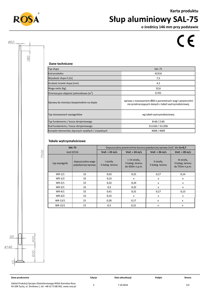 Karta produktu Słup aluminiowy SAL-75 o średnicy 146 mm przy podstawie Dane techniczne Typ słupa SAL-75 Kod produktu 42316 Wysokośd słupa H *m+ 7,5 Grubośd ścianki słupa *mm+ 4,2 Waga netto [kg] 32,6 Orientacyjna objętośd jednostkowa *m3] 0,331 oprawy z mocowaniem Ø60 o parametrach wagi i powierzchni nie przekraczających danych z tabeli wytrzymałościowej Oprawy do montażu bezpośrednio na słupie Typ stosowanych wysięgników wg tabeli wytrzymałościowej Typ fundamentu / kosza zbrojeniowego B-60 / Z-60 Kod fundamentu / kosza zbrojeniowego 311160 / 311206 Komplet elementów złącznych zwykłych / zrywalnych 4008 / 4009 Tabele wytrzymałościowe Dopuszczalna powierzchnia boczna pojedynczej oprawy [m2] dla Cx=0,7 SAL-75 kod 42316 Vref. = 22 m/s Vref. = 24 m/s Vref. = 26 m/s Vref. = 28 m/s typ wysięgnik dopuszczalna waga pojedynczej oprawy I strefa, II kateg. terenu I i III strefa, II kateg. terenu do 450m n.p.m. II strefa, II kateg. terenu III strefa, II kateg. terenu do 755m n.p.m. WR-1/1 15 0,42 0,31 0,17 0,14 WR-1/2 15 0,15 x x x WR-2/1 15 0,32 0,24 x x WR-3/1 15 0,3 0,22 x x WR-4/1 15 0,41 0,31 0,17 0,13 WR-4/2 15 0,15 x x x WR-13/1 15 0,28 0,17 x x WR-15/1 15 0,3 0,21 x x Dane producenta Zakład Produkcji Sprzętu Oświetleniowego ROSA Stanisław Rosa 43-109 Tychy, ul. Strefowa 1, tel. +48 32 73 88 901, www.rosa.pl Edycja Data aktualizacji 3 7.10.2014 Podpis Strona 1/2 Karta produktu Słup aluminiowy SAL-75 o średnicy 146 mm przy podstawie Tabele wytrzymałościowe Dopuszczalna powierzchnia boczna pojedynczej oprawy [m2] dla Cx=0,7 SAL-75 kod 42316 Vref. = 22 m/s Vref. = 24 m/s Vref. = 26 m/s Vref. = 28 m/s typ wysięgnik dopuszczalna waga pojedynczej oprawy I strefa, II kateg. terenu I i III strefa, II kateg. terenu do 450m n.p.m. II strefa, II kateg. terenu III strefa, II kateg. terenu do 755m n.p.m. WN-1 15 0,34 (Cx=1) 0,26 (Cx=1) 0,16 (Cx=1) 0,13 (Cx=1) WN-2 15 0,14 (Cx=1) x x x Dopuszczalna powierzchnia boczna opraw i wysięgników *m2] dla Cx=1 SAL-75 kod 42316 Vref. = 22 m/s Vref. = 24 m/s Vref. = 26 m/s Vref. = 28 m/s Dopuszczalna masa opraw i wysięgników [kg] I strefa, II kateg. terenu I i III strefa, II kateg. terenu do 450m n.p.m. II strefa, II kateg. terenu III strefa, II kateg. terenu do 755m n.p.m. 30 0,35 0,27 0,17 0,15 powierzchnia: aluminium szlifowane anodowanie w 10 kolorach, każdy z możliwością wybłyszczania opcja malowania proszkowego wg RAL (inne farby na życzenie klienta) zabezpieczenie elastomerem w kolorze słupa do wysokości 350 mm (inna wysokośd na życzenie klienta) wnęka standard ROSA pakowanie: włóknina polipropylenowa certyfikat bezpieczeostwa biernego 100NE2 Dane producenta Zakład Produkcji Sprzętu Oświetleniowego ROSA Stanisław Rosa 43-109 Tychy, ul. Strefowa 1, tel. +48 32 73 88 901, www.rosa.pl Edycja Data aktualizacji 3 7.10.2014 Podpis Strona 2/2