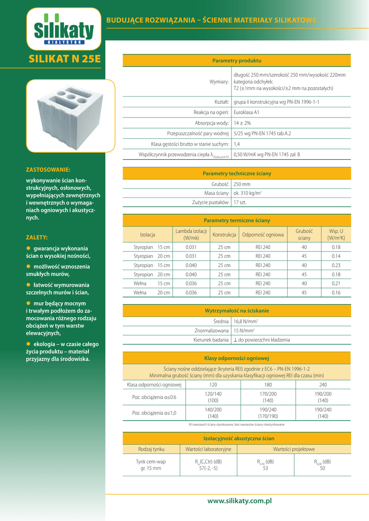 Budujące rozwiązania – Ścienne materiały silikatowe SILIKAT N 25e Parametry produktu długość 250 mm/szerokość 250 mm/wysokość 220mm Wymiary: kategoria odchyłek: T2 (±1mm na wysokości/±2 mm na pozostałych) Kształt: grupa II konstrukcyjna wg PN-EN 1996-1-1 Reakcja na ogień: Euroklasa A1 Absorpcja wody: 14 ± 2% Przepuszczalność pary wodnej 5/25 wg PN-EN 1745 tab.A.2 Klasa gęstości brutto w stanie suchym: 1,4 Współczynnik przewodzenia ciepła λ10,dry,unit P2 0,50 W/mK wg PN-EN 1745 zał. B Zastosowanie: Parametry techniczne ściany wykonywanie ścian konstrukcyjnych, osłonowych, wypełniających zewnętrznych i wewnętrznych o wymaganiach ogniowych i akustycznych. Zalety: Grubość 250 mm Masa ściany ok. 310 kg/m2 Zużycie pustaków 17 szt. Parametry termiczne ściany Izolacja Lambda izolacji (W/mk) Konstrukcja Odporność ogniowa Grubość sciany Wsp. U [W/m2K] z gwarancja wykonania ścian o wysokiej nośności, Styropian 15 cm 0.031 25 cm REI 240 40 0.18 Styropian 20 cm 0.031 25 cm REI 240 45 0.14 z możliwość wznoszenia smukłych murów, Styropian 15 cm 0.040 25 cm REI 240 40 0.23 Styropian 20 cm 0.040 25 cm REI 240 45 0.18 z łatwość wymurowania szczelnych murów i ścian, Wełna 15 cm 0.036 25 cm REI 240 40 0.21 Wełna 20 cm 0.036 25 cm REI 240 45 0.16 z mur będący mocnym i trwałym podłożem do zamocowania różnego rodzaju obciążeń w tym warstw elewacyjnych, Wytrzymałość na ściskanie Średnia 16,8 N/mm2 Znormalizowana 15 N/mm2 Kierunek badania ^ do powierzchni kładzenia z ekologia – w czasie całego życia produktu – materiał przyjazny dla środowiska. Klasy odporności ogniowej Ściany nośne oddzielające (kryteria REI) zgodnie z EC6 – PN-EN 1996-1-2 Minimalna grubość ściany (mm) dla uzyskania klasyfikacji ogniowej REI dla czasu (min) Klasa odporności ogniowej 120 180 240 Poz. obciążenia α≤0.6 120/140 (100) 170/200 (140) 190/200 (140) Poz. obciążenia α≤1,0 140/200 (140) 190/240 (170/190) 190/240 (140) W nawiasach ściany otynkowane, bez nawiasów ściany nieotynkowane Izolacyjność akustyczna ścian Rodzaj tynku Wartości laboratoryjne Cem-wap. 15 mm Tynk cem-wap lub gr. 15 mm gipsowy 10 mm Rw(C,Ctr) (dB) 57(-2, -5) Wartości projektowe RA1R (dB) 53 www.silikaty.com.pl RA2R (dB) 50 Budujące rozwiązania – Ścienne materiały silikatowe Produkty uzupełniające SILIKAT PW25/24 kl.15/250x240x220/ – pustak wentylacyjny do wykonywania pionów wentylacyjnych ø16 SILIKAT 3NFD Zaprawa do silikatu biała do murowania na cienką spoinę (od 1-3 mm) ścian konstrukcyjnych i działowych wewnątrz i na zewnątrz budynków, klasa ≥ 10 MPa. Zaprawa murarska – nadaje się do murowania kondygnacji nadziemnych. Grubość spoiny wykonanej z zaprawy murarskiej powinna wynosić od 6 do 40mm. Można jej używać wewnątrz i na zewnątrz budynków. Zaprawa jest mrozoodporna i wodoodporna, klasa ≥ 5 MPa. Łącznik K1, K2 – połączeń murów z konstrukcją żelbetową lub z istniejącym murem, a także do połączeń murów wykonanych z elementów o różnym module wysokości. Łącznik D1, D2 – Odpowiedniki łączników K1, K2 stosowanych w miejscach, gdzie konieczne jest zachowanie dylatacji między łączonymi elementami. Elementy do połączeń murów Łącznik DS, DS2 – do połączeń ścian wypełniających ze stropem z zachowaniem dylatacji. Łącznik D3 do połączeń fragmentów murów z zachowaniem dylatacji pionowej Łącznik P30 – do połączeń między ścianami z elementów o tym samym module wysokości (np. ściany działowe ze ścianami nośnymi). Zastępuje przewiązania murarskie między ścianami Kielnie do zaprawy cienkowarstwowej Dozowniki do zaprawy cienkowarstwowej www.silikaty.com.pl