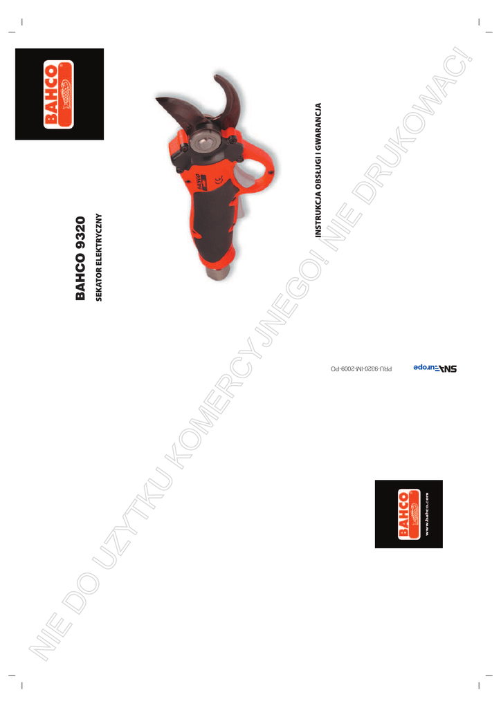 PRU-9320-IM-2009-PO BAHCO 9320 BAHCO 9320 BAHCO 9320 1 3 5 E 4 22 4 10 25 27 28 24 31 25 32 2 11 12 3 26 5 7 C K 30 I 33 29 9 13 6 8 8 B 23 24 21 16 14 17 34 35 15 36 19 18 37 38 61 6 62 D 63 64 65 66 67 7 41 68 A 1 2 42 69 71 43 44 45 46 70 57 58 56 47 48 J F G H 55 54 51 53 51/52 I BAHCO 9320 - 2009 IV 50 49 BAHCO 9320 - 2009 BAHCO 9320 SPIS TREŚCI OPIS I CZĘŚCI SKŁADOWE 2 ŚRODKI OSTROŻNOŚCI PODCZAS UŻYTKOWANIA 3 SERWIS SPRZEDAŻOWY I POSPRZEDAŻOWY 5 OPIS PRODUKTU 5 ROZPOCZĘCIE PRACY 6 PODŁĄCZENIE 6 URUCHOMIENIE I UŻYTKOWANIE 6 DYNAMICZNE CIĘCIE 7 ZMIANA PROGRAMU CIĘCIA 7 POWTARZAJĄCY CYKL CIĘCIA 7 WYŁĄCZENIE URZĄDZENIA 8 JAK UŻYWAĆ NARZĘDZIE 8 OCHRONA PRZED PRZECIĄŻENIEM 9 OKRESOWA KONSERWACJA 9 ZALECENIA POPRAWNEGO UŻYTKOWANIA 10 ŁADOWANIE BATERII 11 KONSERWACJA W TRAKCIE PRACY 13 PRZECHOWYWANIE 13 CHRAKTERYSTYKA TECHNICZNA 14 SYGNAŁY AKUSTYCZNE I DIAGNOSTYKA NIEPRAWIDŁOWOŚCI 15 CZĘŚCI ZAMIENNE 17 GWARANCJA 18 SNA Europe zastrzega sobie prawo do wprowadzania jakichkolwiek modyfikacji w produkcji lub koncepcji, w związku z rozwojem produktu. BAHCO 9320 - 2009 1 BAHCO 9320 OPIS I CZĘŚCI SKŁADOWE OZNACZENIE 2 NAZWA ILOŚĆ Α - SEKATOR ELEKTRYCZNY 1 Β - BATERIA ZASILAJĄCA 1 C - PANEL STERUJĄCY 1 D - PRZEWÓD ZASILAJĄCY 1 Ε - PRZEWÓD ŁĄCZĄCY PANEL STEROWANIA Z BATERIĄ 1 F - PŁYN CZYSZCZĄCY 1 G - OSEŁKA WĘGLIKOWA 1 Η - INSTRUKCJA I GWARANCJA 1 I - ŁADOWARKA BATERII 1 J - SKRZYNKA TRANSPORTOWA I DO PRZECHOWYWANIA 1 K - NOSIDEŁKO 1 1 - SPUST CIĘCIA - 2 - SPUST BEZPIECZEŃSTWA - 3 - SZYBKOZŁACZE ŁĄCZĄCE PANEL STERUJĄCY Z BATERIĄ - 4 - WYŁĄCZNIK ON/OFF - 5 - DIODA NA PANELU STERUJĄCYM - 6 - SZYBKOZŁACZE DO PODŁĄCZENIA PRZEWODU ZASILAJĄCEGO SEKATOR - 7 - SZYBKOZŁACZE DO PODŁĄCZENIA PRZEWODU ZASILAJĄCEGO Z BARERII - 8 - GNIAZDO WTYKOWE ŁADOWARKI - BAHCO 9320 - 2009 BAHCO 9320 ŚRODKI OSTROŻNOŚCI PODCZAS UŻYTKOWANIA Instukcja zawiera porady i informacje na temat poprawnego i bezpiecznego używania sekatora elektrycznego oraz jego konserwacji. Sekator elektryczny spełnia standardy bezpieczeństwa i wymogi UE odnośnie zgodności elektromagnetycznej, maszyn i niskiego napięcia. Przeczytaj dokładnie instrukcję uruchamiania urządzenia, jego odpowiedniego użytkowania i dostosuj się do zaleceń związanych z bezpieczeństwem. Zachowaj tą instrukcję i gwarancję, ponieważ zawierają ważne informacje na temat usług posprzedażowych włączając rysunki wyposażenia z poszczególnymi odniesieniami do zapasowych części.. Nie otwieraj pokrywy baterii: występuje niebezpieczeństwo porażenia prądem, 48V – 50/60 Hz – 20 A Obserwuj wskaźniki bezpieczeństwa, w które jest wyposażone urządzenie. Jest to niezbędne dla bezpieczeństwa pracy oraz dla uniknięcia niepotrzebnego ryzyka.. Noś rękawice ochronne. OSTRZEŻENIE: Nigdy nie wkładaj palców, rąk lub jakiejkolwiek innej części ciała pomiędzy ostrza sekatora. Używanie rękawic ochronnych nie ochroni przed poważnym urazem. W razie wypadku, natychmiast skontaktuj się ze służbą medyczną. Trzymaj dzieci i zwierzęta z dala od pracującego narzędzia. Noś okulary ochronne. Latające cząsteczki mogą spowodować obrażenia. Noś buty ochronne. Jeśli narzędzie upadnie, może spowodować obcięcia i inne urazy. Urządzenie jest chronione przeciwko rdzy i wilgoci. Nie należy jednak używać go w trakcie opadów deszczu lub gdy uprawy są zmrożone.. Stosuj się do instrukcji konserwacji. Po zakończonym sezonie cięcia wykonaj przegląd urządzenia w Serwisie Posprzedażowym. Regularne przeglądy muszą być dokonywane przez upoważniony do tego Serwis Posprzedażowy. Cięcie bardzo twardego drewna, np. grube chropowate sękate gałęzie, stare winorośla, może zakończyć się przeciążeniem i w konsekwencji zniszczeniem urządzenia. Może nastąpić poważne uszkodzenie uniemożliwiające poprawne działanie urządzenia. Te rodzaje uszkodzeń nie są objęte gwarancją. Maksymalna średnica cięcia to 25 do 35 mm (w zależności od rodzaju drewna i wieku ciętego materiału). Dla twardego drewna, takiego jak drewno pomarańczowe czy oliwne, maksymalna średnica cięcia będzie zależna od aktualnej mocy sekatora. Nie tnij tym sekatorem innych materiałów niż drewno. Cięcie innych materiałów może spowodować uszkodzenie (w szczególności ostrza) i będzie rozpatrywane jako nieprawidłowe użycie urządzenia. Gwarancja nie obejmuje żadnych uszkodzeń spowodowanych nieprawidłowym użyciem. Zawsze rozpoczynaj cięcie z całkowicie naładowaną baterią i zawsze ładuj ponownie, kiedy sygnał ostrzegawczy wskazuje niski poziom naładowania. Próba cięcia w momencie, gdy poziom naładowania baterii jest niski, może nieodwracalnie uszkodzić baterię.. Kontroluj urządzenie regularnie, aby mieć pewność, że w międzyczasie nie powstały żadne uszkodzenia.. Zawsze rozpoczynaj cięcie z całkowicie naładowaną baterią i zawsze ładuj ponownie, kiedy sygnał ostrzegawczy wskazuje niski poziom naładowania. Próba cięcia w momencie, gdy poziom naładowania baterii jest niski, może nieodwracalnie uszkodzić baterię. BAHCO 9320 - 2009 3 BAHCO 9320 ŚRODKI OSTROŻNOŚĆI PODCZAS UŻYTKOWANIA Trzymaj narzędzie poza zasięgiem dzieci. Użytkownicy pracujący sekatorami elektrycznymi muszą mieć ponad 16 lat i powinni być należycie nadzorowani przez instruktora lub wykwalifikowaną osobę. SNA EUROPE nie ponosi odpowiedzialności za jakiekolwiek zniszczenia lub wypadki spowodowane nieodpowiednim użyciem narzędzi lub niewłaściwych akcesoriów. Odłącz baterię i panel sterowania, kiedy sekator będzie przechowywany przez długi okres czasu (na przykład na koniec sezonu cięcia). Nie używaj urządzenia w pobliżu linii energetycznych. Umieszczone na wysięgniku musi mieć zachowany bezpieczny dystans w postaci dwukrotnej długości wysięgnika Bateria zawiera wodorotlenek potasu. Środek silnie żrący i powodujący korozję. W razie 