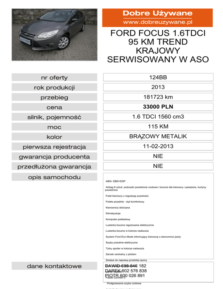 FORD FOCUS 1.6TDCI 95 KM TREND KRAJOWY SERWISOWANY W ASO 124BB 2013 181723 km 33000 PLN 1.6 TDCI 1560 cm3 115 KM BRĄZOWY METALIK 11-02-2013 NIE NIE ABS+ EBD+ESP Airbag 6 sztuk: poduszki powietrzne czołowe i boczne dla kierowcy i pasażera, kurtyny powietrzne Fotel kierowcy z regulacją wysokości Fotele przednie - styl komfortowy Kierownica skórzana Klimatyzacja Komputer pokładowy Lusterka boczne regulowane elektrycznie Lusterka boczne w kolorze nadwozia System Ford Eco Mode informujący kierowcę o ekonomice jazdy Szyby przednie elektryczne Tylny spoiler w kolorze nadwozia Zamek centralny z pilotem Zestaw do naprawy przebitej opony Koło zapasowe dojazdowe DAWID 698 846 182 DAREK Lakier metalik602 576 838 PIOTR 600 026 891 Pakiet Comfort 3 -Podgrzewana szyba czołowa