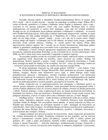 SZPITAL W BAGANDOU W KONTEKŚCIE REBELII W REPUBLICE ŚRODKOWOAFRYKAŃSKIEJ Początki obecnej rebelii w Republice Środkowoafrykańskiej (RCA) to koniec roku 2012, kiedy – jak to zwykle bywało – zaczęły się niepokoje na północy kraju. Północ RCA cierpi od dawna, sąsiedztwo z Czadem i Sudanem, tereny bogate w diamenty, złoto i ropę – wszystko to nie sprzyja pokojowi. Przez cały czas rządów Bozizégo były to tereny niebezpieczne, ale ponieważ w stolicy było spokojnie, więc nikt nie widział problemu. Wydaje mi się, że świadomość bycia jednym narodem i solidarność z rodakami – to uczucie obce Środkowafrykańczykom. Jeśli mają w jakiejś zagrożonej miejscowości rodzinę, to może się przejmują, ale żeby podjąć działanie np. w Bagandou, bo w Birao, czyli bardzo daleko stąd, coś się złego dzieje – „jamais” (nigdy – przyp. red.), jak się tu często mówi. Nigdy! Jeszcze długo tak będzie i ewidentnie jest to ich słabość, na której wielu żeruje i spokojnie prowadzi swoje ciemne interesy, wiedząc, że „ruchu oporu” nie będzie. Może jakiś opozycjonista napisze ognisty list i zawiesi go na stronie internetowej, dołączając piękne zdjęcie w garniturze, popijając przy tym dobre wino w paryskiej restauracji! Rebelianci z trzech różnych ugrupowań skupionych pod jedną nazwą Seleka czyli przymierze oskarżali prezydenta Bozizégo, że nie wywiązał się ze swoich zobowiązań z roku 2008 czy 2011, kiedy były różne zamieszki i niepokoje w tamtym regionie. Na początku grudnia zaczął się zwycięski marsz Seleki, atakowali miasto za miastem, siły regularnej armii okazywały się bezsilne, marsz posuwał się szybko. Widząc ich determinację, Bozizé poprosił o pomoc swego wiernego przyjaciela prezydenta z Czadu, który pomógł mu dojść do władzy 10 lat wcześniej. Ale cóż – czasy się zmieniają i ludzie też – owszem Czad przysłał swoich ludzi, ale zasilili oni znacznie szeregi Seleki. W akcję pojednania włączyła się cała grupa państw CEMAC – czyli Gabon, Czad, Kamerun, Gwinea Równikowa i Kongo Brazzaville. Były spotkania na szczycie, negocjacje, traktaty, rozejmy. Bozizé miał uformować nowy rząd, w skład którego mieli wejść przedstawiciele opozycji i rebeliantów, uwolnić więźniów politycznych i po skończonej kadencji nie startować do kolejnych wyborów. Przy okazji tych międzynarodowych spotkań nie brakowało krytyki pod adresem RCA, która kolejny już raz destabilizuje cały region, naraża na niebezpieczeństwo swoich sąsiadów, przysparza im kosztów, itd. Kiedy wydawało się, że niebezpieczeństwo jest zażegnane, a rebelianci gotowi na odwrót, pewne obietnice są powoli spełniane, wtedy prezydent Bozizé przypominał siebie o swoim wielkim jubileuszu czyli 10. rocznicy dojścia do władzy, również na drodze przewrotu i rebelii. Podczas jednego z wielu wygłoszonych przy tej okazji przemówień powiedział, że musiałaby być martwy, żeby nie startować w kolejnych wyborach. Czego trzeba więcej, żeby podgrzać atmosferę, a był to 15 marca 2013 roku i rebelianci stali już „u wrót” Bangui. Niedługo potem – 24 marca – wielki krzykacz uciekał przez rzekę do ex-Zairu, ratując swoją skórę. Najeźdźcy pokazali swoją siłę – ta Niedziela Palmowa były triumfalnym wjazdem Seleki do Bangui. Nie oszczędzili nawet katedry, w której kończyła się Msza św. Wpadła tam uzbrojona grupa, na powitanie strzelali w sufit i domagali się kluczyków od samochodów, które stały na placu. Arcybiskup Bangui od ołtarza nawoływał do uspokojenia i szacunku dla domu Bożego. Była to niedziela kradzieży, gwałtów i zabijania, niszczenia, a potem kolejne dni i kolejne, i kolejne… Tutejsza ludność jest przyzwyczajona do przewrotów, chyba większość prezydentów tak właśnie dochodziła do władzy. Scenariusz wydarzeń też jest podobny, coś się zaczyna burzyć i fermentować, czasami gdzieś od północy, czasami tylko w stolicy, potem jest godzina „W”, walki o pałac prezydencki, siedzibę sztabu wojskowego – lotnisko zwykle zostaje w rękach Francuzów – ucieczka obalonego i proklamowanie nowego. Zamieszki w stolicy zawsze są i zawsze towarzyszą temu kradzieże w sklepach, podpalenia i zniszczenia. Nie zawsze robią to tylko rebelianci, ale miejscowa ludność także. Zwykle jednak po tygodniu czy dwóch, jak to np. było 10 lat temu, sytuacja się normalizuje. Tym razem jest inaczej, kiedy piszę te słowa to już dokładnie 6 miesięcy „zamieszek” w stolicy i na terenie całego kraju. To jest nowość. Tego jeszcze tu nie było. Nie ma dnia bez pobitych, zgwałconych, zabitych, okradzionych, uciekinierów. Fala przemocy i zniszczenia przetoczyła się jak ciężka maszyna przez cały kraj. Nie ma miasta ani wioski, gdzie by Seleka nie dotarła i zostawiła tragicznych śladów przemocy. Nie tylko prezydent w popłochu uciekał ze stolicy, ale różni notable, dla których pełnione funkcje przy Obalonym to wyrok śmierci i pozbawienia majątku. Uciekali w rządowych samochodach, które gdzieś po drodze porzucali. Powstały więc specjalne grupy Seleki do odzyskiwania mienia państwowego, a tym samym dokładnie penetrowali kraj we wszystkich możliwych kierunkach. Pod takim też pretekstem i nasza misja w Bagandou była zwizytowana któregoś wieczoru na początku kwietnia przez dość liczną grupę uzbrojonych rebeliantów, którzy z krzykami po arabsku i łamanym francuskim z wymierzonymi karabinami domagali się otwarcia drzwi, choć do środka nie chcieli wejść. Spotkanie odbyło się przed domem, w ciemnościach, w świetle latarek pokazaliśmy dokumenty naszych samochodów misji i szpitala, potem sprawdzenie tablic i chwila grozy się skończyła. Poza tym jednym razem nikt nas więcej na misji ani w szpitalu nie niepokoił, jednak wieści, jakie ciągle dochodzą z różnych stron, nie dały zapomnieć, że jesteśmy w