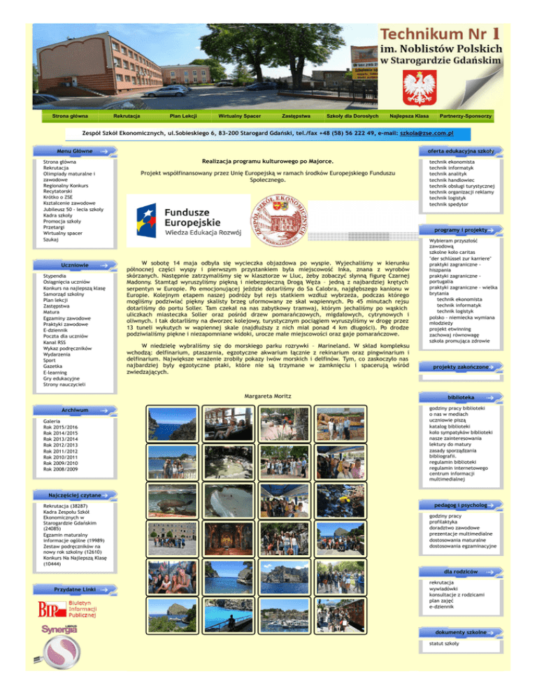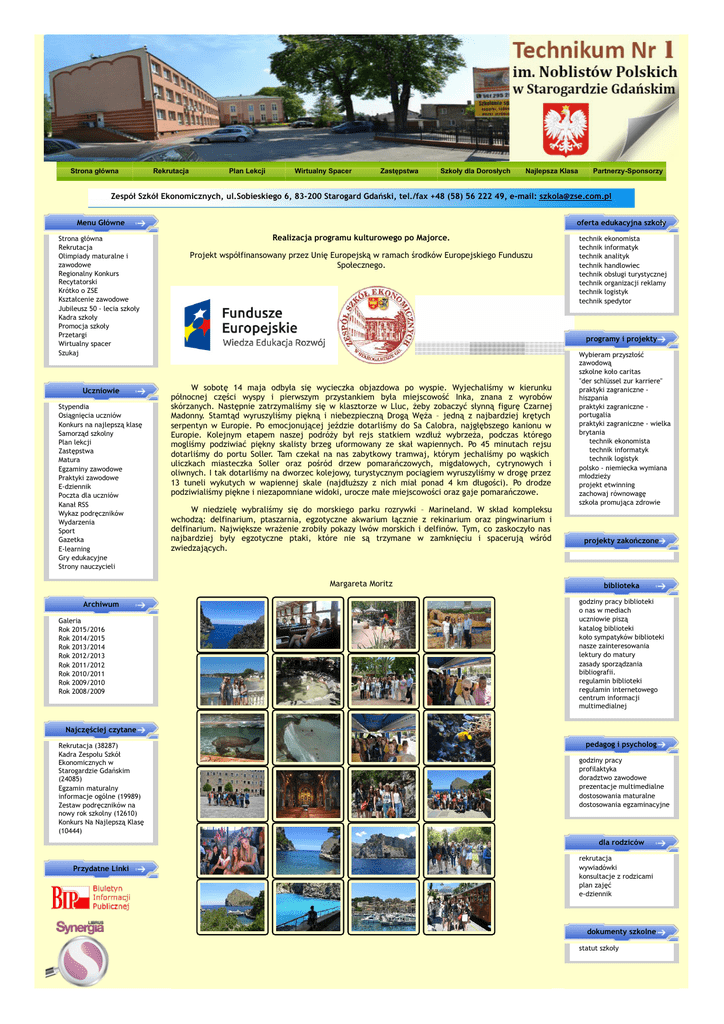 Strona główna Rekrutacja Plan Lekcji Wirtualny Spacer Zastępstwa Szkoły dla Dorosłych Najlepsza Klasa Partnerzy-Sponsorzy Zespół Szkół Ekonomicznych, ul.Sobieskiego 6, 83-200 Starogard Gdański, tel./fax +48 (58) 56 222 49, e-mail: [email protected] Menu Główne Strona główna Rekrutacja Olimpiady maturalne i zawodowe Regionalny Konkurs Recytatorski Krótko o ZSE Kształcenie zawodowe Jubileusz 50 - lecia szkoły Kadra szkoły Promocja szkoły Przetargi Wirtualny spacer Szukaj Uczniowie Stypendia Osiągnięcia uczniów Konkurs na najlepszą klasę Samorząd szkolny Plan lekcji Zastępstwa Matura Egzaminy zawodowe Praktyki zawodowe E-dziennik Poczta dla uczniów Kanał RSS Wykaz podręczników Wydarzenia Sport Gazetka E-learning Gry edukacyjne Strony nauczycieli oferta edukacyjna szkoły Realizacja programu kulturowego po Majorce. Projekt współfinansowany przez Unię Europejską w ramach środków Europejskiego Funduszu Społecznego. Galeria Rok 2015/2016 Rok 2014/2015 Rok 2013/2014 Rok 2012/2013 Rok 2011/2012 Rok 2010/2011 Rok 2009/2010 Rok 2008/2009 ekonomista informatyk analityk handlowiec obsługi turystycznej organizacji reklamy logistyk spedytor programy i projekty W sobotę 14 maja odbyła się wycieczka objazdowa po wyspie. Wyjechaliśmy w kierunku północnej części wyspy i pierwszym przystankiem była miejscowość Inka, znana z wyrobów skórzanych. Następnie zatrzymaliśmy się w klasztorze w Lluc, żeby zobaczyć słynną figurę Czarnej Madonny. Stamtąd wyruszyliśmy piękną i niebezpieczną Drogą Węża – jedną z najbardziej krętych serpentyn w Europie. Po emocjonującej jeździe dotarliśmy do Sa Calobra, najgłębszego kanionu w Europie. Kolejnym etapem naszej podróży był rejs statkiem wzdłuż wybrzeża, podczas którego mogliśmy podziwiać piękny skalisty brzeg uformowany ze skał wapiennych. Po 45 minutach rejsu dotarliśmy do portu Soller. Tam czekał na nas zabytkowy tramwaj, którym jechaliśmy po wąskich uliczkach miasteczka Soller oraz pośród drzew pomarańczowych, migdałowych, cytrynowych i oliwnych. I tak dotarliśmy na dworzec kolejowy, turystycznym pociągiem wyruszyliśmy w drogę przez 13 tuneli wykutych w wapiennej skale (najdłuższy z nich miał ponad 4 km długości). Po drodze podziwialiśmy piękne i niezapomniane widoki, urocze małe miejscowości oraz gaje pomarańczowe. W niedzielę wybraliśmy się do morskiego parku rozrywki – Marineland. W skład kompleksu wchodzą: delfinarium, ptaszarnia, egzotyczne akwarium łącznie z rekinarium oraz pingwinarium i delfinarium. Największe wrażenie zrobiły pokazy lwów morskich i delfinów. Tym, co zaskoczyło nas najbardziej były egzotyczne ptaki, które nie są trzymane w zamknięciu i spacerują wśród zwiedzających. Margareta Moritz Archiwum technik technik technik technik technik technik technik technik Wybieram przyszłość zawodową szkolne koło caritas "der schlüssel zur karriere" praktyki zagraniczne hiszpania praktyki zagraniczne portugalia praktyki zagraniczne - wielka brytania technik ekonomista technik informatyk technik logistyk polsko - niemiecka wymiana młodzieży projekt etwinning zachowaj równowagę szkoła promująca zdrowie projekty zakończone biblioteka godziny pracy biblioteki o nas w mediach uczniowie piszą katalog biblioteki koło sympatyków biblioteki nasze zainteresowania lektury do matury zasady sporządzania bibliografii. regulamin biblioteki regulamin internetowego centrum informacji multimedialnej Najczęściej czytane Rekrutacja (38287) Kadra Zespołu Szkół Ekonomicznych w Starogardzie Gdańskim (24085) Egzamin maturalny informacje ogólne (19989) Zestaw podręczników na nowy rok szkolny (12610) Konkurs Na Najlepszą Klasę (10444) pedagog i psycholog godziny pracy profilaktyka doradztwo zawodowe prezentacje multimedialne dostosowania maturalne dostosowania egzaminacyjne dla rodziców Przydatne Linki rekrutacja wywiadówki konsultacje z rodzicami plan zajęć e-dziennik dokumenty szkolne statut szkoły liczba odwiedzin odwiedziło nas: 2672019 imieniny Adrianny, Kazimierza, Wacława Do końca roku szkolnego pozostało 111 dni. przydatne linki europejski fundusz społeczny Tags WYDARZENIA PROJEKT KSZTAŁCENIE ZAWODOWE Zespół Szkół Ekonomicznych ul.Sobieskiego 6 83-200 Starogard Gdański tel./fax +48 (58) 56 222 49 e-mail: [email protected] Czas generowania strony: 0.212s.