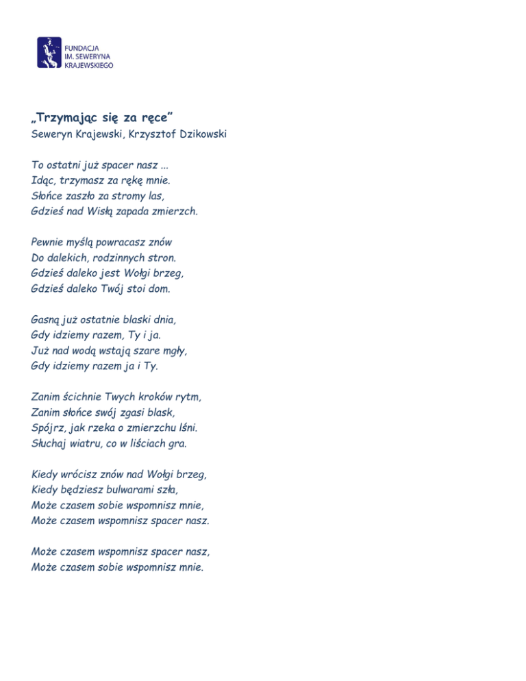 „Trzymając się za ręce” Seweryn Krajewski, Krzysztof Dzikowski To ostatni już spacer nasz ... Idąc, trzymasz za rękę mnie. Słońce zaszło za stromy las, Gdzieś nad Wisłą zapada zmierzch. Pewnie myślą powracasz znów Do dalekich, rodzinnych stron. Gdzieś daleko jest Wołgi brzeg, Gdzieś daleko Twój stoi dom. Gasną już ostatnie blaski dnia, Gdy idziemy razem, Ty i ja. Już nad wodą wstają szare mgły, Gdy idziemy razem ja i Ty. Zanim ścichnie Twych kroków rytm, Zanim słońce swój zgasi blask, Spójrz, jak rzeka o zmierzchu lśni. Słuchaj wiatru, co w liściach gra. Kiedy wrócisz znów nad Wołgi brzeg, Kiedy będziesz bulwarami szła, Może czasem sobie wspomnisz mnie, Może czasem wspomnisz spacer nasz. Może czasem wspomnisz spacer nasz, Może czasem sobie wspomnisz mnie.