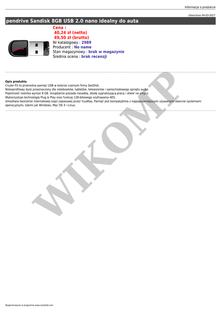 Informacje o produkcie Utworzono 04-03-2017 pendrive Sandisk 8GB USB 2.0 nano idealny do auta Cena : 40,24 zł (netto) 49,50 zł (brutto) Nr katalogowy : 2989 Producent : No name Stan magazynowy : brak w magazynie Średnia ocena : brak recenzji W IK O M P Opis produktu Cruzer Fit to przenośna pamięć USB w kolorze czarnym firmy SanDisk. Niskoprofilowy dysk przeznaczony dla notebooków, tabletów, telewizorów i samochodowego sprzętu audio Pojemność nośnika wynosi 8 GB. Urządzenie posiada nasadkę, diodę sygnalizującą pracę i otwór na smycz. Wykorzystuje technologię Plug & Play oraz funkcję 128-bitowego szyfrowania AES. Umożliwia tworzenie internetowej kopii zapasowej przez YuuWaa. Pamięć jest kompatybilna z najpopularniejszymi używanymi obecnie systemami operacyjnymi, takimi jak Windows, Mac OS X i Linux. Wygenerowano w programie www.oscGold.com