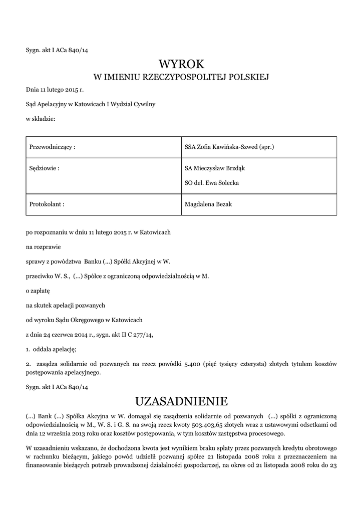 Sygn. akt I ACa 840/14 WYROK W IMIENIU RZECZYPOSPOLITEJ POLSKIEJ Dnia 11 lutego 2015 r. Sąd Apelacyjny w Katowicach I Wydział Cywilny w składzie: Przewodniczący : SSA Zofia Kawińska-Szwed (spr.) Sędziowie : SA Mieczysław Brzdąk SO del. Ewa Solecka Protokolant : Magdalena Bezak po rozpoznaniu w dniu 11 lutego 2015 r. w Katowicach na rozprawie sprawy z powództwa Banku (...) Spółki Akcyjnej w W. przeciwko W. S., (...) Spółce z ograniczoną odpowiedzialnością w M. o zapłatę na skutek apelacji pozwanych od wyroku Sądu Okręgowego w Katowicach z dnia 24 czerwca 2014 r., sygn. akt II C 277/14, 1. oddala apelację; 2. zasądza solidarnie od pozwanych na rzecz powódki 5.400 (pięć tysięcy czterysta) złotych tytułem kosztów postępowania apelacyjnego. Sygn. akt I ACa 840/14 UZASADNIENIE (...) Bank (...) Spółka Akcyjna w W. domagał się zasądzenia solidarnie od pozwanych (...) spółki z ograniczoną odpowiedzialnością w M., W. S. i G. S. na swoją rzecz kwoty 503.403,65 złotych wraz z ustawowymi odsetkami od dnia 12 września 2013 roku oraz kosztów postępowania, w tym kosztów zastępstwa procesowego. W uzasadnieniu wskazano, że dochodzona kwota jest wynikiem braku spłaty przez pozwanych kredytu obrotowego w rachunku bieżącym, jakiego powód udzielił pozwanej spółce 21 listopada 2008 roku z przeznaczeniem na finansowanie bieżących potrzeb prowadzonej działalności gospodarczej, na okres od 21 listopada 2008 roku do 23 października 2009 roku do kwoty 360.000,00 złotych i wypełnienia złożonego jako zabezpieczenie weksla własnego in blanco, z klauzulą bez protestu, wystawionego przez kredytobiorcę, poręczonego przez G. i W. S.. Na 29 sierpnia 2013 roku zadłużenie pozwanej wynosiło 503.403,65 złotych. Powódka w 29 sierpnia 2013 r. wypełniła wystawiony przez (...) sp. z o.o. weksel własny in blanco zgodnie z deklaracją wekslową na kwotę 503.403,65 złotych, oznaczając termin płatności na 11 września 2013 roku. Pomimo powiadomienia pozwanych o wypełnieniu weksla i wezwaniu ich do jego wykupu do 11 września 2013 roku, żaden pozwany weksla nie wykupił. Jako podstawę odpowiedzialności bank wskazał art. 32 prawa wekslowego, a zapłaty odsetek art. 48 prawa wekslowego. Nakazem zapłaty z 22 stycznia 2014 roku wydanym w postępowaniu nakazowym Sąd Okręgowy w Katowicach zasądził od (...) sp. z. o.o. z siedzibą w M., W. S. i G. S. solidarnie na rzez (...) SA kwotę 503.403,65 złotych z odsetkami od 12 września 2013 roku oraz 13.510 złotych tytułem zwrotu kosztów procesu. Zarzuty od nakazu zapłaty wnieśli pozwani, zaskarżyli go w całości, oraz domagali się jego uchylenia i oddalenia powództwa. Powołali się na trzyletnie przedawnienie roszczenia, będącego podstawą wydania nakazu zapłaty, który to termin upłynął 10 października 2012 roku. Nadto nie doszło do przedstawienia weksla do zapłaty. Zaskarżonym wyrokiem Sąd Okręgowy uchylił nakaz zapłaty Sądu Okręgowego w Katowicach z dnia 22 stycznia 2014 r. sygn. akt II Nc 17/14 w części dotyczącej odsetek ustawowych od kwoty 503.403,65 zł od dnia 12 września 2013 r. i w tym zakresie powództwo oddalił, w pozostałej części nakaz zapłaty utrzymał w mocy. Sąd oparł wyrok na ustaleniach: W dniu 21 listopada 2008 roku pomiędzy powodem a pozwaną (...) spółką z o.o. w M. doszło do zawarcia umowy kredytowej numer (...) w rachunku bieżącym, której przedmiotem było udzielenie kredytobiorcy kredytu obrotowego do kwoty 360.000,00 złotych w walucie polskiej w rachunku bieżącym numer (...), z przeznaczeniem na finansowanie bieżących potrzeb działalności gospodarczej na okres od dnia 21 listopada 2008 roku do dnia 23 października 2009 roku. Kredyt miał charakter odnawialnego, co polegało na tym, że każdy wpływ na rachunek zmniejszał zadłużenie powodując automatycznie zwiększenie dostępnej kwoty kredytu o kwotę dokonanej spłaty, a środki pieniężne w ramach przyznanego kredytu mogły być wielokrotnie wykorzystywane przez kredytobiorcę, aż do terminu całkowitej jego spłaty. Zabezpieczeniem spłaty kredytu wraz z odsetkami i innymi należnościami ubocznymi był weksel własny in blanco z klauzulą „bez protestu” z wystawienia kredytobiorcy wraz z deklaracją wekslową, poręczony przez G. S. i W. S., a także nieodwołalne pełnomocnictwo udzielone powódce do dysponowania rachunkiem bankowym. Zgodnie z deklaracją wekslową w razie niespłacenia kredytu w terminie i nie uiszczenia jakiejkolwiek należności wymagalnej i płatnej zgodnie z warunkami umowy, powód miał prawo wypełnić weksel na sumę odpowiadającą zadłużeniu łącznie z odsetkami, prowizją i kosztami oraz weksel ten opatrzyć datą płatności według swego uznania, zawiadamiając pozwanych listem poleconym, który powinien zostać im wysłany przynajmniej na 7 dni przed terminem płatności. Jako miejsce płatności weksla wskazano (...) w K.. W dniu 31 sierpnia 2010 roku pozwany zawarł z (...) S.A ugodę w sprawie restrukturyzacji i ustalenia warunków i terminu spłaty wymagalnego zadłużenia. Strony ustaliły, że na dzień 31 sierpnia 2010 roku kwota zadłużenia wobec banku wynosiła łącznie 385.178,17 złotych, w tym kapitał wymagalny w kwocie 344.241,18 złotych oraz odsetki w kwocie 40.936,99 złotych. Jednocześnie na podstawie § (...) ugody strony przewidziały karencję w spłacie zaległego kapitału do dnia 31 marca 2011 roku, ustalając ostateczny termin spłaty zadłużenia na dzień 28 lutego 2014 roku. Powód w §(...) ugody zastrzegł sobie, że w przypadku nie wywiązania się dłużnika z któregokolwiek z warunków ugody, będzie uprawniony do odstąpienia od tej umowy i żądania natychmiastowej zapłaty należności w pełnej wysokości tj. w kwocie 385.178,17 złotych pomniejszonej o wpłaty dokonane przez dłużnika w okresie obowiązywania ugody. Strony uzgodniły dodatkowy sposób zabezpieczenia umowy kredytowej (poz