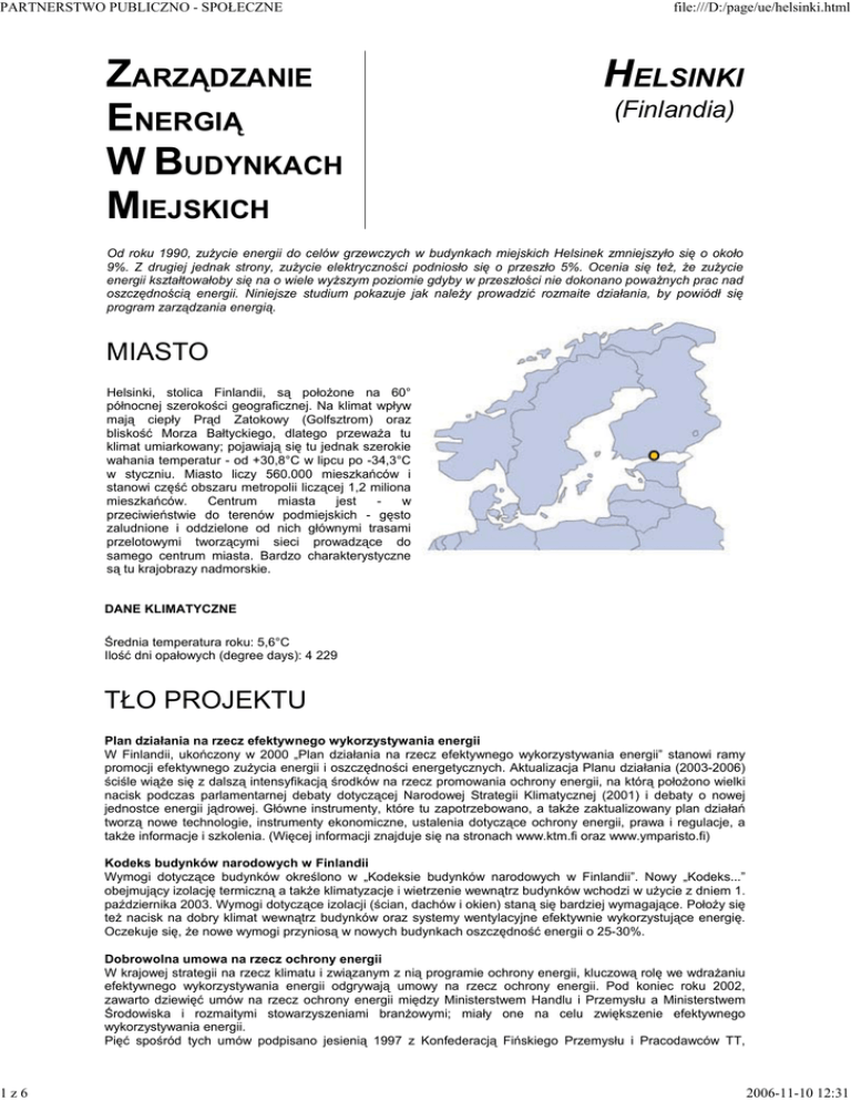 PARTNERSTWO PUBLICZNO - SPOŁECZNE 1z6 ZARZĄDZANIE ENERGIĄ W BUDYNKACH MIEJSKICH file:///D:/page/ue/helsinki.html HELSINKI (Finlandia) Od roku 1990, zużycie energii do celów grzewczych w budynkach miejskich Helsinek zmniejszyło się o około 9%. Z drugiej jednak strony, zużycie elektryczności podniosło się o przeszło 5%. Ocenia się też, że zużycie energii kształtowałoby się na o wiele wyższym poziomie gdyby w przeszłości nie dokonano poważnych prac nad oszczędnością energii. Niniejsze studium pokazuje jak należy prowadzić rozmaite działania, by powiódł się program zarządzania energią. MIASTO Helsinki, stolica Finlandii, są położone na 60° północnej szerokości geograficznej. Na klimat wpływ mają ciepły Prąd Zatokowy (Golfsztrom) oraz bliskość Morza Bałtyckiego, dlatego przeważa tu klimat umiarkowany; pojawiają się tu jednak szerokie wahania temperatur - od +30,8°C w lipcu po -34,3°C w styczniu. Miasto liczy 560.000 mieszkańców i stanowi część obszaru metropolii liczącej 1,2 miliona mieszkańców. Centrum miasta jest w przeciwieństwie do terenów podmiejskich - gęsto zaludnione i oddzielone od nich głównymi trasami przelotowymi tworzącymi sieci prowadzące do samego centrum miasta. Bardzo charakterystyczne są tu krajobrazy nadmorskie. DANE KLIMATYCZNE Średnia temperatura roku: 5,6°C Ilość dni opałowych (degree days): 4 229 TŁO PROJEKTU Plan działania na rzecz efektywnego wykorzystywania energii W Finlandii, ukończony w 2000 „Plan działania na rzecz efektywnego wykorzystywania energii” stanowi ramy promocji efektywnego zużycia energii i oszczędności energetycznych. Aktualizacja Planu działania (2003-2006) ściśle wiąże się z dalszą intensyfikacją środków na rzecz promowania ochrony energii, na którą położono wielki nacisk podczas parlamentarnej debaty dotyczącej Narodowej Strategii Klimatycznej (2001) i debaty o nowej jednostce energii jądrowej. Główne instrumenty, które tu zapotrzebowano, a także zaktualizowany plan działań tworzą nowe technologie, instrumenty ekonomiczne, ustalenia dotyczące ochrony energii, prawa i regulacje, a także informacje i szkolenia. (Więcej informacji znajduje się na stronach www.ktm.fi oraz www.ymparisto.fi) Kodeks budynków narodowych w Finlandii Wymogi dotyczące budynków określono w „Kodeksie budynków narodowych w Finlandii”. Nowy „Kodeks...” obejmujący izolację termiczną a także klimatyzacje i wietrzenie wewnątrz budynków wchodzi w użycie z dniem 1. października 2003. Wymogi dotyczące izolacji (ścian, dachów i okien) staną się bardziej wymagające. Położy się też nacisk na dobry klimat wewnątrz budynków oraz systemy wentylacyjne efektywnie wykorzystujące energię. Oczekuje się, że nowe wymogi przyniosą w nowych budynkach oszczędność energii o 25-30%. Dobrowolna umowa na rzecz ochrony energii W krajowej strategii na rzecz klimatu i związanym z nią programie ochrony energii, kluczową rolę we wdrażaniu efektywnego wykorzystywania energii odgrywają umowy na rzecz ochrony energii. Pod koniec roku 2002, zawarto dziewięć umów na rzecz ochrony energii między Ministerstwem Handlu i Przemysłu a Ministerstwem Środowiska i rozmaitymi stowarzyszeniami branżowymi; miały one na celu zwiększenie efektywnego wykorzystywania energii. Pięć spośród tych umów podpisano jesienią 1997 z Konfederacją Fińskiego Przemysłu i Pracodawców TT, 2006-11-10 12:31 PARTNERSTWO PUBLICZNO - SPOŁECZNE 2z6 file:///D:/page/ue/helsinki.html Stowarzyszeniem Fińskich Władz Lokalnych i Regionalnych, Finergy - Fińską Federacją Przemysłów Energetycznych, Fińskim Stowarzyszeniem Energetyki Cieplnej (FDHA) i Fińskim Stowarzyszeniem Elektryczności (Sener). Dwie umowy podpisano w roku 1999 z Fińskim Stowarzyszeniem Właścicieli Budynków (RAKLI) oraz Fińską Organizacją Przewozów Ciężarówkami (SKAL). W marcu 2001, podpisano też umowę o ochronie energii dla sektora autobusów (miejskich i dalekobieżnych). W listopadzie 2002, poszerzono bazę umowy tak, że objęła ona też mieszkania miejskie Federacji Właścicieli Domów Mieszkalnych i Deweloperów (ASRA). W tym sektorze, odpowiedzialność spoczywa na Ministerstwie Środowiska. Przedsiębiorstwa i społeczeństwa lokalne przyłączające się do tych umów powinny przeprowadzić audyty lub analizy energetyczne swoich nieruchomości i zakładów produkcyjnych, stworzyć plan oszczędzania energii i wdrożyć środki ochrony efektywne w stosunku do kosztów. Ministerstwo Handlu i Przemysłu ze swojej strony będzie wspierać audyty energetyczne i analizy, a także inwestycje w ochronę energii spełniające pewne kryteria. W przypadku sektora mieszkaniowego, odpowiedzialność za subsydiowanie audytów spoczywa na Ministerstwie Środowiska. (Więcej informacji dostępne jest pod: www.motiva.fi) Audyty energetyczne w Finlandii w skrócie Fiński Program Audytów Energetycznych (EAP) to jeden z najstarszych w kraju planów subsydiowania projektów efektywnego wykorzystywania energii. EAP rozpoczął swoją działalność jako polityka wspierania w roku 1992 i rozwinął się w działania na poziomie programowania w roku 1993. EAP został wdrożony w styczniu 1994; od tego czasu stanowi on jasny program działający na pełną skalę. Głównym celem programu jest prowadzenie audytów energii mających na celu identyfikację możliwości oszczędności energii. Celem jest przeprowadzenie audytów w 80% wszystkich budynków w przemyśle i innych sektorach do roku 2010. Motiva Oy (Agent Operacyjny) to spółka pozostająca w rękach Państwa kierująca EAP. Jej administratorem jest Wydział Energii Ministerstwa Handlu i Przemysłu, odpowiedzialny za wszystkie oficjalne decyzje. Firmy konsultingowe stanowią znaczną część energetycznych audytorów, a ich klienci wywodzą się z sektorów przemysłowego, usługowego i energetycznego. EAP stanowi dobrowolny program, wspieran