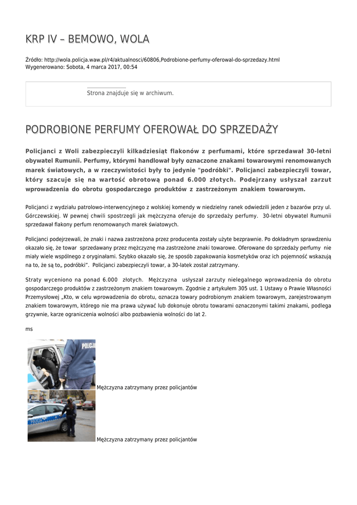 KRP IV – BEMOWO, WOLA Źródło: http://wola.policja.waw.pl/r4/aktualnosci/60806,Podrobione-perfumy-oferowal-do-sprzedazy.html Wygenerowano: Sobota, 4 marca 2017, 00:54 Strona znajduje się w archiwum. PODROBIONE PERFUMY OFEROWAŁ DO SPRZEDAŻY Policjanci z Woli zabezpieczyli kilkadziesiąt flakonów z perfumami, które sprzedawał 30-letni obywatel Rumunii. Perfumy, którymi handlował były oznaczone znakami towarowymi renomowanych marek światowych, a w rzeczywistości były to jedynie "podróbki". Policjanci zabezpieczyli towar, który szacuje się na wartość obrotową ponad 6.000 złotych. Podejrzany usłyszał zarzut wprowadzenia do obrotu gospodarczego produktów z zastrzeżonym znakiem towarowym. Policjanci z wydziału patrolowo-interwencyjnego z wolskiej komendy w niedzielny ranek odwiedzili jeden z bazarów przy ul. Górczewskiej. W pewnej chwili spostrzegli jak mężczyzna oferuje do sprzedaży perfumy. 30-letni obywatel Rumunii sprzedawał flakony perfum renomowanych marek światowych. Policjanci podejrzewali, że znaki i nazwa zastrzeżona przez producenta zostały użyte bezprawnie. Po dokładnym sprawdzeniu okazało się, że towar sprzedawany przez mężczyznę ma zastrzeżone znaki towarowe. Oferowane do sprzedaży perfumy nie miały wiele wspólnego z oryginałami. Szybko okazało się, że sposób zapakowania kosmetyków oraz ich pojemność wskazują na to, że są to„ podróbki”. Policjanci zabezpieczyli towar, a 30-latek został zatrzymany. Straty wyceniono na ponad 6.000 złotych. Mężczyzna usłyszał zarzuty nielegalnego wprowadzenia do obrotu gospodarczego produktów z zastrzeżonym znakiem towarowym. Zgodnie z artykułem 305 ust. 1 Ustawy o Prawie Własności Przemysłowej „Kto, w celu wprowadzenia do obrotu, oznacza towary podrobionym znakiem towarowym, zarejestrowanym znakiem towarowym, którego nie ma prawa używać lub dokonuje obrotu towarami oznaczonymi takimi znakami, podlega grzywnie, karze ograniczenia wolności albo pozbawienia wolności do lat 2. ms Mężczyzna zatrzymany przez policjantów Mężczyzna zatrzymany przez policjantów Mężczyzna zatrzymany przez policjantów Ocena: 0/5 (0) Tweetnij