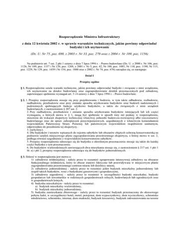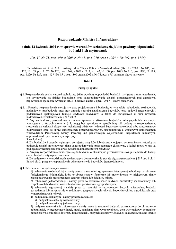Rozporządzenie Ministra Infrastruktury z dnia 12 kwietnia 2002 r. w sprawie warunków technicznych, jakim powinny odpowiadać budynki i ich usytuowanie (Dz. U. Nr 75, poz. 690, z 2003 r. Nr 33, poz. 270 oraz z 2004 r. Nr 109, poz. 1156) Na podstawie art. 7 ust. 2 pkt 1 ustawy z dnia 7 lipca 1994 r. - Prawo budowlane (Dz. U. z 2000 r. Nr 106, poz. 1126, Nr 109, poz. 1157 i Nr 120, poz. 1268, z 2001 r. Nr 5, poz. 42, Nr 100, poz. 1085, Nr 110, poz. 1190, Nr 115, poz. 1229, Nr 129, poz. 1439 i Nr 154, poz. 1800 oraz z 2002 r. Nr 74, poz. 676) zarządza się, co następuje: Dział I Przepisy ogólne § 1. Rozporządzenie ustala warunki techniczne, jakim powinny odpowiadać budynki i związane z nimi urządzenia, ich usytuowanie na działce budowlanej oraz zagospodarowanie działek przeznaczonych pod zabudowę, zapewniające spełnienie wymagań art. 5 i 6 ustawy z dnia 7 lipca 1994 r. - Prawo budowlane. § 2. 1. Przepisy rozporządzenia stosuje się przy projektowaniu i budowie, w tym także odbudowie, rozbudowie, nadbudowie, przebudowie oraz przy zmianie sposobu użytkowania budynków oraz budowli nadziemnych i podziemnych spełniających funkcje użytkowe budynków, a także do związanych z nimi urządzeń budowlanych, z zastrzeżeniem § 207 ust. 2. 2. Przy nadbudowie, przebudowie i zmianie sposobu użytkowania budynków istniejących lub ich części wymagania, o których mowa w § 1, mogą być spełnione w sposób inny niż podany w rozporządzeniu, stosownie do wskazań ekspertyzy technicznej właściwej jednostki badawczo-rozwojowej albo rzeczoznawcy budowlanego oraz do spraw zabezpieczeń przeciwpożarowych, uzgodnionych z właściwym komendantem wojewódzkim Państwowej Straży Pożarnej lub państwowym wojewódzkim inspektorem sanitarnym, odpowiednio do przedmiotu tej ekspertyzy. 3. (uchylony). 4. Dla budynków i terenów wpisanych do rejestru zabytków lub obszarów objętych ochroną konserwatorską na podstawie ustaleń miejscowego planu zagospodarowania przestrzennego ekspertyza, o której mowa w ust. 2, podlega również uzgodnieniu z wojewódzkim konserwatorem zabytków. 5. Przepisy rozporządzenia odnoszące się do budynku o określonym przeznaczeniu stosuje się także do każdej części budynku o tym przeznaczeniu. 6. Do budynków wielorodzinnych zawierających dwa mieszkania stosuje się, z zastrzeżeniem § 217 ust. 1 pkt 1 lit. a) i pkt 2, przepisy rozporządzenia odnoszące się do budynków jednorodzinnych. § 3. Ilekroć w rozporządzeniu jest mowa o: 1) zabudowie śródmiejskiej - należy przez to rozumieć zgrupowanie intensywnej zabudowy na obszarze funkcjonalnego śródmieścia, który to obszar stanowi faktyczne lub przewidywane w miejscowym planie zagospodarowania przestrzennego centrum miasta lub dzielnicy miasta, 2) zabudowie jednorodzinnej - należy przez to rozumieć jeden budynek mieszkalny jednorodzinny lub zespół takich budynków, wraz z budynkami garażowymi i gospodarczymi, 3) zabudowie zagrodowej - należy przez to rozumieć w szczególności budynki mieszkalne, budynki gospodarcze lub inwentarskie w rodzinnych gospodarstwach rolnych, hodowlanych lub ogrodniczych oraz w gospodarstwach leśnych, 4) budynku mieszkalnym - należy przez to rozumieć: a) budynek mieszkalny wielorodzinny, b) budynek mieszkalny jednorodzinny, 5) budynku zamieszkania zbiorowego - należy przez to rozumieć budynek przeznaczony do okresowego pobytu ludzi, w szczególności hotel, motel, pensjonat, dom wypoczynkowy, dom wycieczkowy, schronisko młodzieżowe, schronisko, internat, dom studencki, budynek koszarowy, budynek zakwaterowania na terenie zakładu karnego, aresztu śledczego, zakładu poprawczego, schroniska dla nieletnich, a także budynek do stałego pobytu ludzi, w szczególności dom dziecka, dom rencistów i dom zakonny, 6) budynku użyteczności publicznej - należy przez to rozumieć budynek przeznaczony na potrzeby administracji publicznej, wymiaru sprawiedliwości, kultury, kultu religijnego, oświaty, szkolnictwa wyższego, nauki, opieki zdrowotnej, opieki społecznej i socjalnej, obsługi bankowej, handlu, gastronomii, usług, turystyki, sportu, obsługi pasażerów w transporcie kolejowym, drogowym, lotniczym, morskim lub wodnym śródlądowym, świadczenia usług pocztowych lub telekomunikacyjnych oraz inny ogólnodostępny budynek przeznaczony do wykonywania podobnych funkcji, w tym także budynek biurowy i socjalny, 7) budynku rekreacji indywidualnej - należy przez to rozumieć budynek przeznaczony do okresowego wypoczynku, 8) budynku gospodarczym - należy przez to rozumieć budynek przeznaczony do niezawodowego wykonywania prac warsztatowych oraz do przechowywania materiałów, narzędzi, sprzętu i płodów rolnych służących mieszkańcom budynku mieszkalnego, budynku zamieszkania zbiorowego, budynku rekreacji indywidualnej, a także ich otoczenia, a w zabudowie zagrodowej przeznaczony również do przechowywania środków produkcji rolnej i sprzętu oraz płodów rolnych, 9) mieszkaniu - należy przez to rozumieć zespół pomieszczeń mieszkalnych i pomocniczych, mający odrębne wejście, wydzielony stałymi przegrodami budowlanymi, umożliwiający stały pobyt ludzi i prowadzenie samodzielnego gospodarstwa domowego, 10) pomieszczeniu mieszkalnym - należy przez to rozumieć pokoje w mieszkaniu, a także sypialnie i pomieszczenia do dziennego pobytu ludzi w budynku zamieszkania zbiorowego, 11) pomieszczeniu pomocniczym - należy przez to rozumieć pomieszczenie znajdujące się w obrębie mieszkania lub lokalu użytkowego służące do celów komunikacji wewnętrznej, higieniczno-sanitarnych, przygotowywania posiłków, z wyjątkiem kuchni zakładów żywienia zbiorowego, a także do przechowywania ubrań, przedmiotów oraz żywności, 12) pomieszczeniu technicznym - należy przez to rozumieć pomieszczenie przeznaczone dla urządzeń służących do funkcjonowania i obsługi technicznej budynku, 13) pomieszczeniu gospodarczym - należy pr