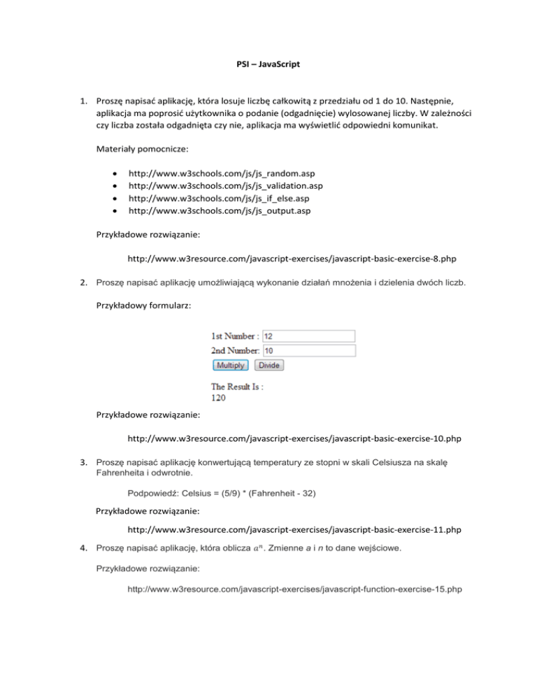 PSI – JavaScript 1. Proszę napisać aplikację, która losuje liczbę