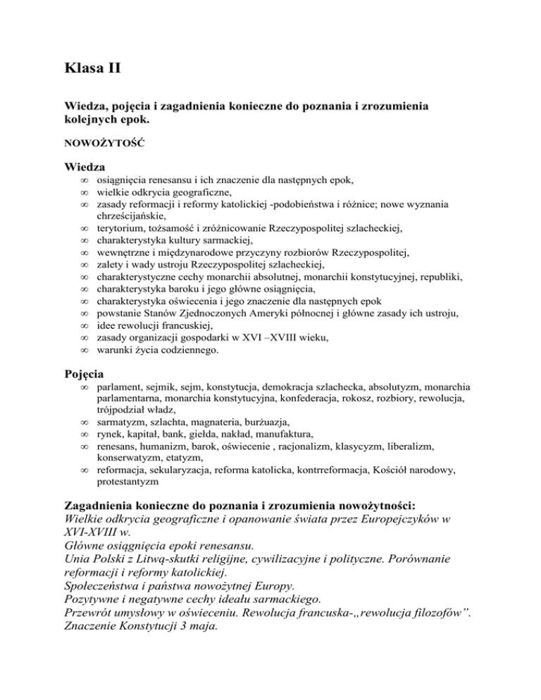 Klasa II Wiedza, pojęcia i zagadnienia konieczne do poznania i zrozumienia kolejnych epok. NOWOŻYTOŚĆ Wiedza • • • • • • • • • • • • • • osiągnięcia renesansu i ich znaczenie dla następnych epok, wielkie odkrycia geograficzne, zasady reformacji i reformy katolickiej -podobieństwa i różnice; nowe wyznania chrześcijańskie, terytorium, tożsamość i zróżnicowanie Rzeczypospolitej szlacheckiej, charakterystyka kultury sarmackiej, wewnętrzne i międzynarodowe przyczyny rozbiorów Rzeczypospolitej, zalety i wady ustroju Rzeczypospolitej szlacheckiej, charakterystyczne cechy monarchii absolutnej, monarchii konstytucyjnej, republiki, charakterystyka baroku i jego główne osiągnięcia, charakterystyka oświecenia i jego znaczenie dla następnych epok powstanie Stanów Zjednoczonych Ameryki północnej i główne zasady ich ustroju, idee rewolucji francuskiej, zasady organizacji gospodarki w XVI –XVIII wieku, warunki życia codziennego. Pojęcia • • • • • parlament, sejmik, sejm, konstytucja, demokracja szlachecka, absolutyzm, monarchia parlamentarna, monarchia konstytucyjna, konfederacja, rokosz, rozbiory, rewolucja, trójpodział władz, sarmatyzm, szlachta, magnateria, burżuazja, rynek, kapitał, bank, giełda, nakład, manufaktura, renesans, humanizm, barok, oświecenie , racjonalizm, klasycyzm, liberalizm, konserwatyzm, etatyzm, reformacja, sekularyzacja, reforma katolicka, kontrreformacja, Kościół narodowy, protestantyzm Zagadnienia konieczne do poznania i zrozumienia nowożytności: Wielkie odkrycia geograficzne i opanowanie świata przez Europejczyków w XVI-XVIII w. Główne osiągnięcia epoki renesansu. Unia Polski z Litwą-skutki religijne, cywilizacyjne i polityczne. Porównanie reformacji i reformy katolickiej. Społeczeństwa i państwa nowożytnej Europy. Pozytywne i negatywne cechy ideału sarmackiego. Przewrót umysłowy w oświeceniu. Rewolucja francuska-„rewolucja filozofów”. Znaczenie Konstytucji 3 maja. OCENA NIEDOSTATECZNA Ocenę niedostateczna otrzymuje uczeń, jeżeli: - nie opanował wiedzy i umiejętności przewidzianych na ocenę dopuszczającą, - nie wykonuje zadań i poleceń nauczyciela, - nie uczestniczy aktywnie w lekcji, - nie prowadzi zeszytu przedmiotowego, - nie przezwycięża trudności, - ma lekceważący stosunek do przedmiotu i nauczyciela, odrzuca pomoc nauczyciela i kolegów z klasy. OCENA DOPUSZCZAJĄCA Ocenę dopuszczającą otrzymuje uczeń, który potrafi przy pomocy nauczyciela wyjaśnić pojęcia i zagadnienia z następujących działów: Odrodzenie - wymienia najważniejszych twórców renesansu: Leonarda da Vinci, Michała Anioła, Rafaela - zna i wyjaśnia pojęcia: humanizm, renesans, odrodzenie, mecenat, druk - wymienia przedstawicieli polskiego renesansu: Mikołaja Kopernika, Andrzeja Frycza Modrzewskiego, Mikołaja Reja, Jana Kochanowskiego, Grzegorza z Sanoka - wskazuje przyczyny i skutki wielkich odkryć geograficznych - wymienia towary sprowadzane przez Europejczyków z Indii i Dalekiego Wschodu, a także z Ameryki - wymienia udoskonalenia techniczne w Europie w XVI wieku - wymienia czynniki rozwoju gospodarczego w Europie w XVI wieku - zna i posługuje się pojęciami: folwark, pańszczyzna - wyjaśnia genezę reformacji w Europie - potrafi scharakteryzować reformację w Polsce - zna i wyjaśnia pojęcia: odpust, celibat, reformacja, tolerancja religijna, sekularyzacja, pokój religijny, - wymienia najważniejszych reformatorów: Marcina Lutra, Jana Kalwina - zna datę: 1517 r., - wymienia najważniejsze przywileje szlacheckie - zna i wyjaśnia pojęcia: przywilej, prawo sukcesyjne, pospolite ruszenie, sejm, izba poselska, senat, sejm walny, „nihil novi”, - zna i posługuje się datami: 1525 r., 1569 r., 1562−1570, 1572 r., 1526 r., - wyjaśnia pojęcia i posługuje się nimi: sejm elekcyjny, konfederacja warszawska, - przedstawia postacie: Jana Zamojskiego, Henryka Walezego, Stefana Batorego, Anny Jagiellonki - zna i wyjaśnia daty: 1572 r., 1573 r., 1582 r. Barok - zna i potrafi wskazać charakterystyczne cechy sztuki baroku - wymienia zabytki sztuki barokowej w Polsce - opisuje strój polskiego szlachcica: żupan, kontusz, pas - zna i wyjaśnia pojęcia: absolutyzm, rewolucja burżuazyjna, parlament - zna i objaśnia pojęcia: dymitriada, samozwaniec, lisowczycy, husaria, regent, detronizacja - przedstawia postacie: Zygmunta III Wazy, Jana Karola Chodkiewicza, Stanisława Żółkiewskiego, Jana Zamojskiego, Gustawa II Adolfa - zna i posługuje się datami: 1605 r., 1610 r., 1620 r., 1655 r., 1657 r., 1660 r., 1683r., 1672 r. - zna i posługuje się pojęciami: Kozacy, unia, powstanie, ugoda, Sicz - wymienia przyczyny wojen ze Szwecją w połowie XVII wieku, - przedstawia postacie: Jana Karola Chodkiewicza, Stefana Czarnieckiego, Jana Kazimierza Wazy - zna zjawiska świadczące o kryzysie Rzeczypospolitej w 2. połowie XVII w. - wyjaśnia pojęcia: magnateria, absolutyzm, liberum veto, patron, - zna przyczyn i przebieg wojen z Turcją w 2. połowie XVII wieku. Oświecenie - wymienia przedstawicieli oświecenia: Monteskiusz, Wolter, - zna i stosuje pojęcia: oświecenie, empiryzm, klasycyzm, ateizm, - wymienia wynalazki, dzięki którym nastąpił postęp techniczny: latające czółenko, mechaniczna przędzarka, maszyna parowa, - przedstawia reformy Piotra I Wielkiego , - zna i posługuje się pojęciami: elektor, król sierżant, rozbójnik Europy, - zna i wyjaśnia wkład Polaków w walkę o niepodległość Stanów Zjednoczonych - posługuje się pojęciami: kolonia, „herbata bostońska”, - zna i posługuje się datami: 1781 r., 1787 r. 1789 r. 1772 r., 1773 r., - zna i stosuje pojęcia: bezkrólewie, abdykacja, - przedstawia postaci: Augusta II Mocnego, Stanisława Leszczyńskiego, Augusta III - wyjaśnia pojęcie „unia personalna”, - przedstawia postaci: Stanisława Konarskiego, Stanisława Augusta Poniatowskiego, Ignacego Krasickiego, Hugo Kołłąt