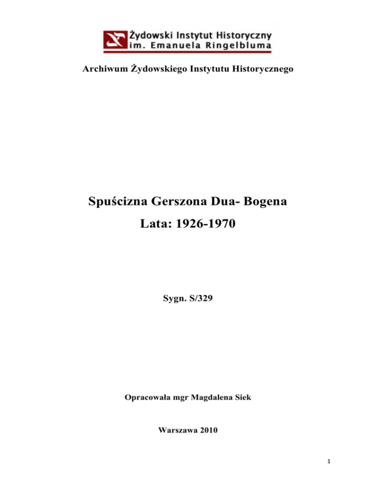 Archiwum Żydowskiego Instytutu Historycznego Spuścizna Gerszona Dua- Bogena Lata: 1926-1970 Sygn. S/329 Opracowała mgr Magdalena Siek Warszawa 2010 1 Wstęp Gerszon Dua-Bogen urodził się 4 maja 1892 r. w Siedlcach. Jego ojciec był drobnym kupcem. Gerszon Dua otrzymał tradycyjne religijne wychowanie. W wieku 16 lat podjął pracę jako kupiec, potem zaś jako robotnik w branży skórzanej. W 1909 r. wstąpił do Poalej Syjon (od 1920 r. PS Lewica). W 1911 r. wyjechał do USA, gdzie również pracował jako robotnik. Należał tam do Partii Socjalistycznej. Po powrocie do Polski w 1913 r. wstąpił ponownie do Poalej Syjon (Lewica). 1 maja 1916 r. został aresztowany przez niemieckie władze okupacyjne za działalność partyjną. Oskarżony o zorganizowanie demonstracji pierwszomajowej trafił do więzienia w Niemczech. Zwolniony został w listopadzie 1917 r. W 1918 r. został wybrany delegatem do Warszawskiej Rady Robotniczej. Pełnił również funkcję sekretarza Warszawskiego Komitetu Poalej Syjon i związków zawodowych. W 1920 r. wyjechał do Palestyny. Tam współtworzył Komunistyczną Partię Palestyny, następnie został sekretarzem generalnym tejże partii. W 1921 r. uciekł do Polski zagrożony aresztowaniem przez władze brytyjskie. Do połowy 1922 r. pełnił funkcję sekretarza generalnego Centralnego Komitetu Poalej Syjon Lewicy. Na IV kongresie Międzynarodówki Komunistycznej w 1922 r. został jej delegatem z ramienia KC Palestyny. W latach 1922-1927 pełnił funkcję sekretarza Centralnego Biura Żydowskiego oraz był członkiem Centralnego Wydziału Zawodowego przy KC KPP. W 1924 r. został wysłany do ZSRR, gdzie pełnił funkcję kierownika Centralnej Szkoły Partyjnej przy Komunistycznej Partii Zachodniej Białorusi. W 1928 r. wyjechał ponownie do USA, gdzie prowadził propagandę wśród robotników amerykańskich. W latach 1930-1935 pracował w Międzynarodówce Komunistycznej w ZSRR oraz anglo-amerykańskim sekretariacie Kominternu, Po powrocie do Polski w 1935 r. został członkiem sekretariatu KC KPP, a od 1937 r. przebywał, na polecenie KC KPP, w Hiszpanii, gdzie kierował pracą partyjno-polityczną w Bazie Brygad Międzynarodowych w Albacete. Był jednym z organizatorów Żydowskiej Kompanii im. Naftalego Botwina w brygadzie im. Jarosława Dąbrowskiego. Po delegalizacji KPP wyjechał w 1938 r. do Paryża, gdzie pracował korespondent amerykańskiej prasy komunistycznej. W 1942 r. przedostał się na Kubę. Po powrocie do Polski we wrześniu 1947 r. pracował najpierw w KC PPR, następnie skierowano go do 2 pracy w CKŻP. Był wybitną indywidualnością, wydawało się że odegra dużą rolę jako jeden z liderów Frakcji Polskiej Partii Robotniczej (żydowska sekcja etniczna tej partii). Na początku lutego 1948 r. zginął w wypadku samochodowym pod Bielskiem. Po śmierci stał się jedną z postaci panteonu bohaterów żydowskiego ruchu komunistycznego. Jest pochowany na cmentarzu żydowskim przy ul. Okopowej w Warszawie. W materiałach Wydziału Budowlanego CKŻP znajdują się projekty pomnika poświęconego Gerszonowi Dua-Bogen (sygn.303/X/ 33). Artykuły pisane przez niego znaleźć można również w zespole „Wojna domowa w Hiszpanii” (sygn.332/ 20 i 21). Bibliografia: Grabski A., Działalność komunistów wśród Żydów w Polsce (1944-1949), Warszawa 2004, s. 38. 3 Wykaz skrótów: b. d.- bez daty rkps- rękopis mps- maszynopis fot.- fotografia j. ang.- język angielski j. hiszp.- język hiszpański j. franc.- język francuski j. niem.- język niemiecki j. pol.- język polski j. ros.- język rosyjski l.- luźne s.- stron BUW- Biblioteka Uniwersytetu Warszawskiego KC- Komitet Centralny KPP- Komunistyczna Partia Polski KPI- Komunistyczna Partia Izraela TSKŻ- Towarzystwo Społeczno-Kulturalne Żydów w Polsce ZUS- Zakład Ubezpieczeń Społecznych 4 Inwentarz: 1. Dokumenty osobiste Gerszona Dua-Bogena: odpis świadectwa urodzenia (fotokopia), życiorys, francuski dowód tożsamości1, legitymacja Związku Literatów i Dziennikarzy Żydowskich w Polsce.2 1938-1947, rkps, druk, fot., j. franc., j. jidysz, j. pol., l., s. 17 2. Dokumenty osobiste Frimy Bogen- żonyGerszona DuaBogena: życiorys, zaświadczenia, Relacja o Adolfie Warskim, umowa z ZUS, list od Komitetu Dzielnicowego PZPR, świadectwo o przebywaniu w lagrze sowieckim, rehabilitacja, podanie w sprawie rekompensaty za mienie utracone podczas przebywania w obozie w ZSRR, pismo adwokackie w sprawie przyznania 500 rubli, karta ambulatoryjna, legitymacja członkowska Związku Zawodowego Pracowników Medyczno-Sanitarnych, karta pracy, legitymacja członkowska TSKŻ, wkładka paszportowa wielokrotna. 1946-1970, rkps, mps, druk, j. jidysz, j. pol., j. ros., l., s. 40 3. Dokumenty osobiste Jerzego Bogena- syna Gerszona DuaBogena: charakterystyki (wojskowa i partyjne), podanie do Wyższej Szkoły Nauk Społecznych, życiorys, podanie o uznanie stopnia oficerskiego, odpis dyplomu ukończenia studiów na Wydziale Historycznym Uniwersytetu Moskiewskiego im. Łomonosowa, podanie o zwolnienie z pracy w BUW, zaświadczenie o pracy w BUW, oświadczenie zezwolenia na wyjazd córki, podanie Elżbiety WajmanBogen do Wydziału Zdrowia Stołecznej Rady Narodowej o przyjęcie na praktykę. 1944-1969, rkps, mps, j. ang., j. niem., j. pol., j. ros., l., s. 23 4. Korespondencja wychodząca Gerszona Dua-Bogena do brata, żony i syna- (odpisy). 1 2 Zfotografiąiodciskamipalców. Zfotografią. 5 1926-1948, mps, j. jidysz, j. ros., l., s. 37 5. Korespondencja przychodząca: pismo Komunistycznej Partii Izraela z kopią pisma wysłanego do redakcji „Ajnikajt” w sprawie działalności Estery Wilińskiej, oskarżonej o szkalowanie KPI i lewicowe odchylenie. 1947, mps, j. jidysz, l., s. 11 6. Dokumenty w sprawie wyjazdu Gerszona Dua-Bogena do rodziny w USA. 1945, rkps, mps, druk, fotokopie, j. ang., l., s. 35 7. Notatki dotyczące spraw osobistych. b. d., rkps, j. jidysz, l., s. 5 8. Fragmenty z pamiętnika