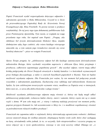 Odpusty w Nadzwyczajnym Roku Miłosierdzia Papież Franciszek wydał rozporządzenia dotyczące odpustów i sakramentu spowiedzi w Roku Miłosierdzia. Uczynił to w liście do przewodniczącego Papieskiej Rady ds. Krzewienia Nowej Ewangelizacji abp. Rina Fisichelli. To pewne novum w praktyce watykańskiej. Do tej pory tego typu dokumenty publikowane były przez Penitencjarię Apostolską. Tym razem, ze względu na wagę przesłania tego roku, list napisał sam Papież. „Pragnę, aby Jubileusz był żywym doświadczeniem bliskości Ojca, niejako dotknięciem ręką Jego czułości, aby wiara każdego wierzącego umocniła się, a tym samym jego świadectwo stawało się coraz bardziej skuteczne" – pisze we wstępie Franciszek. Ojciec Święty pragnie, by „jubileuszowy odpust był dla każdego autentycznym doświadczeniem miłosierdzia Bożego, które wychodzi wszystkim naprzeciw z obliczem Ojca, który przyjmuje i przebacza, całkowicie zapominając popełniony grzech”. Aby uzyskać odpust, wierni mają odbyć krótką pielgrzymkę do Drzwi Świętych otwartych w każdej katedrze i w kościołach wyznaczonych przez biskupa diecezjalnego, a także w czterech bazylikach papieskich w Rzymie. Tam też będzie możliwość uzyskania odpustu. Dla Franciszka jest ważne, by ten moment był połączony przede wszystkim z sakramentem pojednania, Eucharystią oraz refleksją nad miłosierdziem. Konieczne będzie, by tym celebracjom towarzyszyło wyznanie wiary, modlitwa za Papieża oraz w intencjach, które nosi on „w sercu dla dobra Kościoła i całego świata”. Możliwość uzyskania jubileuszowego odpustu mają również ci, którzy nie będą mogli odbyć jubileuszowej pielgrzymki, zwłaszcza ludzie chorzy, starsi i samotni, którzy często nie są w stanie wyjść z domu. W tym celu mają oni „z wiarą i radosną nadzieją przeżywać ten moment próby, poprzez przyjęcie Komunii św. lub uczestniczenie w Mszy św. i w modlitwie wspólnotowej, również za pośrednictwem różnych środków przekazu”. Franciszek nie zapomina także o więźniach, którzy doświadczają ograniczenia wolności. Jubileusz zawsze stanowił okazję do wielkiej amnestii, obejmującej bardzo wiele osób, które choć zasługują na karę, uświadomiły sobie jednak, że to, co uczyniły, było niesprawiedliwe i szczerze pragną na nowo włączyć się w życie społeczeństwa, wnosząc w nie swój uczciwy wkład. Dlatego też „w kaplicach więziennych będą oni mogli uzyskać odpust, a kiedy będą przechodzili przez drzwi swojej celi, kierując myśli i modlitwę do Ojca, niech za każdym razem ten gest oznacza dla nich przejście przez Drzwi Święte, ponieważ miłosierdzie Boże, które potrafi przemienić serca, jest również w stanie przeobrazić kraty w doświadczenie wolności” – pisze Papież. Franciszek zwraca uwagę także na znaczenie uczynków miłosierdzia co do ciała i duszy. „Doświadczenie miłosierdzia staje się bowiem widzialne w świadectwie konkretnych znaków, jak uczył nas sam Jezus. Za każdym razem, kiedy wierny sam wykona jeden lub kilka z tych uczynków, z pewnością otrzyma jubileuszowy odpust”. Ojciec Święty wskazuje ponadto, że będzie go można uzyskać również dla zmarłych. „Tak jak pamiętamy o nich podczas Mszy św., tak też możemy, w wielkiej tajemnicy świętych obcowania, modlić się za nich, aby miłosierne oblicze Ojca uwolniło ich od wszelkich pozostałości winy i by mógł On przygarnąć ich do siebie w nieskończonej szczęśliwości” – pisze Franciszek. Sporo miejsca Papież poświęca kwestii należytej wrażliwości indywidualnej i społecznej na kwestię przyjmowania nowego życia. Dotyczy to zwłaszcza dramatu aborcji i kobiet, które się jej poddały. „Wiem, że jest to dramat egzystencjalny i moralny. Spotkałem wiele kobiet, które nosiły w sercu blizny pozostawione przez ten ciężki i bolesny wybór. To, co się wydarzyło, jest głęboko niesłuszne; jednakże tylko wtedy, gdy zrozumie się to w prawdzie, można nie stracić nadziei. Przebaczenia Bożego nie można odmówić nikomu, kto żałuje, zwłaszcza jeśli ze szczerym sercem przystępuje do Sakramentu Spowiedzi, by pojednać się z Ojcem” – napisał Franciszek. Z tego też powodu w Roku Jubileuszowym postanowił upoważnić wszystkich kapłanów do rozgrzeszenia z grzechu aborcji osób, które jej dokonały, żałują tego z całego serca i proszą o przebaczenie. Kapłani powinni się zatem do tego wielkiego zadania dobrze przygotować. Ostatnia uwaga papieskiego dekretu dotyczy wiernych, którzy z różnych powodów uważają za stosowne chodzenie do kościołów, w których posługują kapłani z Bractwa św. Piusa X. Zdaniem Franciszka ten Jubileuszowy Rok Miłosierdzia nie wyklucza nikogo. Ojciec Święty ufa, że w bliskiej przyszłości będzie można znaleźć rozwiązania pozwalające przywrócić pełną jedność z kapłanami i przełożonymi Bractwa. Tymczasem jednak, powodowany potrzebą zabiegania o dobro tych wiernych, Franciszek rozporządził, że osoby, które w Roku Świętym Miłosierdzia przystąpią do Sakramentu Pojednania u kapłanów z Bractwa św. Piusa X, otrzymają ważne i zgodne z prawem rozgrzeszenie. Jubileuszowy odpust zupełny mogą zyskać wierni za każdym razem, gdy odbędą pobożną pielgrzymkę do Drzwi Świętych w wyznaczonych kościołach diecezji kieleckiej oraz nawiedzając wyznaczone przeze mnie kościoły jubileuszowe. Do zyskania łaski odpustu zupełnego ważne jest, aby czynność odpustowa była połączona z przystąpieniem do Sakramentu Pokuty i Pojednania, uczestniczeniem we Mszy Świętej, przyjęciem Komuni Św. Ponadto konieczne jest, aby w czasie tego nabożnego nawiedzenia kościoła jubileuszowego odmówić wyznanie wiary oraz modlitwę za osobę Ojca Świętego i w Jego intencjach. Zgodnie z papieską bullą „Misericordiae vultus” zapowiadającą Nadzwyczajny Jubileusz Miłosierdzia or
