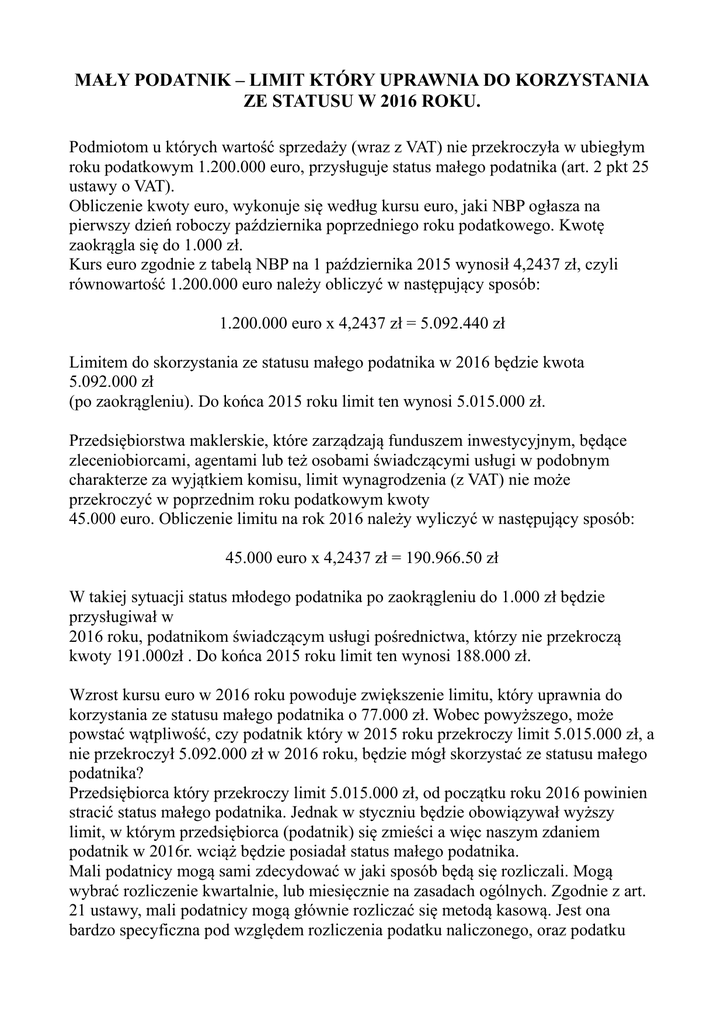 MAŁY PODATNIK – LIMIT KTÓRY UPRAWNIA DO KORZYSTANIA ZE STATUSU W 2016 ROKU. Podmiotom u których wartość sprzedaży (wraz z VAT) nie przekroczyła w ubiegłym roku podatkowym 1.200.000 euro, przysługuje status małego podatnika (art. 2 pkt 25 ustawy o VAT). Obliczenie kwoty euro, wykonuje się według kursu euro, jaki NBP ogłasza na pierwszy dzień roboczy października poprzedniego roku podatkowego. Kwotę zaokrągla się do 1.000 zł. Kurs euro zgodnie z tabelą NBP na 1 października 2015 wynosił 4,2437 zł, czyli równowartość 1.200.000 euro należy obliczyć w następujący sposób: 1.200.000 euro x 4,2437 zł = 5.092.440 zł Limitem do skorzystania ze statusu małego podatnika w 2016 będzie kwota 5.092.000 zł (po zaokrągleniu). Do końca 2015 roku limit ten wynosi 5.015.000 zł. Przedsiębiorstwa maklerskie, które zarządzają funduszem inwestycyjnym, będące zleceniobiorcami, agentami lub też osobami świadczącymi usługi w podobnym charakterze za wyjątkiem komisu, limit wynagrodzenia (z VAT) nie może przekroczyć w poprzednim roku podatkowym kwoty 45.000 euro. Obliczenie limitu na rok 2016 należy wyliczyć w następujący sposób: 45.000 euro x 4,2437 zł = 190.966.50 zł W takiej sytuacji status młodego podatnika po zaokrągleniu do 1.000 zł będzie przysługiwał w 2016 roku, podatnikom świadczącym usługi pośrednictwa, którzy nie przekroczą kwoty 191.000zł . Do końca 2015 roku limit ten wynosi 188.000 zł. Wzrost kursu euro w 2016 roku powoduje zwiększenie limitu, który uprawnia do korzystania ze statusu małego podatnika o 77.000 zł. Wobec powyższego, może powstać wątpliwość, czy podatnik który w 2015 roku przekroczy limit 5.015.000 zł, a nie przekroczył 5.092.000 zł w 2016 roku, będzie mógł skorzystać ze statusu małego podatnika? Przedsiębiorca który przekroczy limit 5.015.000 zł, od początku roku 2016 powinien stracić status małego podatnika. Jednak w styczniu będzie obowiązywał wyższy limit, w którym przedsiębiorca (podatnik) się zmieści a więc naszym zdaniem podatnik w 2016r. wciąż będzie posiadał status małego podatnika. Mali podatnicy mogą sami zdecydować w jaki sposób będą się rozliczali. Mogą wybrać rozliczenie kwartalnie, lub miesięcznie na zasadach ogólnych. Zgodnie z art. 21 ustawy, mali podatnicy mogą głównie rozliczać się metodą kasową. Jest ona bardzo specyficzna pod względem rozliczenia podatku naliczonego, oraz podatku należnego. Mali podatnicy rozliczający się metodą kasową, uzależnieni są od kontrahenta. Kiedy kontrahentem podatnika rozliczającego się kasowo z podatku VAT, jest inny czynny podatnik VAT (art. 21 ust. 1 pkt ustawy o VAT), z dniem otrzymania części lub całości zapłaty powstaje obowiązek podatkowy. W sytuacji sprzedaży podmiotom, które nie są czynnymi podatkami VAT, obowiązek podatkowy występuje niezwłocznie w dniu otrzymania części lub całości zapłaty, najpóźniej do 180 dnia, licząc od dnia wykonania usługi, lub wydania towarów. (art. 21 ust. 1 pkt 2 ustawy). Mali podatnicy rozliczający podatek VAT metodą kasową reguluje art. 86 ust. 10e ustawy o VAT. Nabyta usługa, lub zakup towarów przez małego podatnika, w okresie stosowania metody kasowej, występuje najwcześniej w rozliczeniu za okres, kiedy podatnik opłaci wykonane usługi lub towary. Gabriel Sp z.o.o