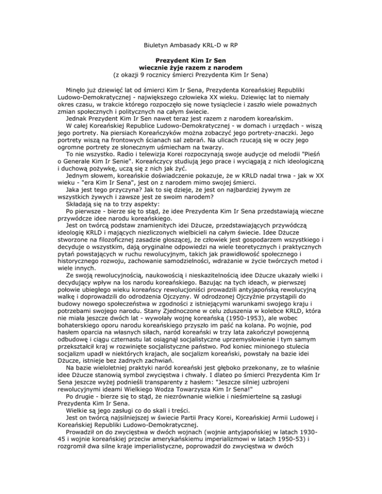 Biuletyn Ambasady KRL-D w RP Prezydent Kim Ir Sen wiecznie żyje razem z narodem (z okazji 9 rocznicy śmierci Prezydenta Kim Ir Sena) Minęło już dziewięć lat od śmierci Kim Ir Sena, Prezydenta Koreańskiej Republiki Ludowo-Demokratycznej - największego człowieka XX wieku. Dziewięc lat to niemały okres czasu, w trakcie którego rozpoczęło się nowe tysiąclecie i zaszło wiele poważnych zmian społecznych i politycznych na całym świecie. Jednak Prezydent Kim Ir Sen nawet teraz jest razem z narodem koreańskim. W całej Koreańskiej Republice Ludowo-Demokratycznej - w domach i urzędach - wiszą jego portrety. Na piersiach Koreańczyków można zobaczyć jego portrety-znaczki. Jego portrety wiszą na frontowych ścianach sal zebrań. Na ulicach rzucają się w oczy jego ogromne portrety ze słonecznym uśmiecham na twarzy. To nie wszystko. Radio i telewizja Korei rozpoczynają swoje audycje od melodii "Pieśń o Generale Kim Ir Senie". Koreańczycy studiują jego prace i wyciągają z nich ideologiczną i duchową pożywkę, uczą się z nich jak żyć. Jednym słowem, koreańskie doświadczenie pokazuje, że w KRLD nadal trwa - jak w XX wieku - "era Kim Ir Sena", jest on z narodem mimo swojej śmierci. Jaka jest tego przyczyna? Jak to się dzieje, że jest on najbardziej żywym ze wszystkich żywych i zawsze jest ze swoim narodem? Składają się na to trzy aspekty: Po pierwsze - bierze się to stąd, że idee Prezydenta Kim Ir Sena przedstawiają wieczne przywódcze idee narodu koreańskiego. Jest on twórcą podstaw znamienitych idei Dżucze, przedstawiających przywódczą ideologię KRLD i mających niezliczonych wielbicieli na całym świecie. Idee Dżucze stworzone na filozoficznej zasadzie głoszącej, że człowiek jest gospodarzem wszystkiego i decyduje o wszystkim, dają oryginalne odpowiedzi na wiele teoretycznych i praktycznych pytań powstających w ruchu rewolucyjnym, takich jak prawidłowość społecznego i historycznego rozwoju, zachowanie samodzielności, wdrażanie w życie twórczych metod i wiele innych. Ze swoją rewolucyjnością, naukowością i nieskazitelnością idee Dżucze ukazały wielki i decydujący wpływ na los narodu koreańskiego. Bazując na tych ideach, w pierwszej połowie ubiegłego wieku koreańscy rewolucjoniści prowadzili antyjapońską rewolucyjną walkę i doprowadzili do odrodzenia Ojczyzny. W odrodzonej Ojczyźnie przystąpili do budowy nowego społeczeństwa w zgodności z istniejącymi warunkami swojego kraju i potrzebami swojego narodu. Stany Zjednoczone w celu zduszenia w kolebce KRLD, która nie miała jeszcze dwóch lat - wywołały wojnę koreańską (1950-1953), ale wobec bohaterskiego oporu narodu koreańskiego przyszło im paść na kolana. Po wojnie, pod hasłem oparcia na własnych siłach, naród koreański w trzy lata zakończył powojenną odbudowę i ciągu czternastu lat osiągnął socjalistyczne uprzemysłowienie i tym samym przekształcił kraj w rozwinięte socjalistyczne państwo. Pod koniec minionego stulecia socjalizm upadł w niektórych krajach, ale socjalizm koreański, powstały na bazie idei Dżucze, istnieje bez żadnych zachwiań. Na bazie wieloletniej praktyki naród koreański jest głęboko przekonany, ze to właśnie idee Dżucze stanowią symbol zwycięstwa i chwały. I dlateo po śmierci Prezydenta Kim Ir Sena jeszcze wyżej podnieśli transparenty z hasłem: "Jeszcze silniej uzbrojeni rewolucyjnymi ideami Wielkiego Wodza Towarzysza Kim Ir Sena!" Po drugie - bierze się to stąd, że niezrównanie wielkie i nieśmiertelne są zasługi Prezydenta Kim Ir Sena. Wielkie są jego zasługi co do skali i treści. Jest on twórcą najsilniejszej w świecie Partii Pracy Korei, Koreańskiej Armii Ludowej i Koreańskiej Republiki Ludowo-Demokratycznej. Prowadził on do zwycięstwa w dwóch wojnach (wojnie antyjapońskiej w latach 193045 i wojnie koreańskiej przeciw amerykańskiemu imperializmowi w latach 1950-53) i rozgromił dwa silne kraje imperialistyczne, poprowadził do zwycięstwa w dwóch ogromnych i złożonych rewolucjach socjalnych - rewolucji antyimperialistycznej i antyfeudalnej oraz rewolucji socjalistycznej. Pod jego przywództwem Koreańska Republika Ludowo-Demokratyczna - byłe kolonialno-feudalne społeczeństwo i zacofane rolniczo państwo - w najkrótszym czasie przekształciła się w niezależne w polityce, samodzielne w gospodarce i zdolne do samoobrony potężne socjalistyczne uprzemysłowione państwo. I po raz pierwszy w historii oryginalny socjalistyczny system, w centrum którego znajdują się ludowe masy, zapuścił swoje korzenie głęboko w ziemię Korei. We wszystkich sferach społecznych: w polityce, gospodarce, kulturze, sztuce wojennej i wielu innych wyczuwa się jego ręce. Wszystkie sukcesy i dzieła KRLD, które w przeszłości okryły się sławą w świecie, jako "skuteczna wieża socjalizmu" i "cud XX wieku" były osiągnięte dzięki jego inicjatywie i przywództwu. I dlatego po jego śmierci naród koreański wypracował nowy zapis w Konstytucji, w którym Kim Ir Sen został uznany wiecznym prezydentem Korei, nazywając go "założycielem socjalistycznej Korei". Po trzecie - z tego powodu, że Prezydent Kim Ir Sen posiadał niezwykle zdumiewające cechy. Był najświętszym ze świętych, kierując się dożywotnią dewizą: "pokłonić się przed narodem, jak bogu", zawsze dzielił z narodem gorycz i radości, poświęcał się całkowicie dla narodu. Od dnia odrodzenia Ojczyzny w sierpniu 1945 roku do lipca 1994 roku, do końca życia, pokonał 578 tyś. km podróży, dokonał inspekcji ponad 20600 jednostek. Mówiąc w przenośni, całe swe życie spędził w gąszczu narodu. Zawsze myślał i starał się zabezpieczyć narodowi szczęście, dokładał wszelkich starań, aby Ojczyzna rozkwitała. Był ojcem wszystkich koreańskich rodzin, chronił je, przygotowywał dla nich szczęście i na każdej stronicy życia Koreańczyków została zapisana jego d