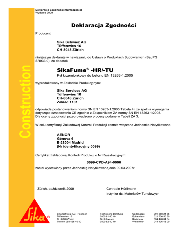 Deklaracja Zgodności (tłumaczenie) Wydanie 2009 Deklaracja Zgodności Producent: Sika Schwiez AG Tüffenwies 16 CH-8048 Zürich Construction niniejszym deklaruje w nawiązaniu do Ustawy o Produktach Budowlanych (BauPG SR933.0), że dodatek SikaFume® -HR/-TU Pył krzemionkowy do betonu EN 13263-1:2005 wyprodukowany w Zakładzie Produkcyjnym: Sika Services AG Tüffenwies 16 CH-8048 Zürich Zakład 1101 odpowiada postanowieniom normy SN EN 13263-1:2005 Tabela 4 i że spełnia wymagania dotyczące oznakowania CE zgodnie z Załącznikiem ZA normy SN EN 13263-1:2005. Dla oceny zgodności przeprowadzono procesy podane w Tabeli ZA 3. W celu certyfikacji Zakładowej Kontroli Produkcji została włączona Jednostka Notyfikowana AENOR Génova 6 E-28004 Madrid (Nr identyfikacyjny 0099) Certyfikat Zakładowej Kontroli Produkcji o Nr Rejestracyjnym: 0099-CPD-A94-0006 został wystawiony przez Jednostkę Notyfikowaną dnia 09.03.2007r. Zürich, październik 2009 Conradin Hürlimann Inżynier ds. Materiałów Tunelowych Sika Schweiz AG Postfach Tüffenwies 16 CH-8048 Zürich Telefon 058 436 40 40 Technische Beratung 0800 81 40 40 Bestellwesen 0800 82 40 40 Cadenazzo Echandens Kirchberg Winterthur 091 858 24 85 021 706 50 60 034 448 64 64 044 436 48 00 Konformitätserklärung Edition 2009 Konformitätserklärung Sika Schweiz AG Tüffenwies 16 CH-8048 Zürich Der Hersteller Construction erklärt in Anlehnung an das Bauproduktegesetz (BauPG SR933.0), dass der Zusatzstoff SikaFume-HR/-TU Silikastaub für Beton EN 13263-1:2005 hergestellt im Werk Sika Services AG Tüffenwies 16 CH-8048 Zürich Werk 1101 den Bestimmungen der SN EN 13263-1:2005 Tab. 4 entspricht und die Voraussetzungen für die CE-Kennzeichnung gemäss Anhang ZA der SN EN 132631:2005 erfüllt. Für die Bewertung der Konformität wurden die in Tabelle in ZA.3 angegebenen Verfahren durchgeführt. Zur Zertifizierung der werkseigenen Produktionskontrolle wurde die notifizierte Stelle AENOR Génova 6 E-28004 Madrid (Kenn-Nr. 0099) eingeschaltet. Das Zertifikat über die werkseigene Produktionskontrolle mit der Registrier-Nr. 0099-CPD-A94-0006 wurde durch die notifizierte Stelle am 09.03.2007 ausgestellt. Zürich, Oktober 2009 Sika Schweiz AG Postfach Tüffenwies 16 CH-8048 Zürich Telefon 058 436 40 40 Conradin Hürlimann Produktingenieur Tunnelbau Technische Beratung 0800 81 40 40 Bestellwesen 0800 82 40 40 Cadenazzo Echandens Kirchberg Winterthur 091 858 021 706 034 448 044 436 24 85 50 60 64 64 48 00