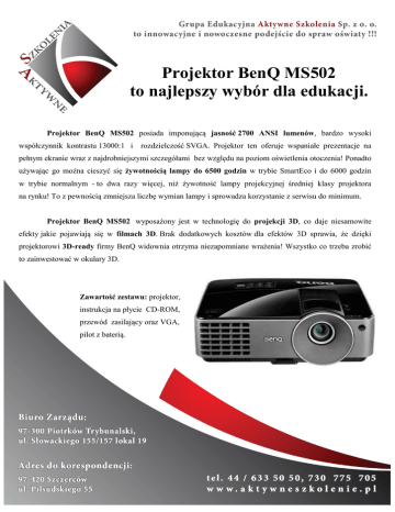 Projektor BenQ MS502 to najlepszy wybór dla edukacji. Projektor BenQ MS502 posiada imponującą jasność 2700 ANSI lumenów, bardzo wysoki współczynnik kontrastu 13000:1 i rozdzielczość SVGA. Projektor ten oferuje wspaniałe prezentacje na pełnym ekranie wraz z najdrobniejszymi szczegółami bez względu na poziom oświetlenia otoczenia! Ponadto używając go można cieszyć się żywotnością lampy do 6500 godzin w trybie SmartEco i do 6000 godzin w trybie normalnym - to dwa razy więcej, niż żywotność lampy projekcyjnej średniej klasy projektora na rynku! To z pewnością zmniejsza liczbę wymian lampy i sprowadza korzystanie z serwisu do minimum. Projektor BenQ MS502 wyposażony jest w technologię do projekcji 3D, co daje niesamowite efekty jakie pojawiają się w filmach 3D. Brak dodatkowych kosztów dla efektów 3D sprawia, że dzięki projektorowi 3D-ready firmy BenQ widownia otrzyma niezapomniane wrażenia! Wszystko co trzeba zrobić to zainwestować w okulary 3D. Zawartość zestawu: projektor, instrukcja na płycie CD-ROM, przewód zasilający oraz VGA, pilot z baterią.