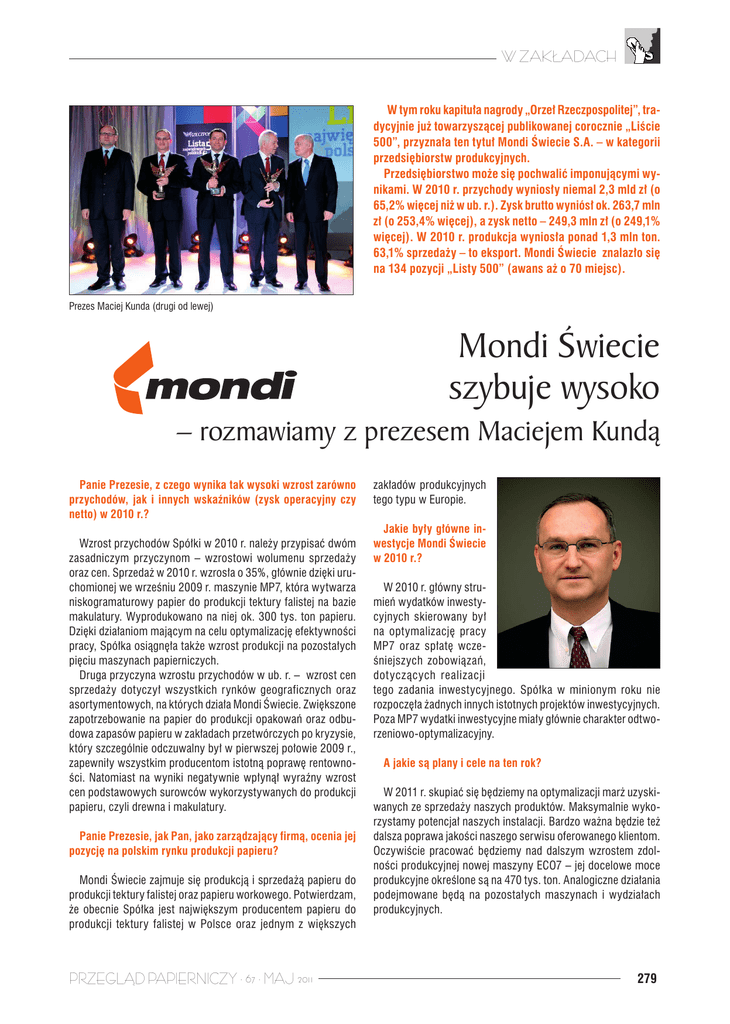 W ZAKŁADACH W tym roku kapituła nagrody „Orzeł Rzeczpospolitej”, tradycyjnie już towarzyszącej publikowanej corocznie „Liście 500”, przyznała ten tytuł Mondi Świecie S.A. – w kategorii przedsiębiorstw produkcyjnych. Przedsiębiorstwo może się pochwalić imponującymi wynikami. W 2010 r. przychody wyniosły niemal 2,3 mld zł (o 65,2% więcej niż w ub. r.). Zysk brutto wyniósł ok. 263,7 mln zł (o 253,4% więcej), a zysk netto – 249,3 mln zł (o 249,1% więcej). W 2010 r. produkcja wyniosła ponad 1,3 mln ton. 63,1% sprzedaży – to eksport. Mondi Świecie znalazło się na 134 pozycji „Listy 500” (awans aż o 70 miejsc). Prezes Maciej Kunda (drugi od lewej) Mondi Świecie szybuje wysoko – rozmawiamy z prezesem Maciejem Kundą Panie Prezesie, z czego wynika tak wysoki wzrost zarówno przychodów, jak i innych wskaźników (zysk operacyjny czy netto) w 2010 r.? Wzrost przychodów Spółki w 2010 r. należy przypisać dwóm zasadniczym przyczynom – wzrostowi wolumenu sprzedaży oraz cen. Sprzedaż w 2010 r. wzrosła o 35%, głównie dzięki uruchomionej we wrześniu 2009 r. maszynie MP7, która wytwarza niskogramaturowy papier do produkcji tektury falistej na bazie makulatury. Wyprodukowano na niej ok. 300 tys. ton papieru. Dzięki działaniom mającym na celu optymalizację efektywności pracy, Spółka osiągnęła także wzrost produkcji na pozostałych pięciu maszynach papierniczych. Druga przyczyna wzrostu przychodów w ub. r. – wzrost cen sprzedaży dotyczył wszystkich rynków geograficznych oraz asortymentowych, na których działa Mondi Świecie. Zwiększone zapotrzebowanie na papier do produkcji opakowań oraz odbudowa zapasów papieru w zakładach przetwórczych po kryzysie, który szczególnie odczuwalny był w pierwszej połowie 2009 r., zapewniły wszystkim producentom istotną poprawę rentowności. Natomiast na wyniki negatywnie wpłynął wyraźny wzrost cen podstawowych surowców wykorzystywanych do produkcji papieru, czyli drewna i makulatury. Panie Prezesie, jak Pan, jako zarządzający firmą, ocenia jej pozycję na polskim rynku produkcji papieru? Mondi Świecie zajmuje się produkcją i sprzedażą papieru do produkcji tektury falistej oraz papieru workowego. Potwierdzam, że obecnie Spółka jest największym producentem papieru do produkcji tektury falistej w Polsce oraz jednym z większych PRZEGLĄD PAPIERNICZY · 67 · MAJ 2011 zakładów produkcyjnych tego typu w Europie. Jakie były główne inwestycje Mondi Świecie w 2010 r.? W 2010 r. główny strumień wydatków inwestycyjnych skierowany był na optymalizację pracy MP7 oraz spłatę wcześniejszych zobowiązań, dotyczących realizacji tego zadania inwestycyjnego. Spółka w minionym roku nie rozpoczęła żadnych innych istotnych projektów inwestycyjnych. Poza MP7 wydatki inwestycyjne miały głównie charakter odtworzeniowo-optymalizacyjny. A jakie są plany i cele na ten rok? W 2011 r. skupiać się będziemy na optymalizacji marż uzyskiwanych ze sprzedaży naszych produktów. Maksymalnie wykorzystamy potencjał naszych instalacji. Bardzo ważna będzie też dalsza poprawa jakości naszego serwisu oferowanego klientom. Oczywiście pracować będziemy nad dalszym wzrostem zdolności produkcyjnej nowej maszyny ECO7 – jej docelowe moce produkcyjne określone są na 470 tys. ton. Analogiczne działania podejmowane będą na pozostałych maszynach i wydziałach produkcyjnych. 279 W ZAKŁADACH Strategicznym obszarem działalności Spółki jest dostęp do podstawowych surowców – drewna i makulatury. Spółka będzie podejmowała działania mające na celu długoterminowe kontraktowanie zakupów drewna od głównego dostawcy, jakim są Lasy Państwowe, co powinno zapewnić większą stabilność dostaw surowca. Równocześnie kontynuować będziemy prace nad dywersyfikacją źródeł dostaw drewna i makulatury oraz działania zmierzające do wzrostu pozyskania makulatury w kraju. Zintensyfikujemy lobbing legislacyjny w tym zakresie. Wiele wysiłku w bieżącym roku poświęcimy też usprawnianiu organizacji pracy, tak, aby nasi pracownicy odczuwali coraz więcej satysfakcji, co niewątpliwie przyniesie pozytywne efekty. Jaką pozycję zajmuje spółka Mondi Świecie wśród pozostałych polskich spółek grupy Mondi? Mondi Świecie jest największą ze spółek grupy Mondi działających w Polsce. Poza naszą Spółką, w Polsce działa pięć kartonażowni (Świecie, Mszczonów, Szczecin, Bystrzyca i Dorohusk), trzy workownie (Świecie, Mielec i Wierzbica) oraz producent elastycznych opakowań jednowarstwowych w Solcu. Zapotrzebowanie polskich spółek z grupy Mondi na papier do produkcji tektury falistej oraz papier workowy zaspokajane jest w głównej mierze przez Mondi Świecie SA. Jednocześnie jesteśmy największym producentem papieru do produkcji tektury falistej w grupie Mondi. Panie Prezesie, serdecznie gratulujemy wyróżnienia, jakim nagrodzono Mondi Świecie S.A. – „Orzeł Rzeczpospolitej 2010” dla najlepszej spółki produkcyjnej z „Listy 500”. Co odczuwa Prezes nagrodzonej firmy? Jest to dla mnie wielka satysfakcja i olbrzymia radość, że nasze wysiłki i osiągnięcia zyskały uznanie i zostały docenione tak prestiżową nagrodą. Pragnę jednocześnie serdecznie podziękować i pogratulować wszystkim Pracownikom Mondi Świecie S.A. Ta nagroda to przede wszystkim Wasz sukces, to dowód uznania za Wasz profesjonalizm i zaangażowanie. Pracownicy Mondi Świecie S.A. są rzeczywiście „Orłami Rzeczpospolitej”. J.K. Mondi Świecie S.A. awarded with “the Eagles of Rzeczpospolita Statuatte” – an interview with chairman Maciej Kunda How can you explain such impressive upturn in revenues and other results including operating and net profits in 2010? An increase in revenues can be attributed to higher deliveries and sales prices. The firm increased its sales by 35% due to the new recycled containerboard PM7 started up in September 200