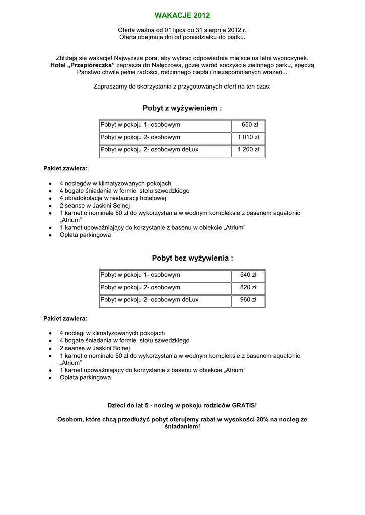 WAKACJE 2012 Oferta ważna od 01 lipca do 31 sierpnia 2012 r. Oferta obejmuje dni od poniedziałku do piątku. Zbliżają się wakacje! Najwyższa pora, aby wybrać odpowiednie miejsce na letni wypoczynek. Hotel „Przepióreczka” zaprasza do Nałęczowa, gdzie wśród soczyście zielonego parku, spędzą Państwo chwile pełne radości, rodzinnego ciepła i niezapomnianych wrażeń... Zapraszamy do skorzystania z przygotowanych ofert na ten czas: Pobyt z wyżywieniem : Pobyt w pokoju 1- osobowym 650 zł Pobyt w pokoju 2- osobowym 1 010 zł Pobyt w pokoju 2- osobowym deLux 1 200 zł Pakiet zawiera: 4 noclegów w klimatyzowanych pokojach 4 bogate śniadania w formie stołu szwedzkiego 4 obiadokolacje w restauracji hotelowej 2 seanse w Jaskini Solnej 1 karnet o nominale 50 zł do wykorzystania w wodnym kompleksie z basenem aquatonic „Atrium” 1 karnet upoważniający do korzystanie z basenu w obiekcie „Atrium” Opłata parkingowa Pobyt bez wyżywienia : Pobyt w pokoju 1- osobowym 540 zł Pobyt w pokoju 2- osobowym 820 zł Pobyt w pokoju 2- osobowym deLux 960 zł Pakiet zawiera: 4 noclegi w klimatyzowanych pokojach 4 bogate śniadania w formie stołu szwedzkiego 2 seanse w Jaskini Solnej 1 karnet o nominale 50 zł do wykorzystania w wodnym kompleksie z basenem aquatonic „Atrium” 1 karnet upoważniający do korzystanie z basenu w obiekcie „Atrium” Opłata parkingowa Dzieci do lat 5 - nocleg w pokoju rodziców GRATIS! Osobom, które chcą przedłużyć pobyt oferujemy rabat w wysokości 20% na nocleg ze śniadaniem! Dodatkowe atrakcje w Nałęczowie*: Centrum SPA w Zespole Basenowym: basen, sauna sucha i mokra, łóżka bąbelkowe, gejzery i rzeki wodne oraz basen białej glinki, masaże i zabieg lecznicze możliwość korzystanie z zabiegów kosmetycznych w Salonie Kosmetyki „Beauty” plac zabaw dla dzieci zlokalizowany przy hotelu seanse dla dzieci w jaskini solnej możliwość korzystanie z masaży w Salonie Masażu przejażdżki bryczką po Nałęczowie przejażdżki jeepem po okolicach Nałęczowa możliwość wypożyczenia rowerów i skuterów spacery po Parku Zdrojowym zwiedzanie muzeów: Muzeum St. Żeromskiego i Muzeum B. Prusa wycieczki do Kazimierza Dolnego (23 km) – rejs statkiem po Wiśle, spacery wąwozami kazimierskimi, zwiedzanie Rynku wycieczki do Lublina (25 km) – Deptak, Zamek Lubelski z kaplicą Trójcy Św., Ogród Botaniczny, Muzeum Wsi Lubelski Polecamy także zwiedzanie: Pałacu Zamoyskich w Kozłówce, Pałacu Książąt Czartoryskich w Puławach oraz Muzeum Jana Kochanowskiego w Czarnolesie * usługi płatne we własnym zakresie Hotel Przepióreczka, ul. 1-go Maja 6, 24-150 Nałęczów Recepcja: tel. 81 501 41 29 fax 81 501 61 65 kom. 696 056 322 e-mail: [email protected]