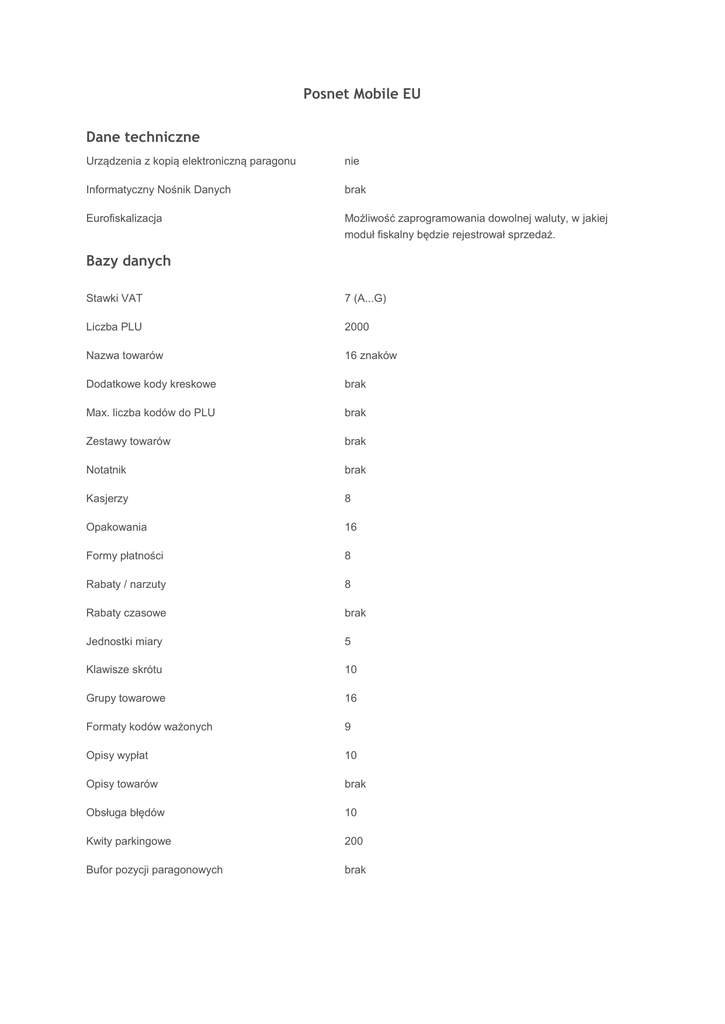 Posnet Mobile EU Dane techniczne Bazy danych
